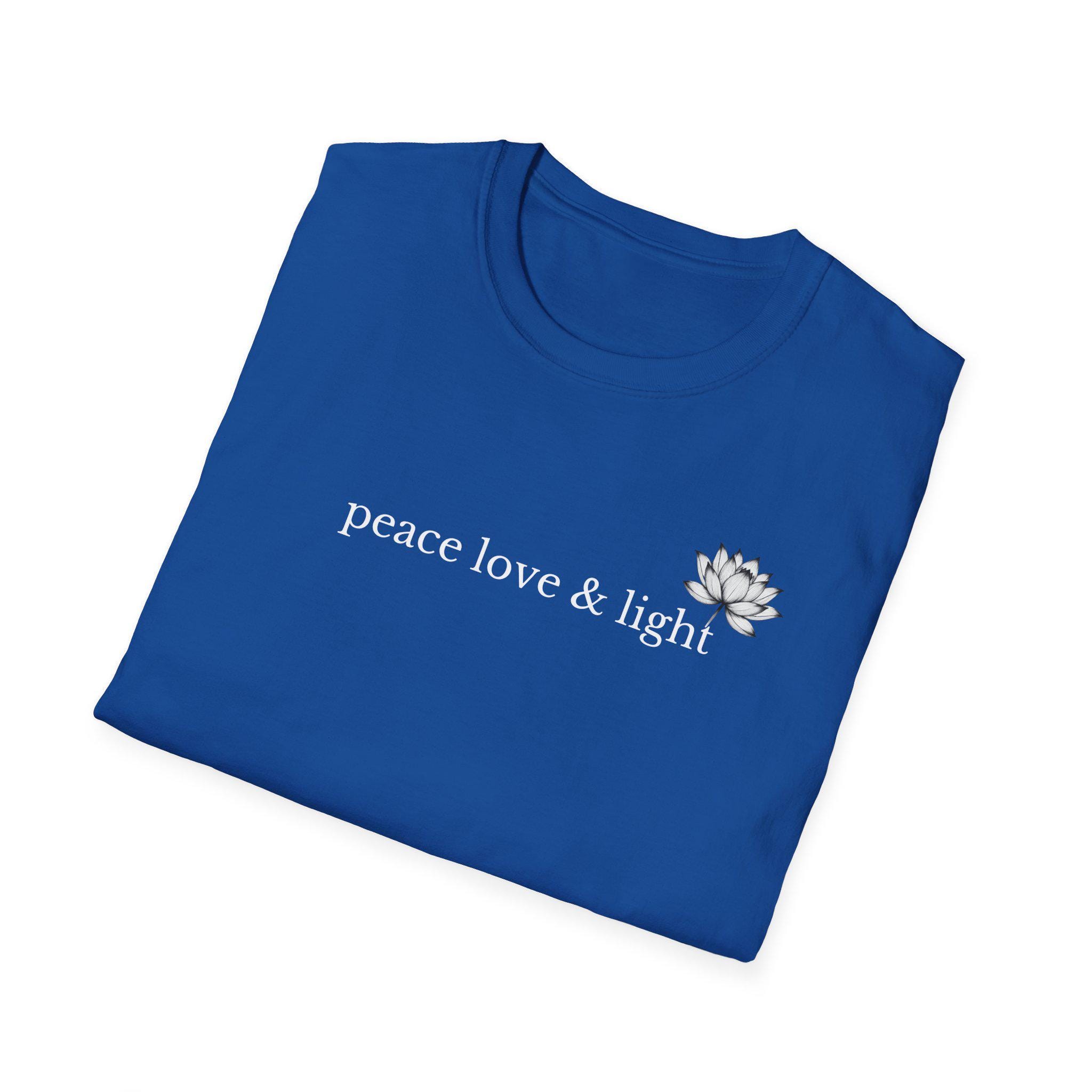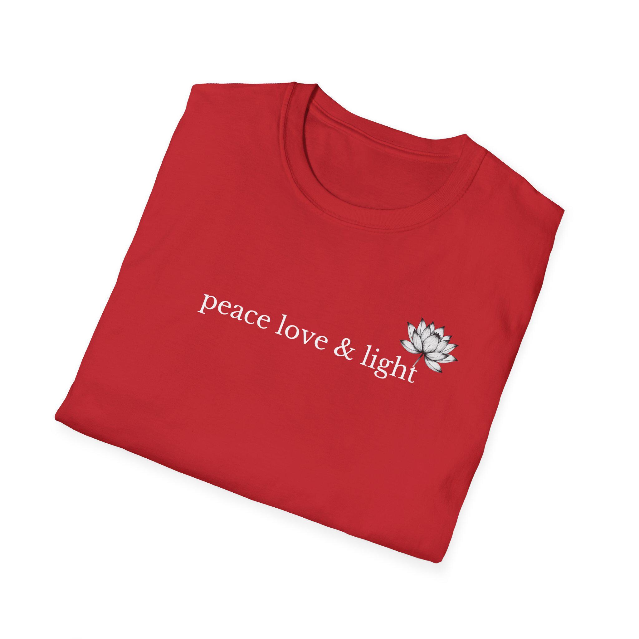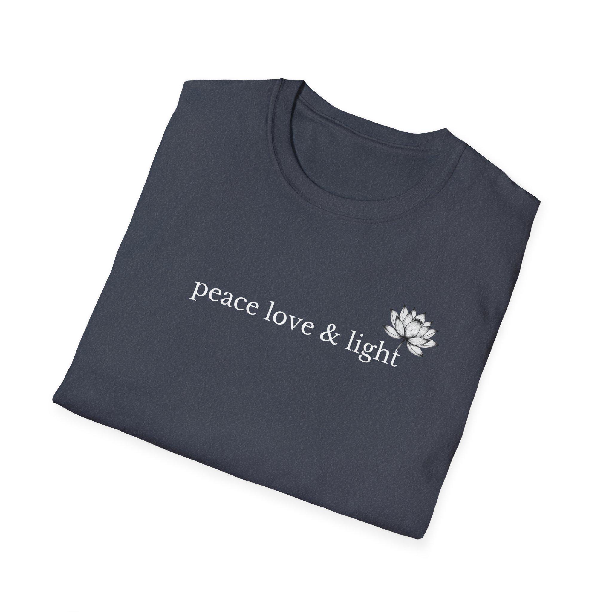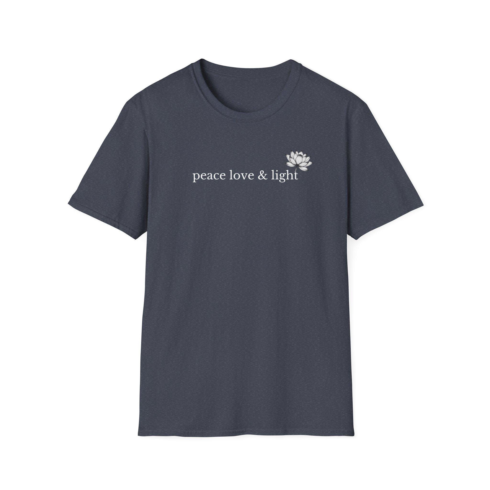 This lightweight cotton tee carries a quiet, hopeful message—peace, love, and light—rendered simply so the sentiment can shine.