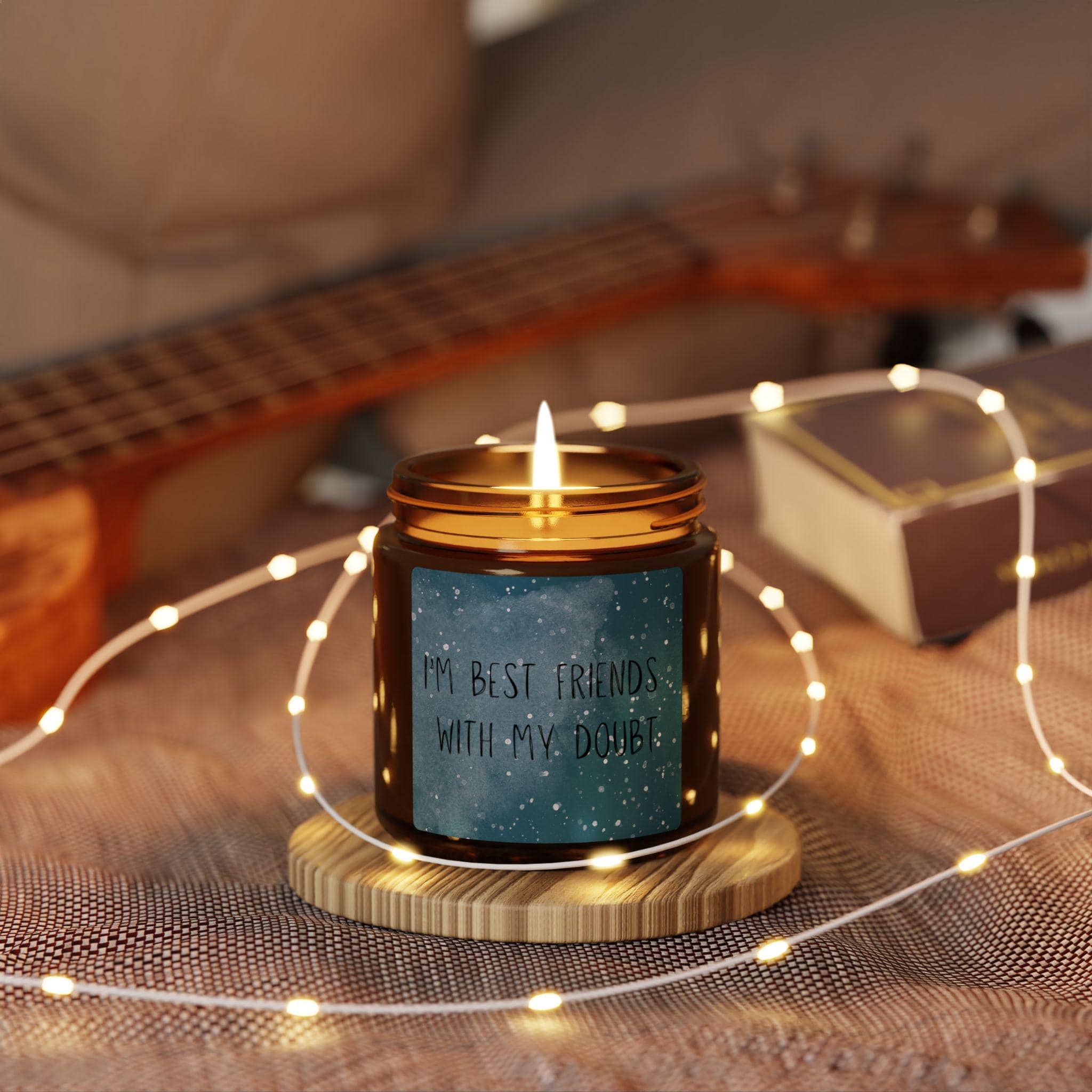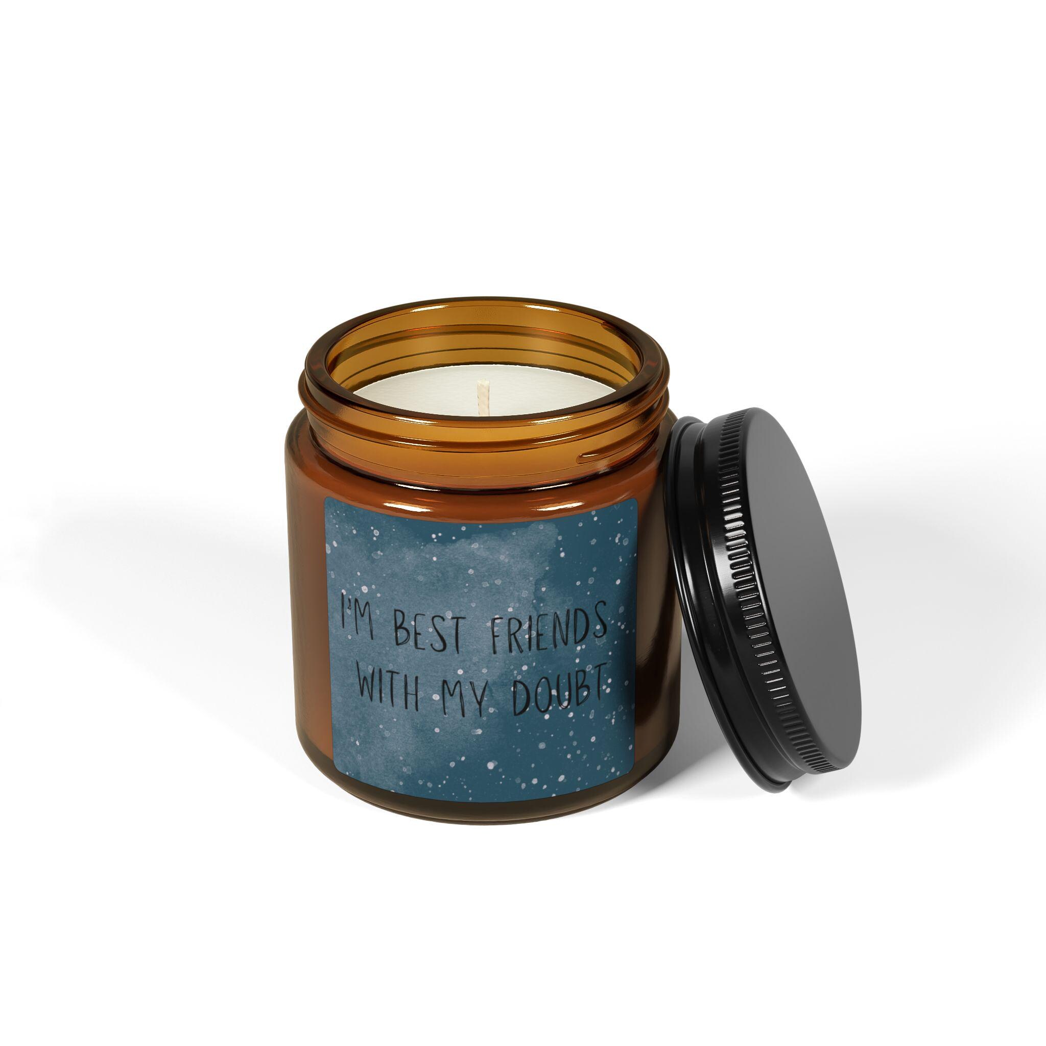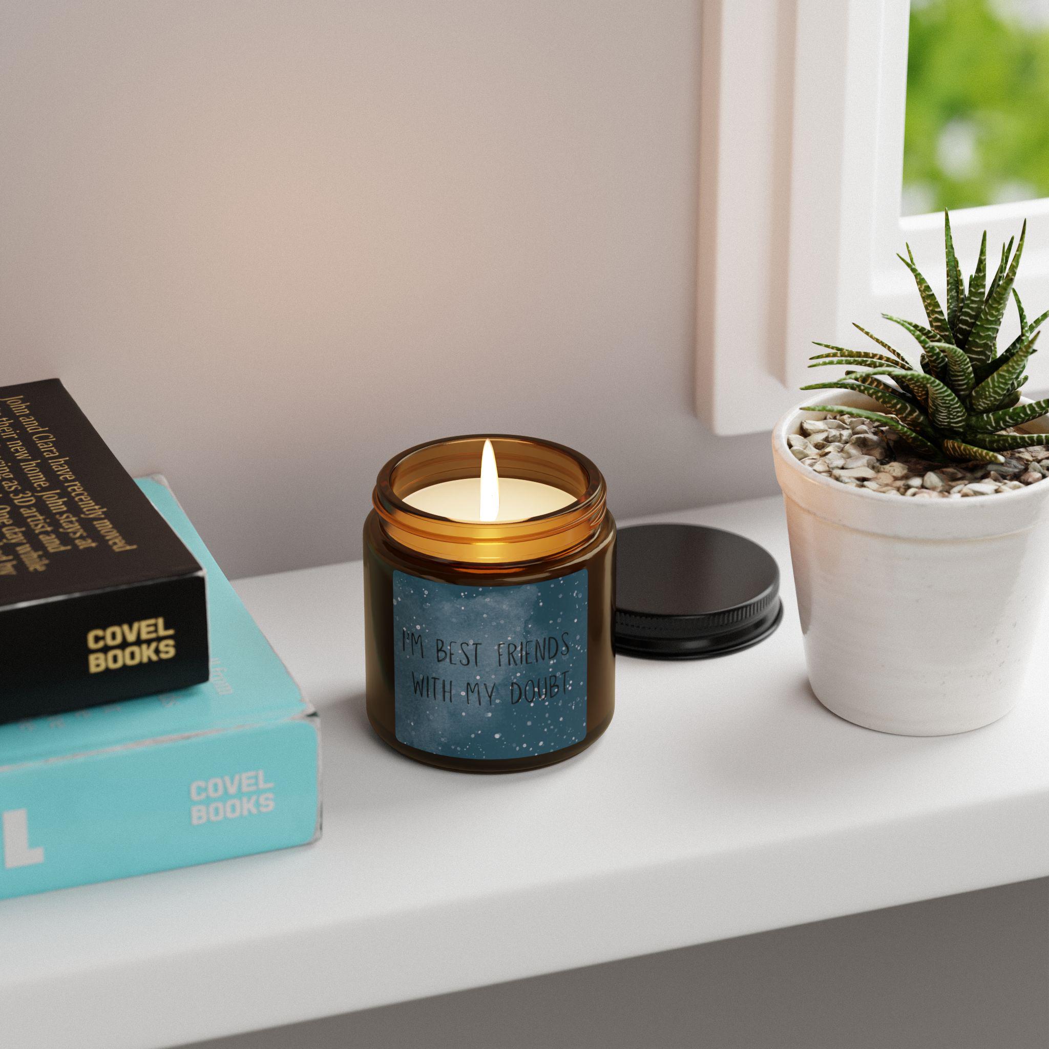 Warning: May cause spontaneous relaxation. Warm amber glass. A clean, eco-conscious soy candle with a quiet presence and six carefully blended scent options — from spice-and-fireplace warmth to cool white sage and lavender. Light it to slow the day: the crackle of imagined embers, citrus-bright top notes, or creamy coconut and cardamom filling a small room. The candle pours a soft, steady glow and comes in a reusable jar you can wash and repurpose as simple decor. Made with a 100% cotton wick and natural soy wax, assembled in the USA to ASTM safety standards. Select Unscented when you want light without fragrance, or choose one of the five aromatic blends to set a mood.