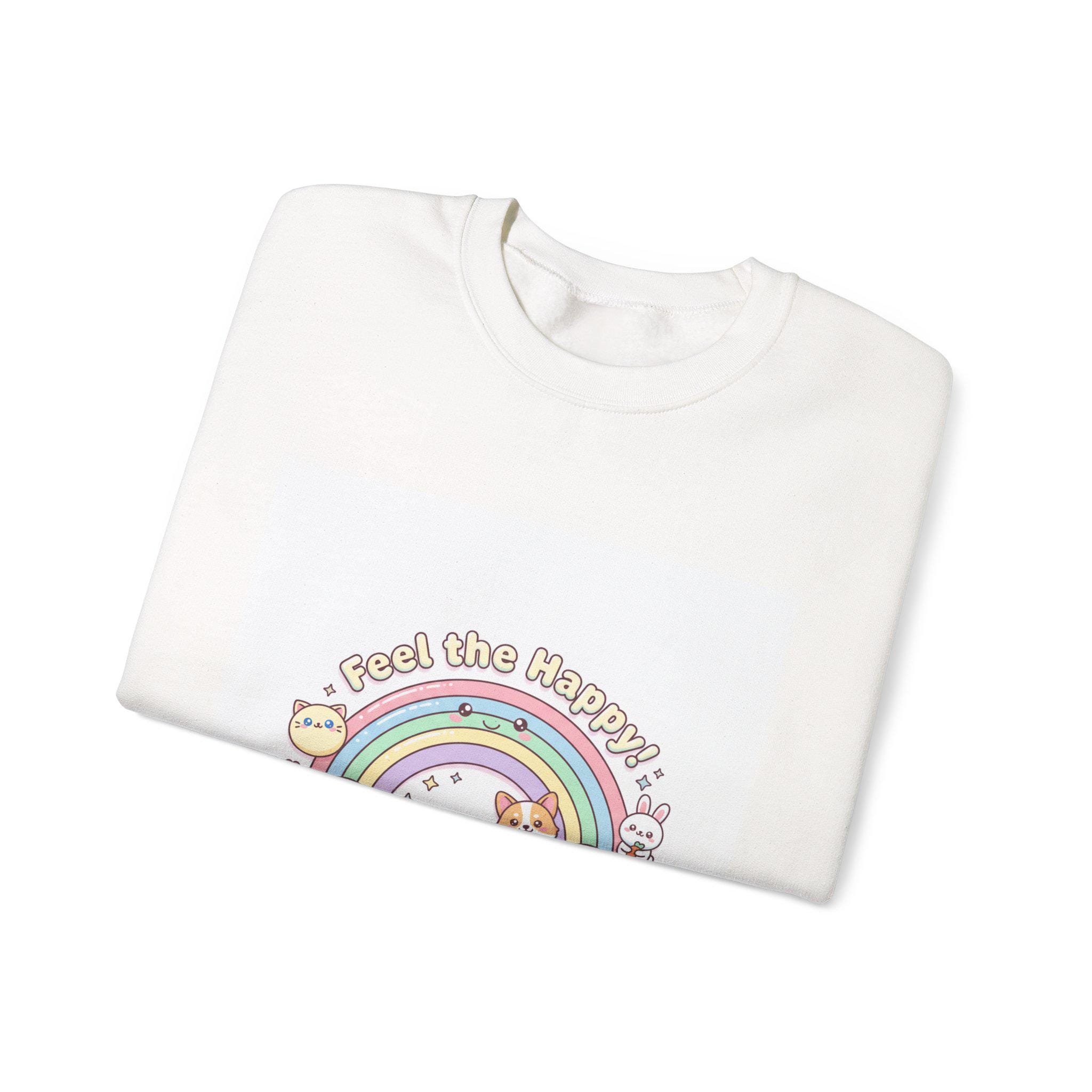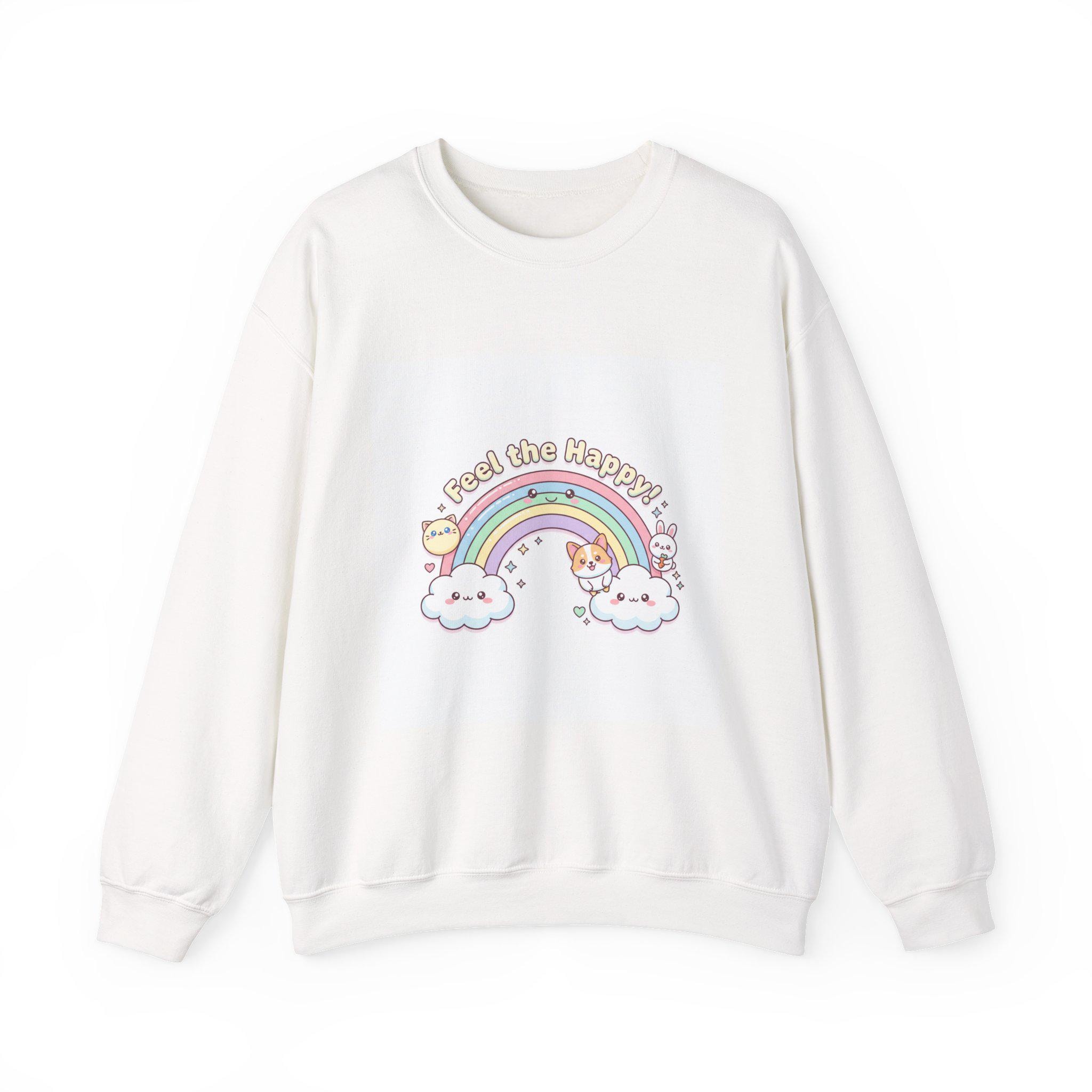 Joyful pastel rainbow crewneck with kawaii-inspired characters and glossy, rounded lettering. The front artwork shows a soft candy-colored rainbow arching between smiling clouds with tiny character faces, finished in embroidery or DTG for crisp, playful detail—a cheerful, Y2K-flavored cutecore piece that reads as collectible wearable art. The light palette and simplified characters match the Cutecore/Kawaii Revival vocabulary, giving a nostalgic, upbeat vibe that layers easily under jackets or pairs with casual skirts and jeans.