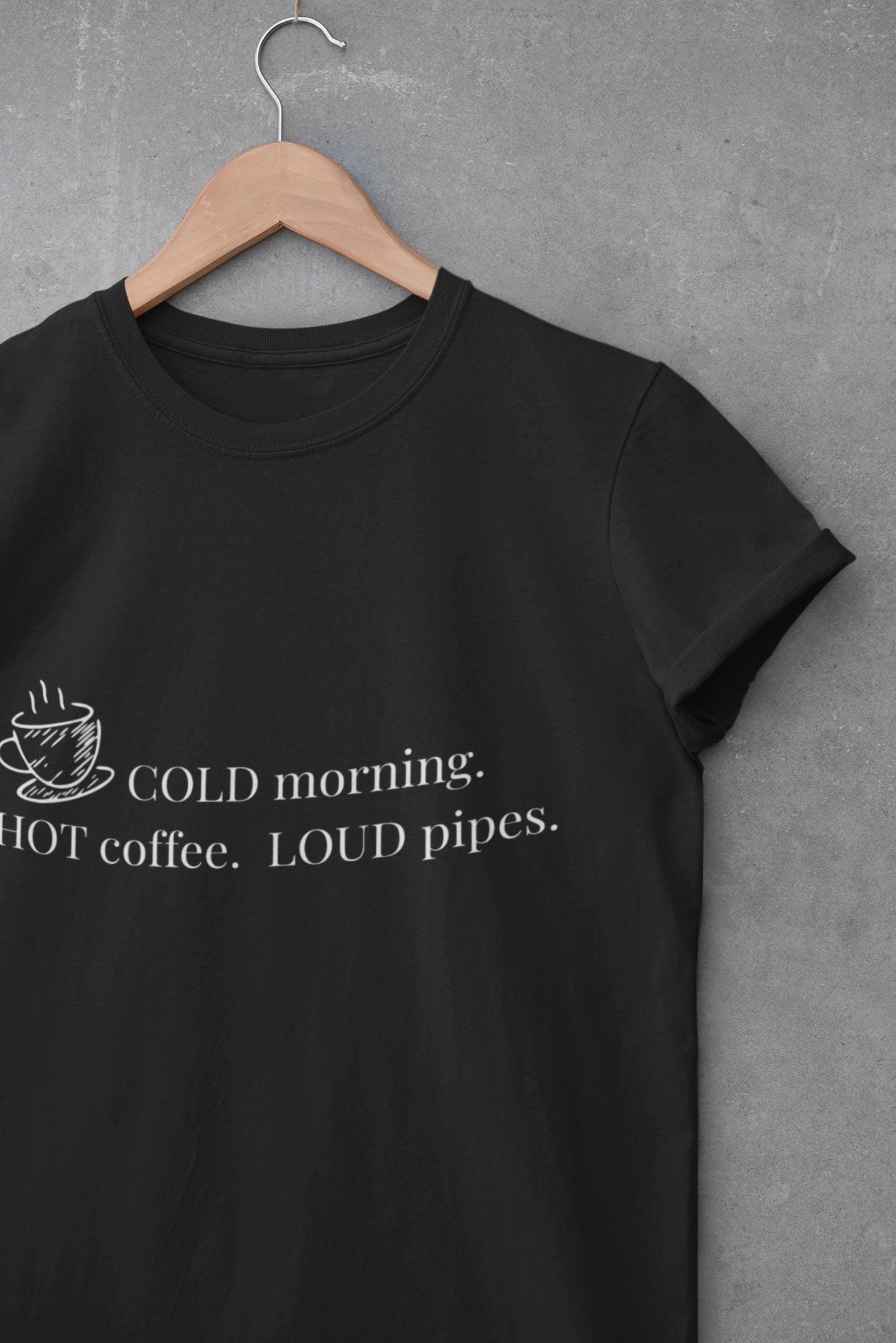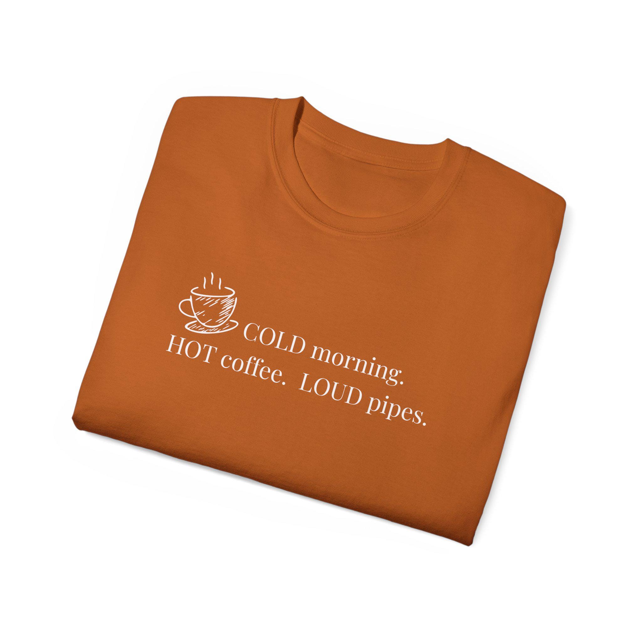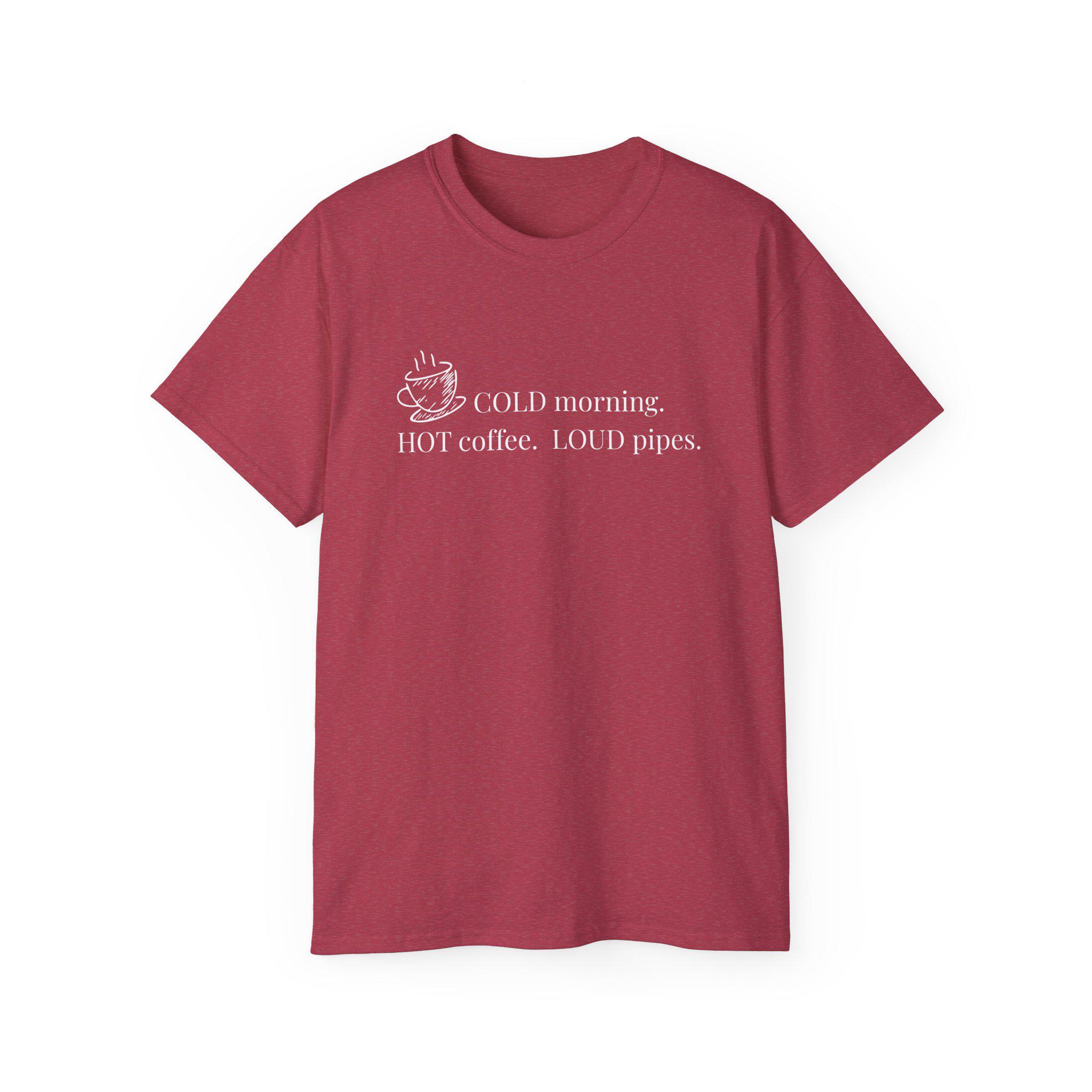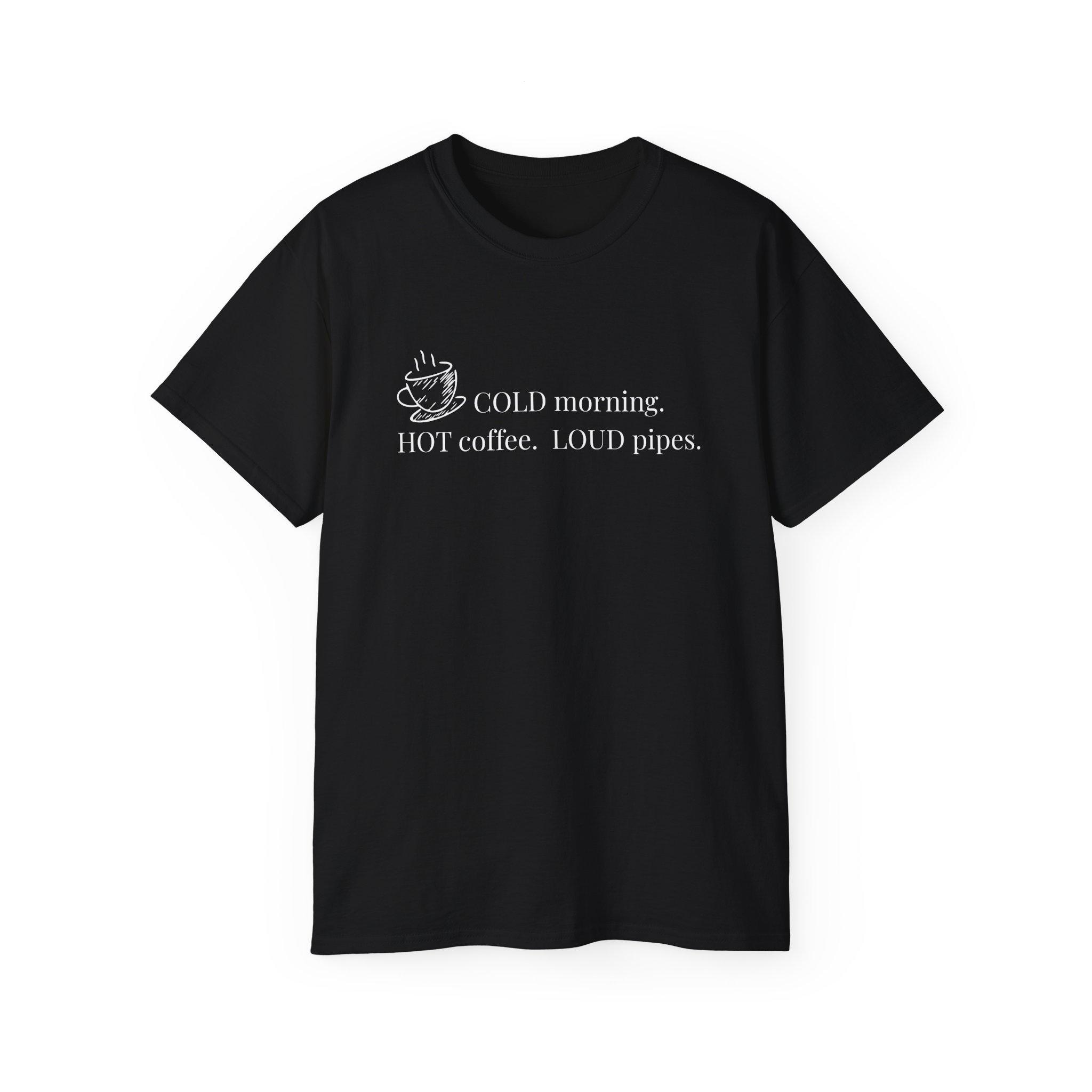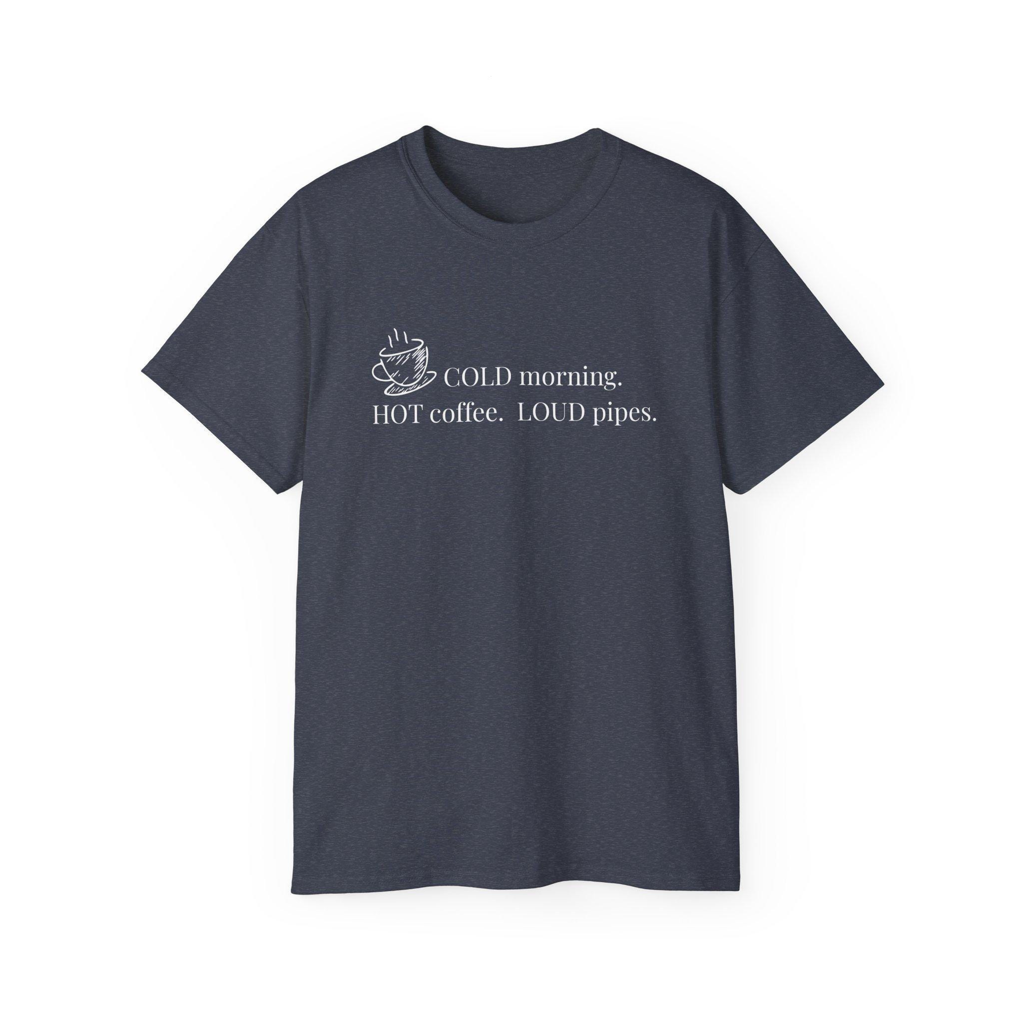 A lived-in, comforting tee for people who start their day with a strong brew and a clear routine. Soft, slightly vintage-feeling cotton drapes with relaxed room across the chest and shoulders, letting you sip coffee, tend gear, or roll up your sleeves without fuss. The front print — a small steaming cup and the line “COLD morning. HOT coffee. LOUD pipes.” — reads like a private joke that travels well: wry, straightforward, and a little loud. Wear it layered under a flannel during crisp mornings, or as your at-home go-to when the world is slow and your coffee is not. It’s breathable for all-season wear, made from ethically sourced U.S. cotton, and built to hold shape and color through many washes so the message stays honest.
