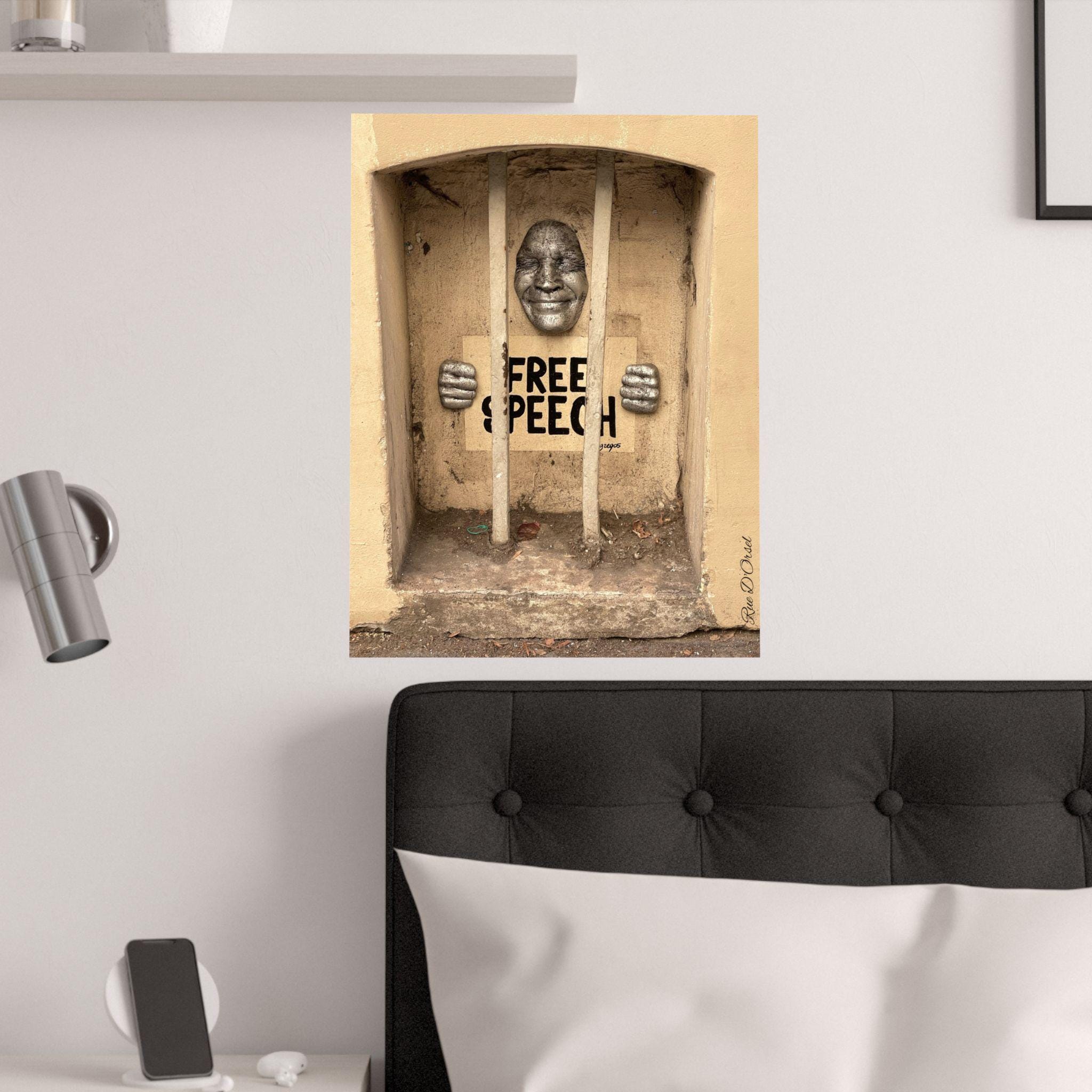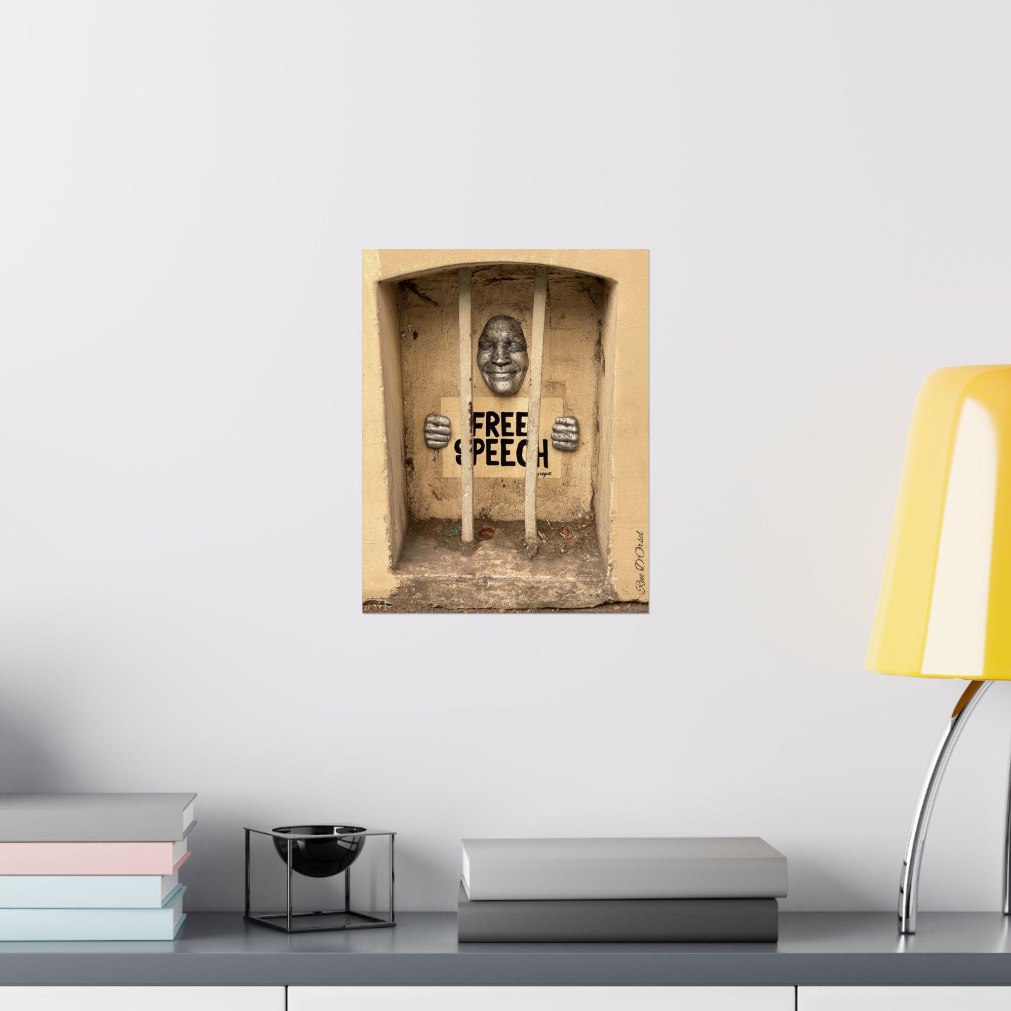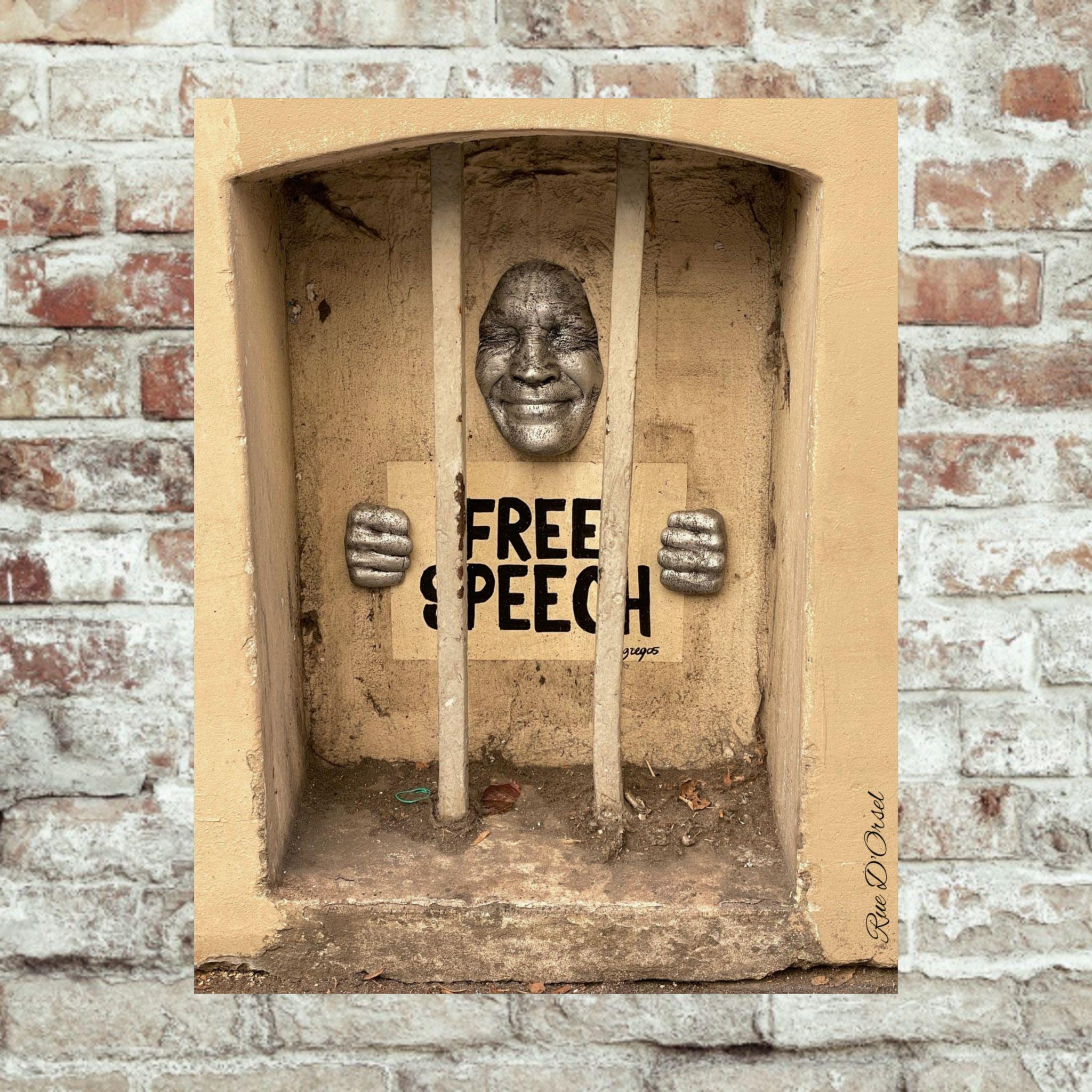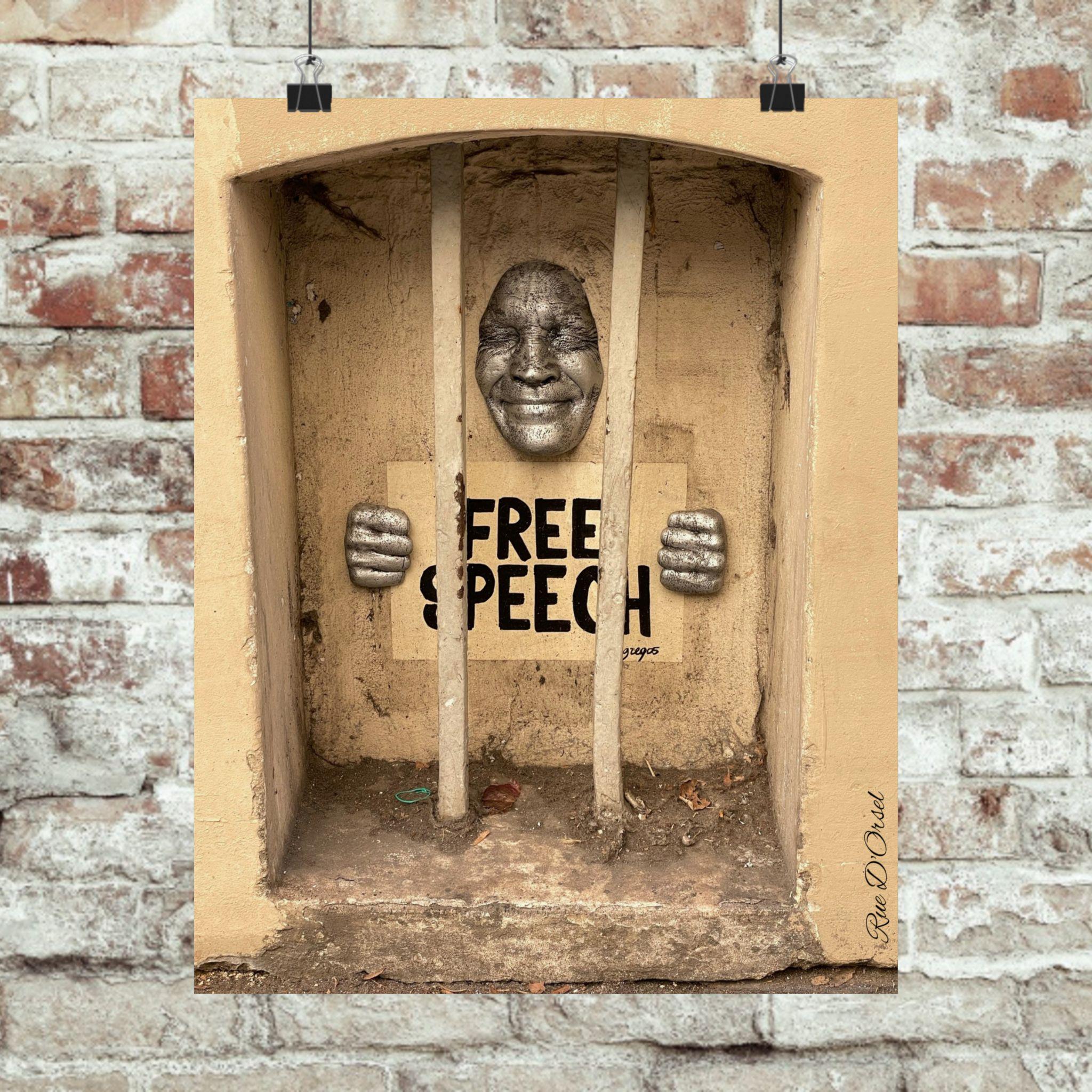 Overall, the image conveys a strong political and symbolic message, contrasting the idea of “free speech” with visual elements of confinement and restriction.
