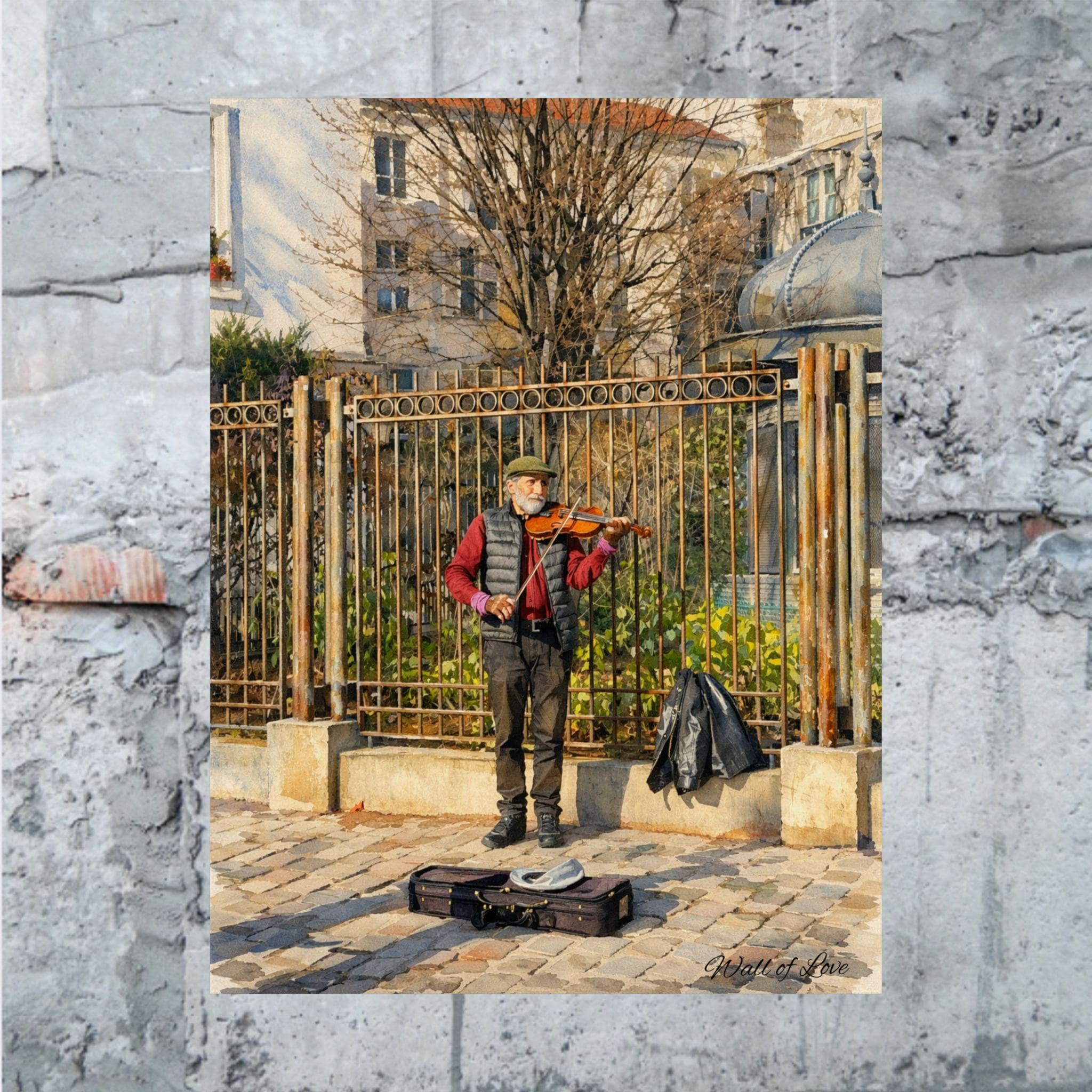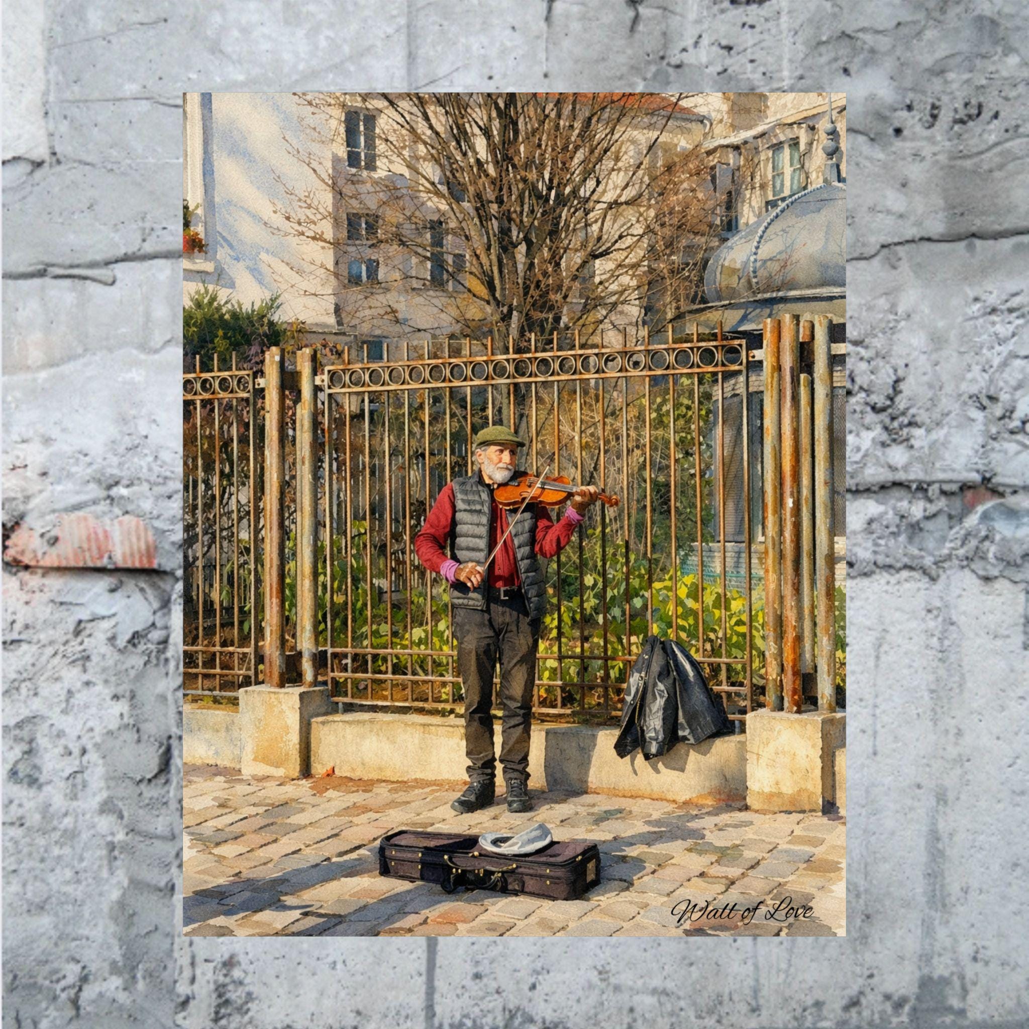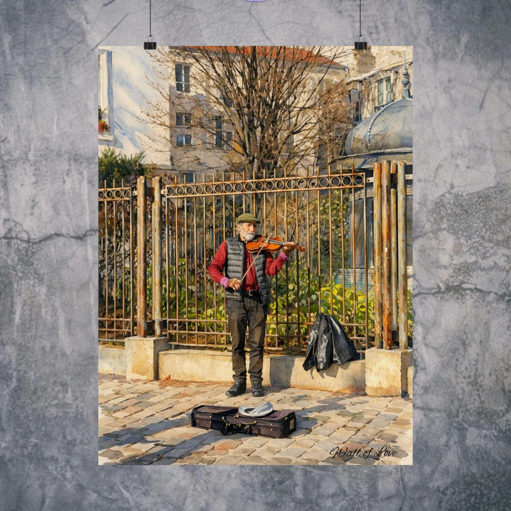 A watercolor moment from Montmartre, printed on satin-finish poster paper. This image captures a Parisian fiddler (violinist) playing outside the Wall of Love at Place des Abbesses, the warm brushstrokes and gentle washes preserving the street’s easy romance. The low-glare satin surface keeps the colors soft yet vibrant, so the reds of the musician’s scarf and the faded tones of the surrounding buildings retain their painterly depth. Hang it in an entryway, above a piano, or in a sunlit corner to summon the feeling of cobblestones underfoot and evening light folding over Sacré‑Cœur.