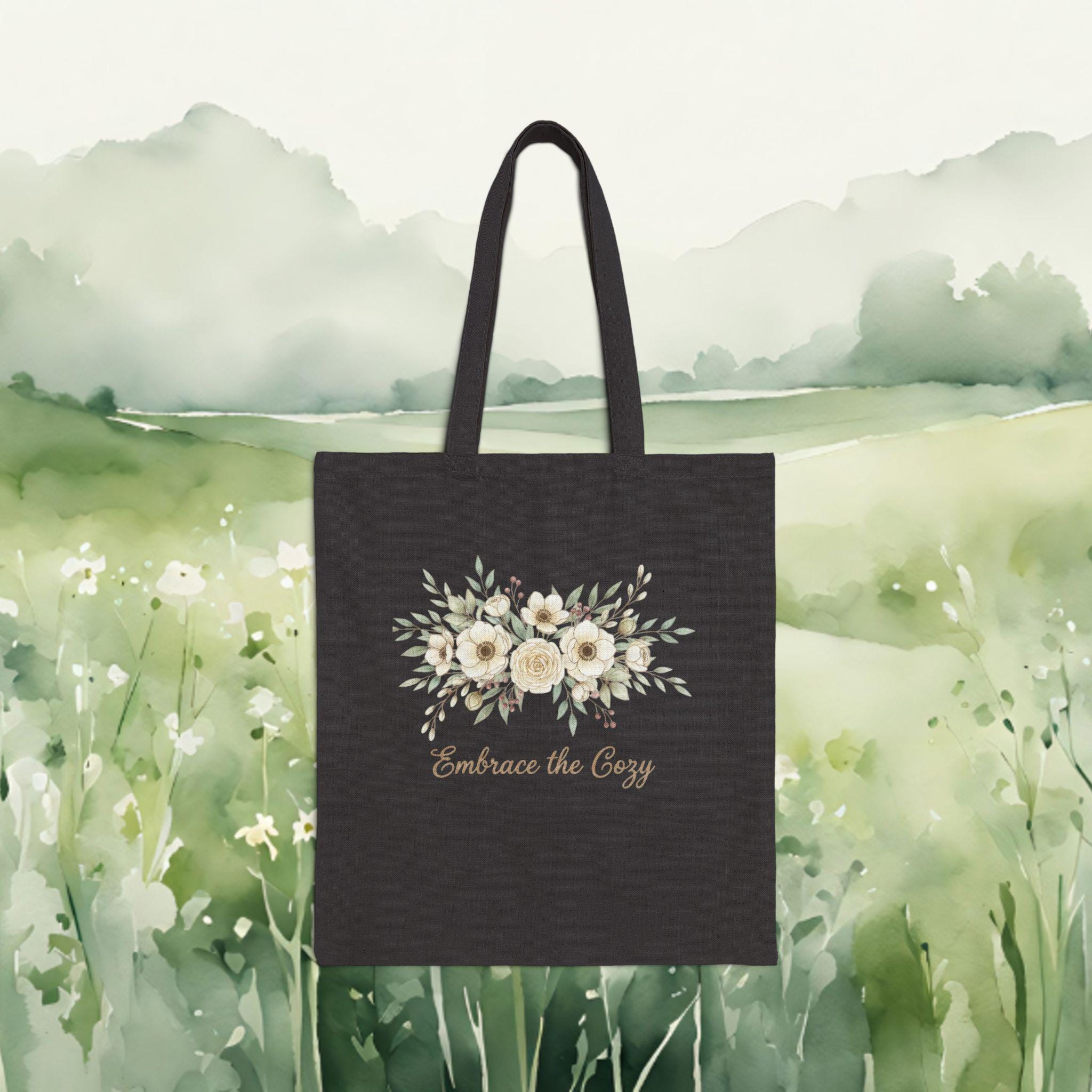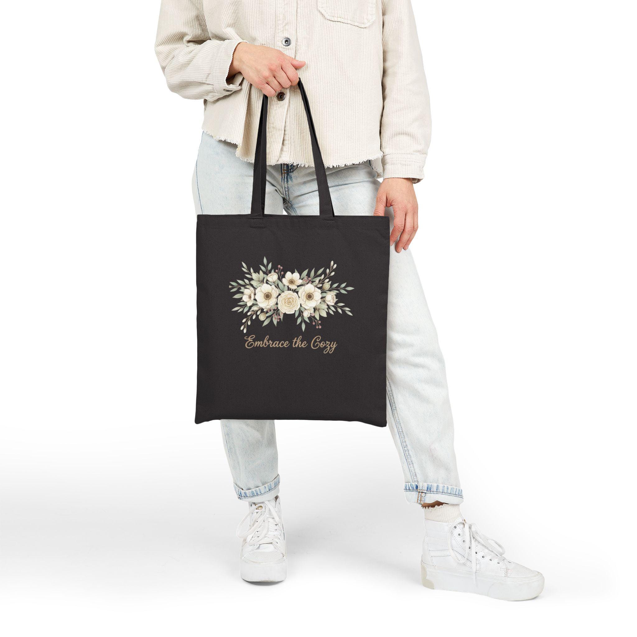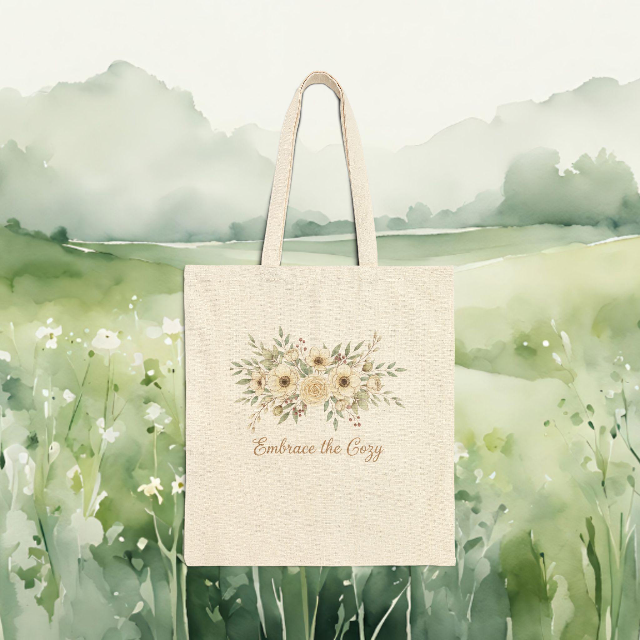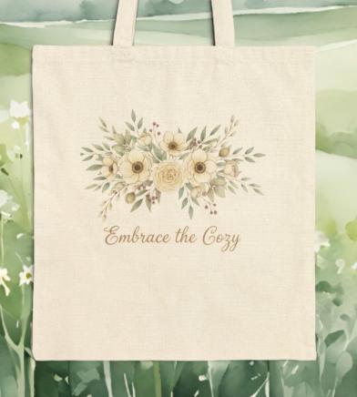 A soft, hand-drawn winter floral motif sits subtly on natural cotton canvas, evoking cottagecore winter vibes with delicate linework and muted berry and sage tones. The understated botanical cluster and vintage-style script feel pastoral and gentle, blending easily with cozy wardrobes or nature-inspired decor. Quietly rustic and seasonal, it reads as a cozy botanical accent for everyday use by nature romantics and homebodies.