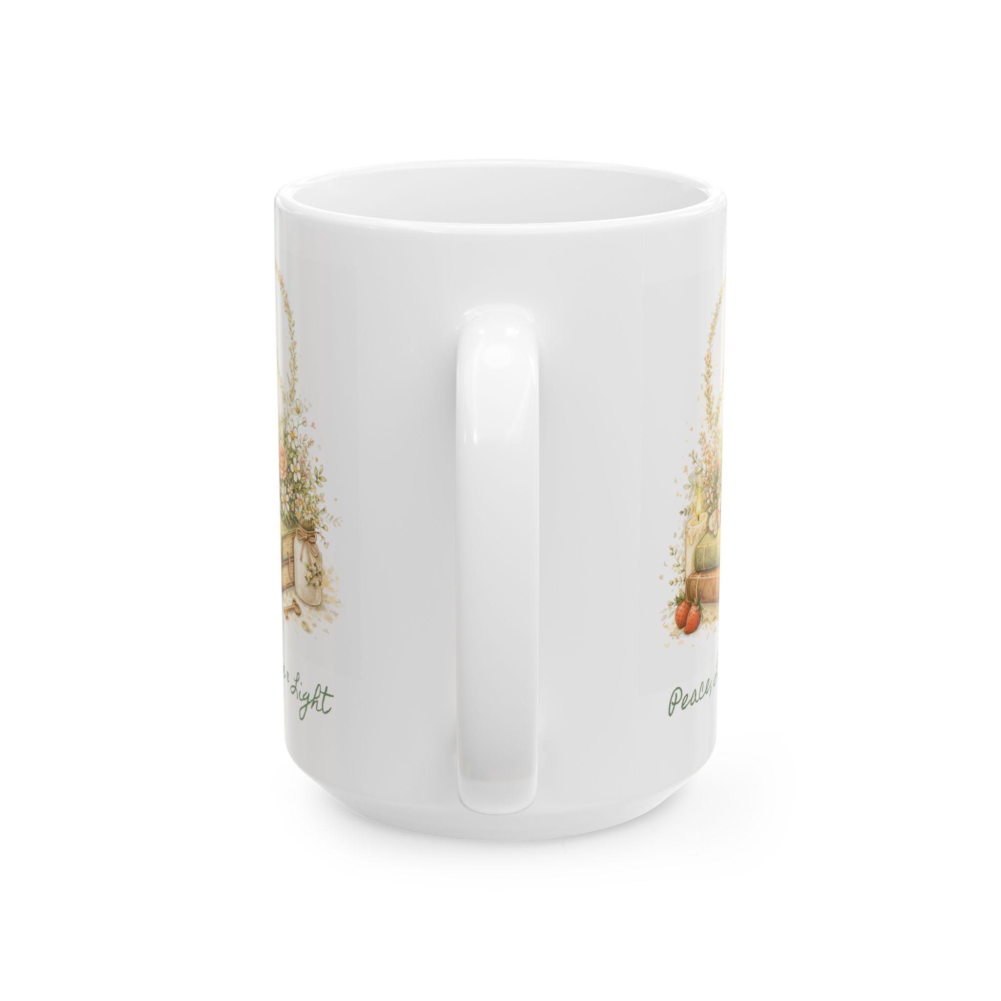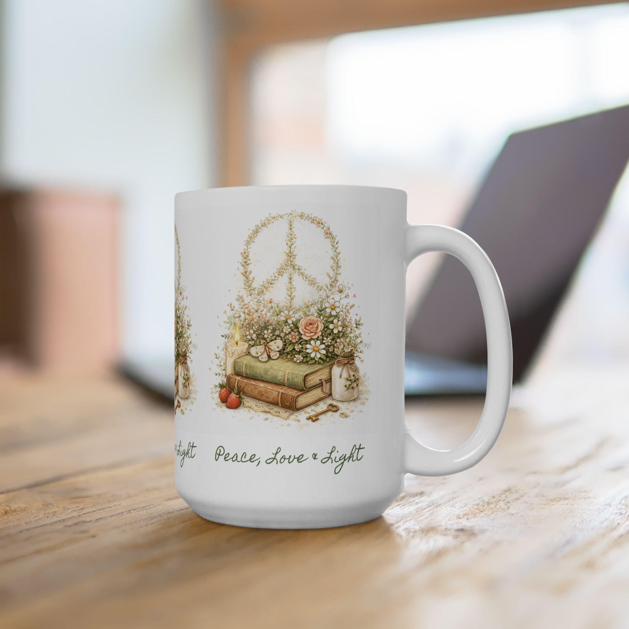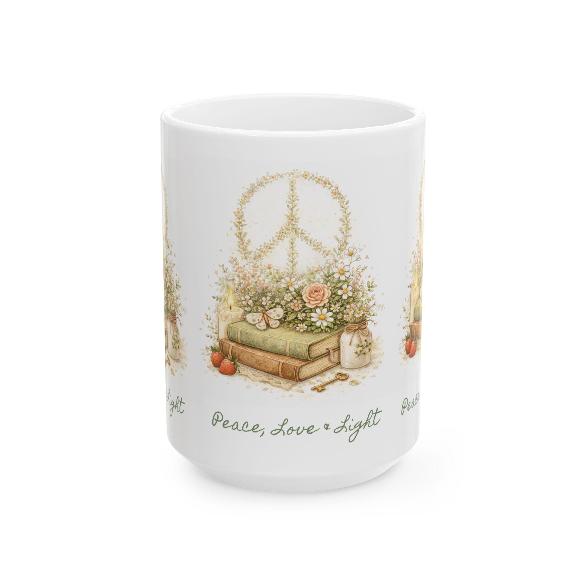 Peace, Love & Light 15 oz ceramic mug. - Cottagecore Design