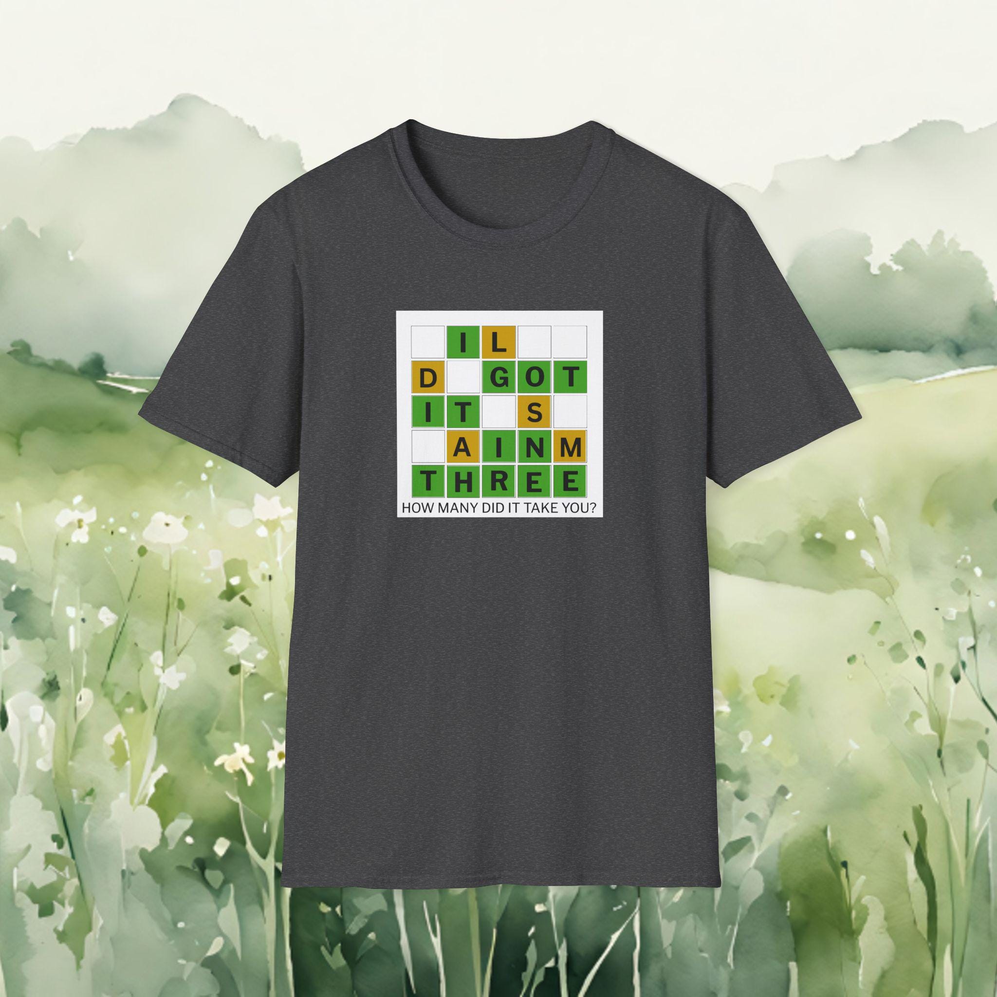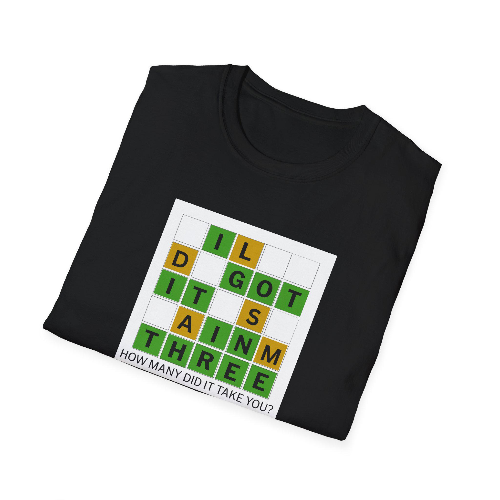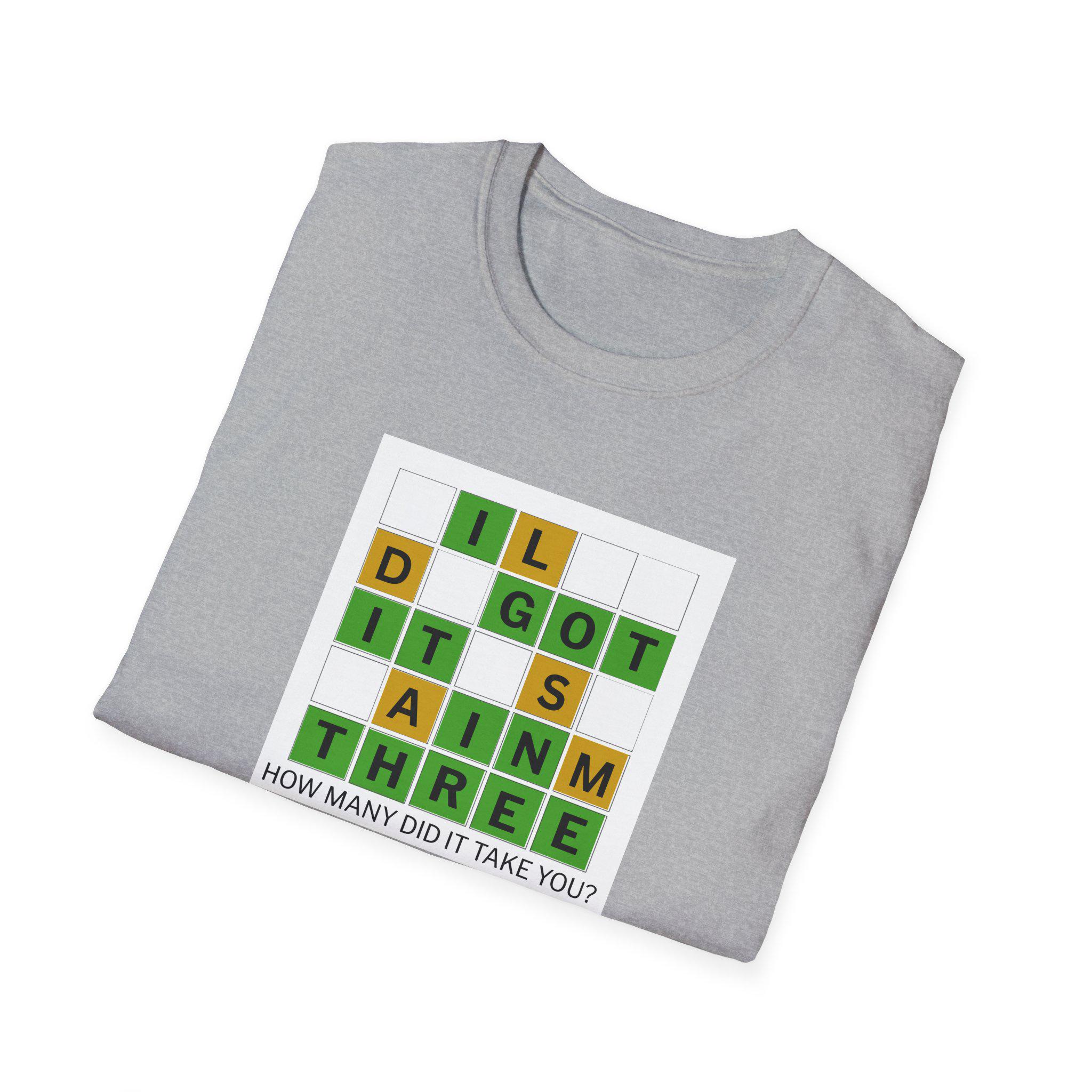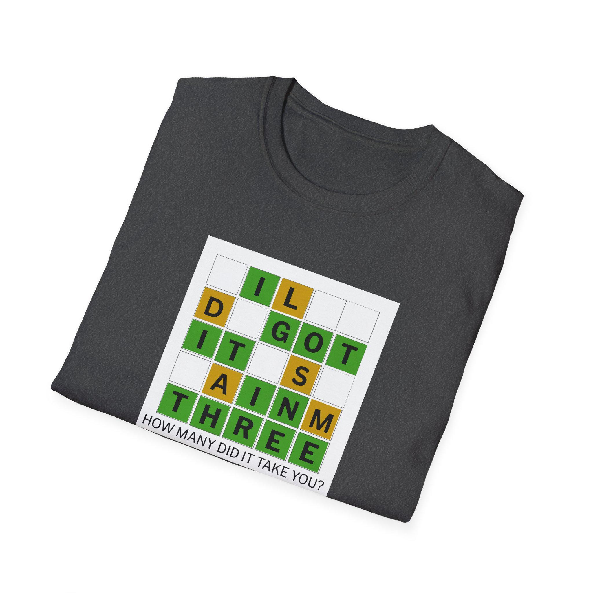 This soft, lightweight tee brings a cheeky, brain-teaser vibe to everyday wear. The front features a colorful word-grid design with the phrase “I GOT IT IN THREE” and the small caption: “HOW MANY DID IT TAKE YOU?” It reads like a playful puzzle—great for people who love word games, trivia nights, and casual conversations. The shirt’s smooth ring-spun cotton feels breathable and gentle against skin, while the classic crew neck and clean fit make it easy to layer under a jacket or wear on its own. Wear it to game nights, puzzle meetups, weekend coffee runs, or whenever you want to spark a smile and a quick challenge among friends.