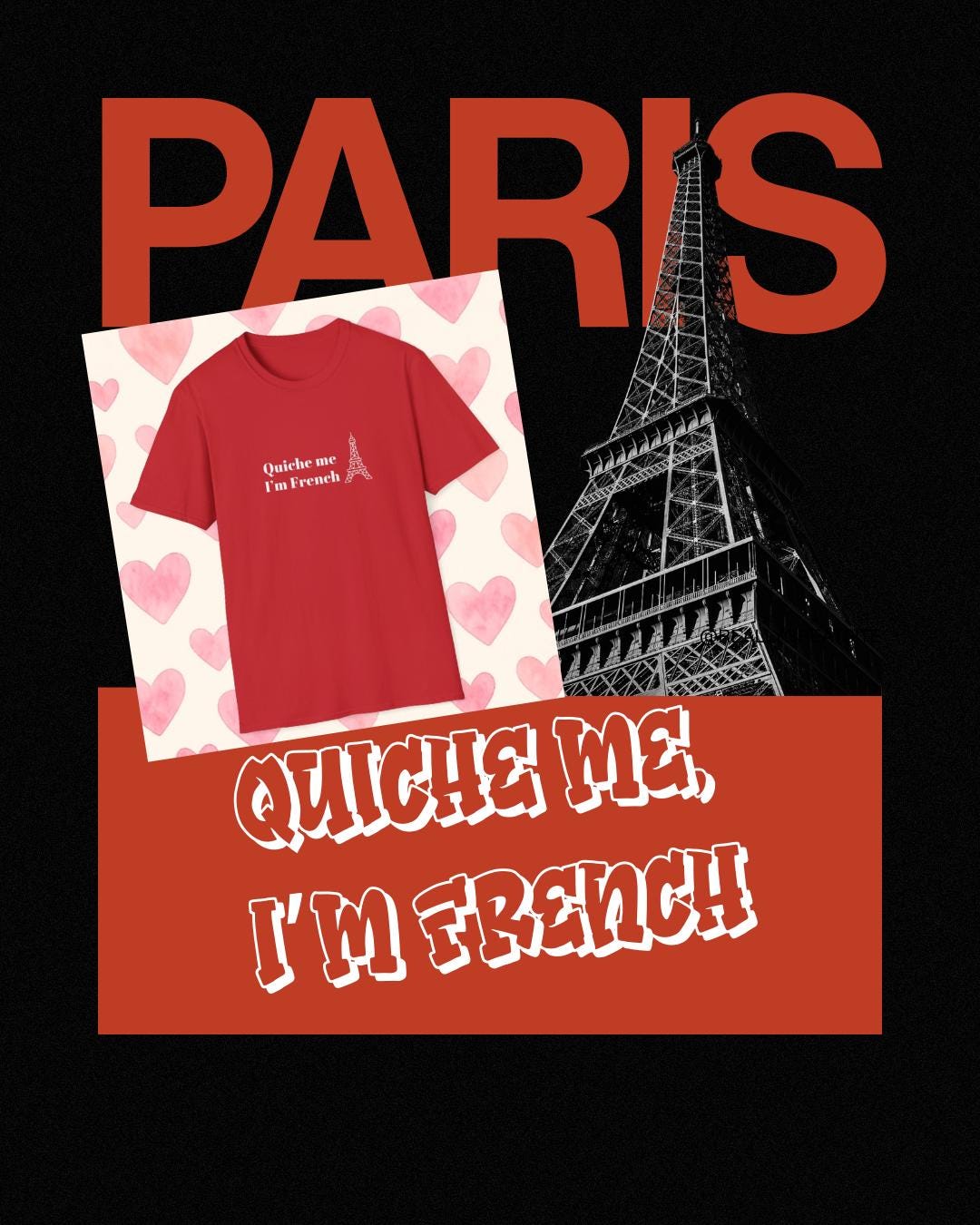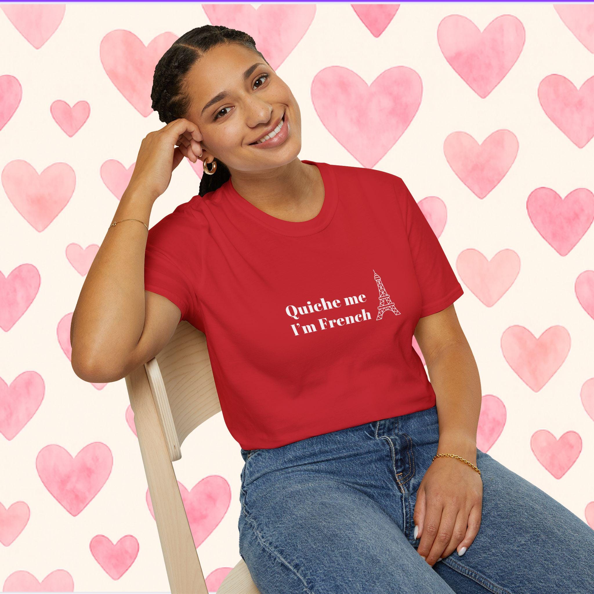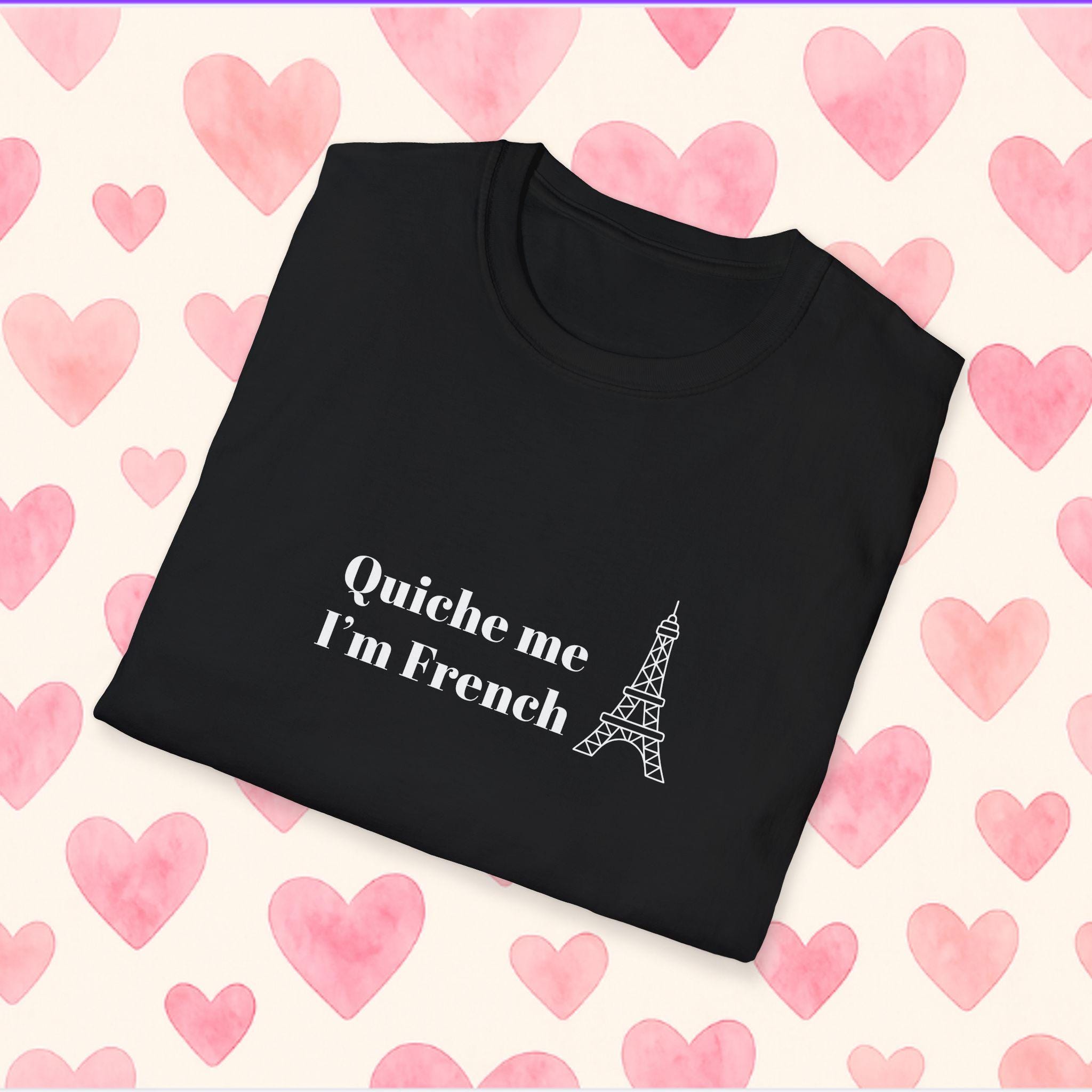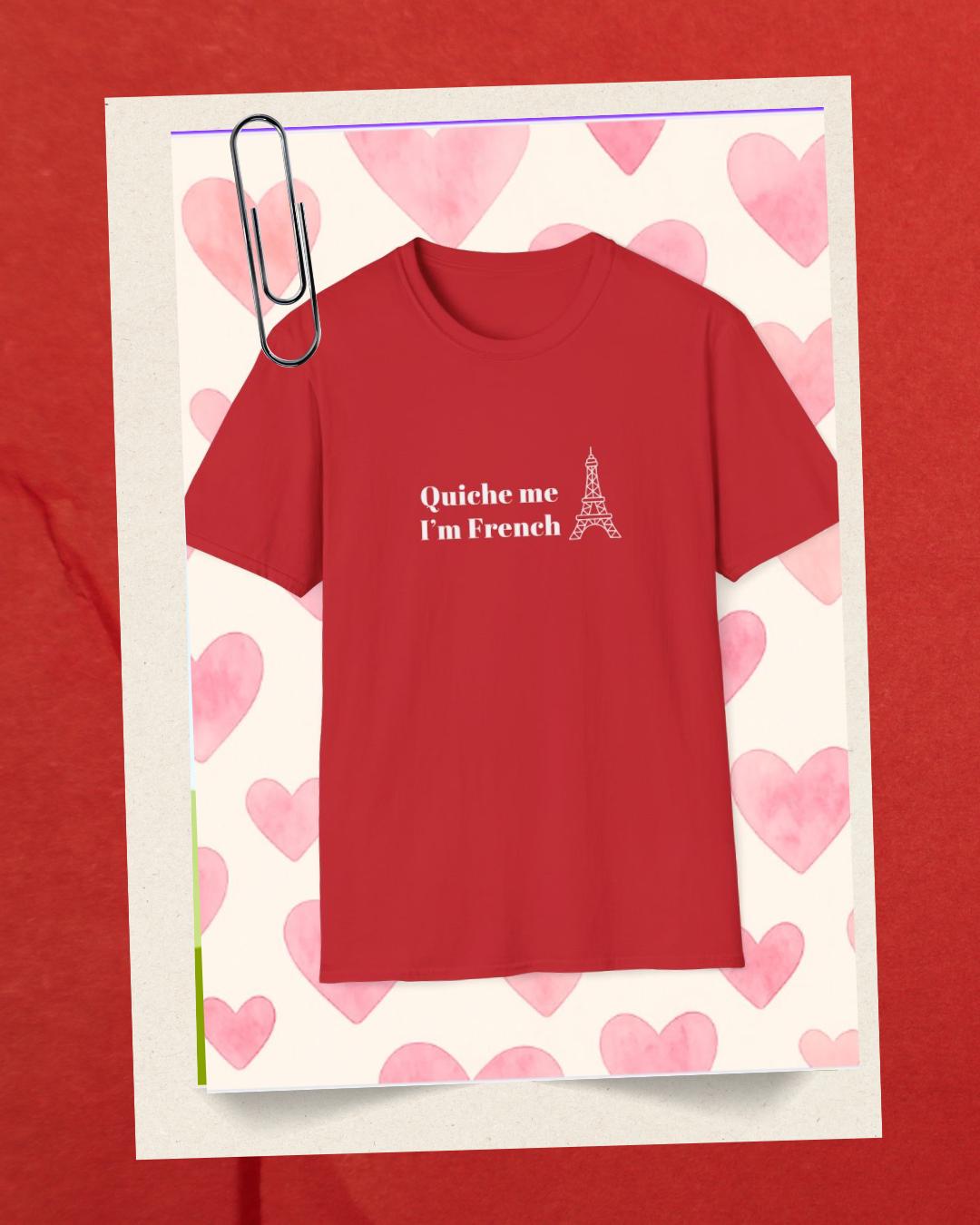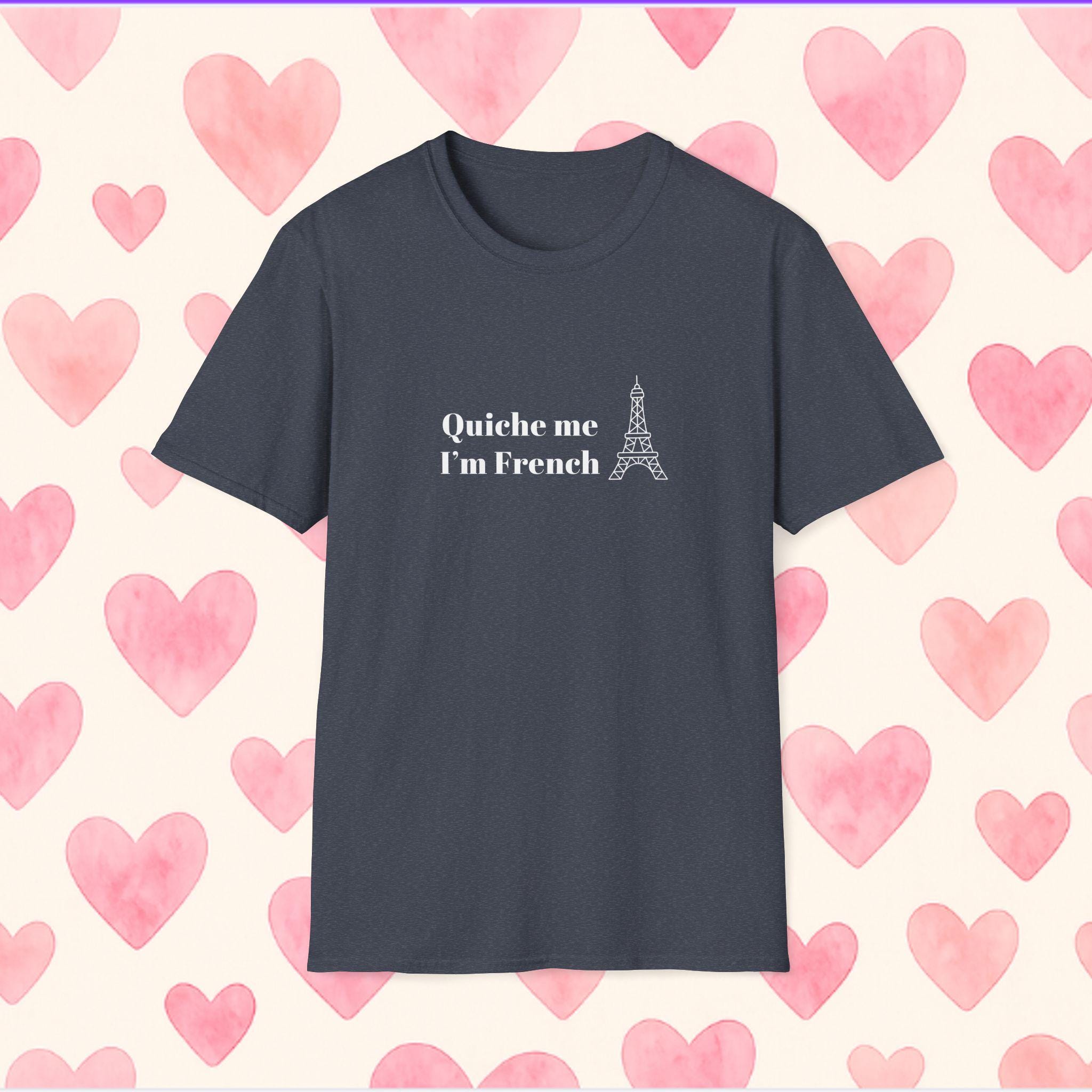 Say it with a wink: a lightweight tee that brings playful French humor into everyday wear. Soft, smooth cotton drapes comfortably while the cheeky “quiche me i’m french” line takes center stage — a small, confident declaration for brunch outings, market runs, and lazy afternoons in cafés. It settles into the wardrobe as a familiar companion: layered under a denim jacket for crisp mornings, paired with linen pants for warm afternoons, or tossed on after a bike ride to stroll through the neighborhood bakery. The tone is casual and unpretentious — someone who laughs easily, loves good food, and enjoys a little cultural tease. This shirt speaks to those who collect moments over things and want a garment that feels lived-in from the first wear.