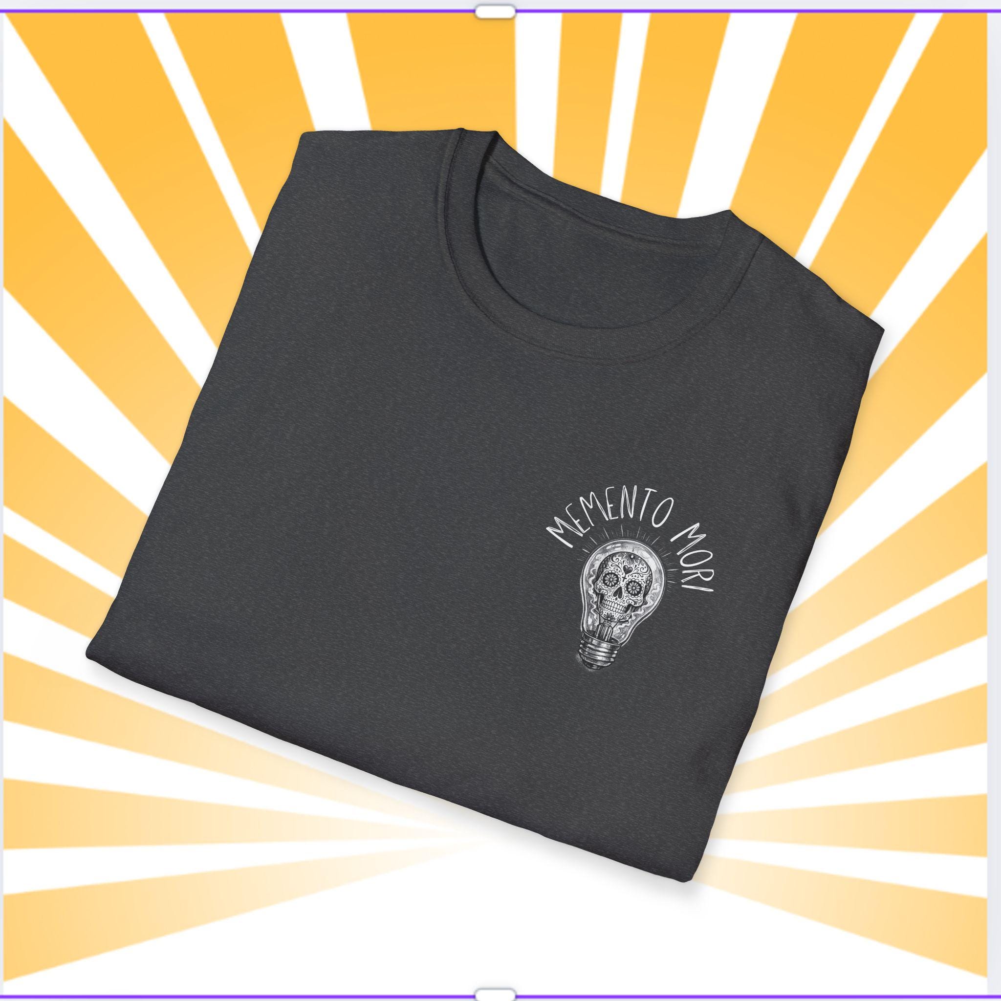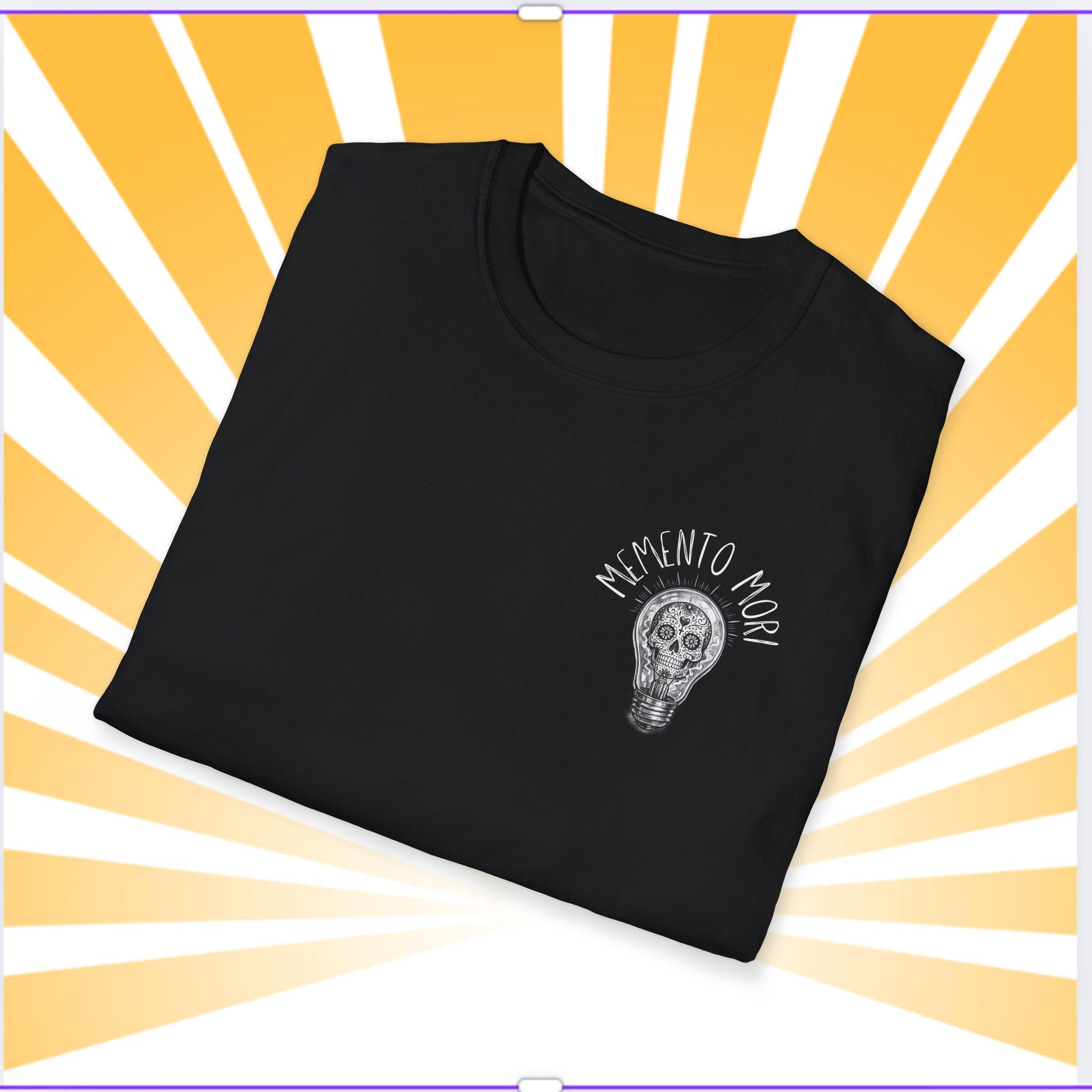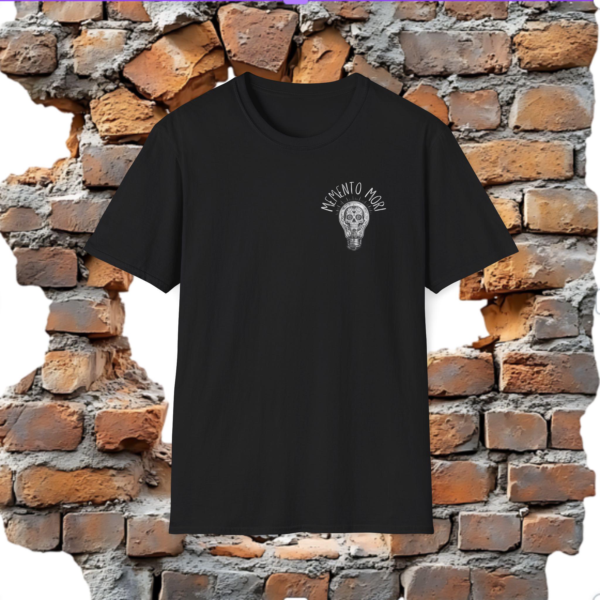 A lightweight, soft cotton tee that wears like a quiet reminder. The skull tucked inside a glowing lightbulb and the words “Memento Mori” pull the eye and the heart.