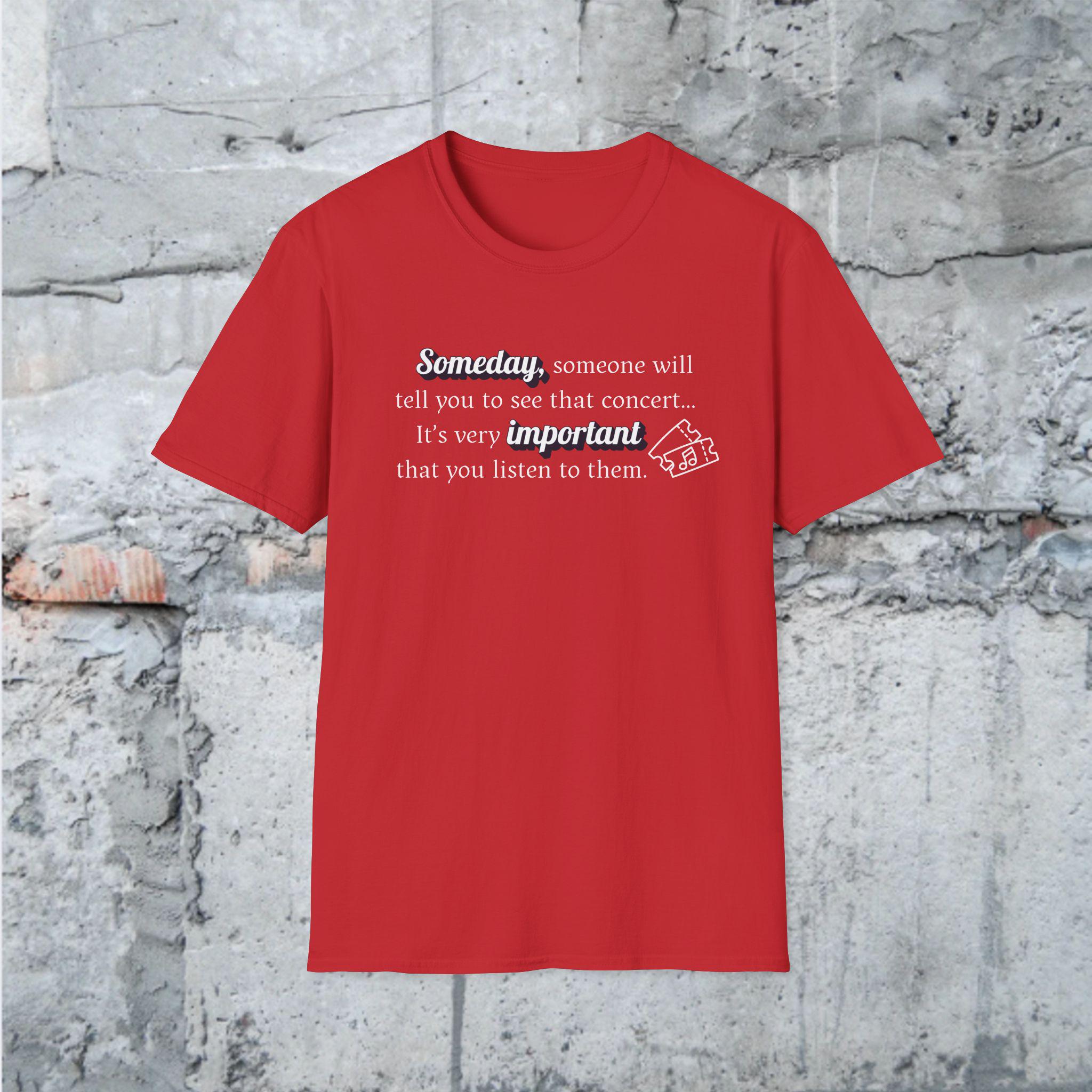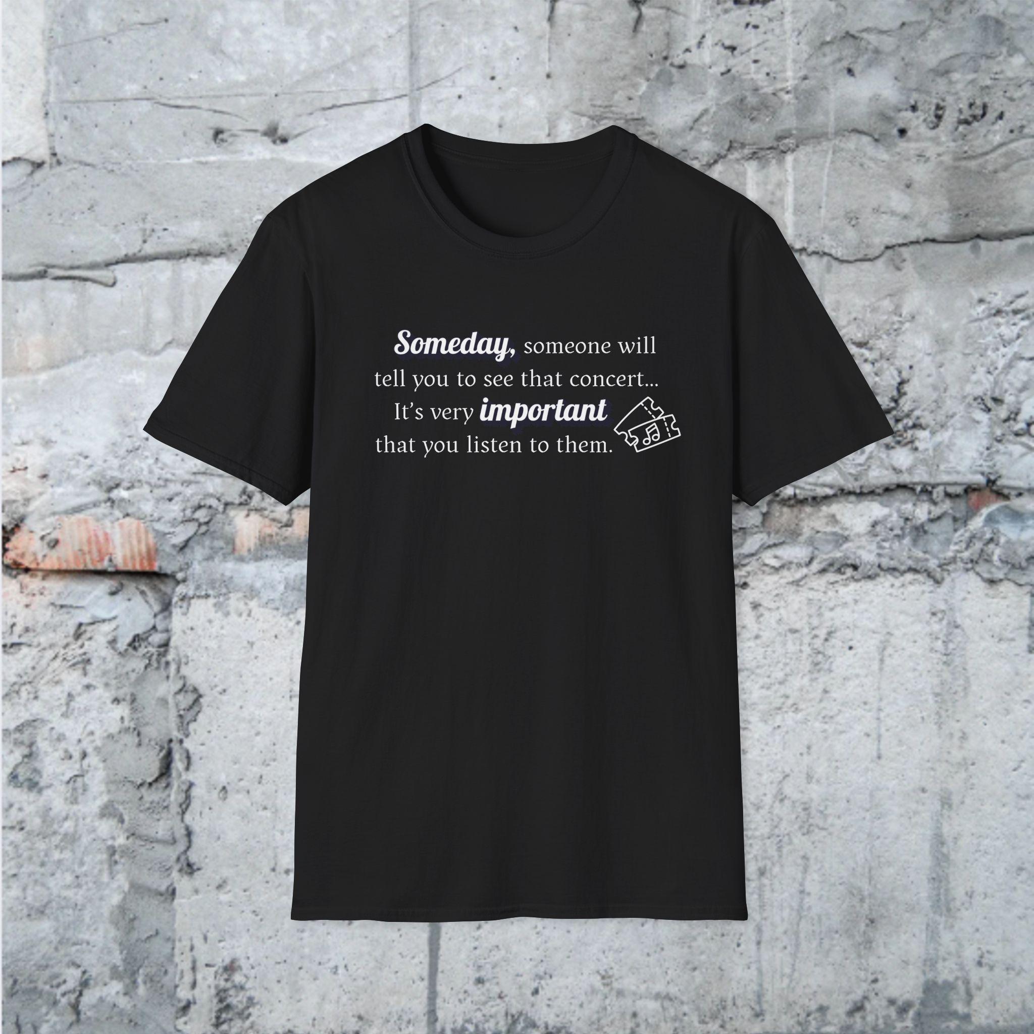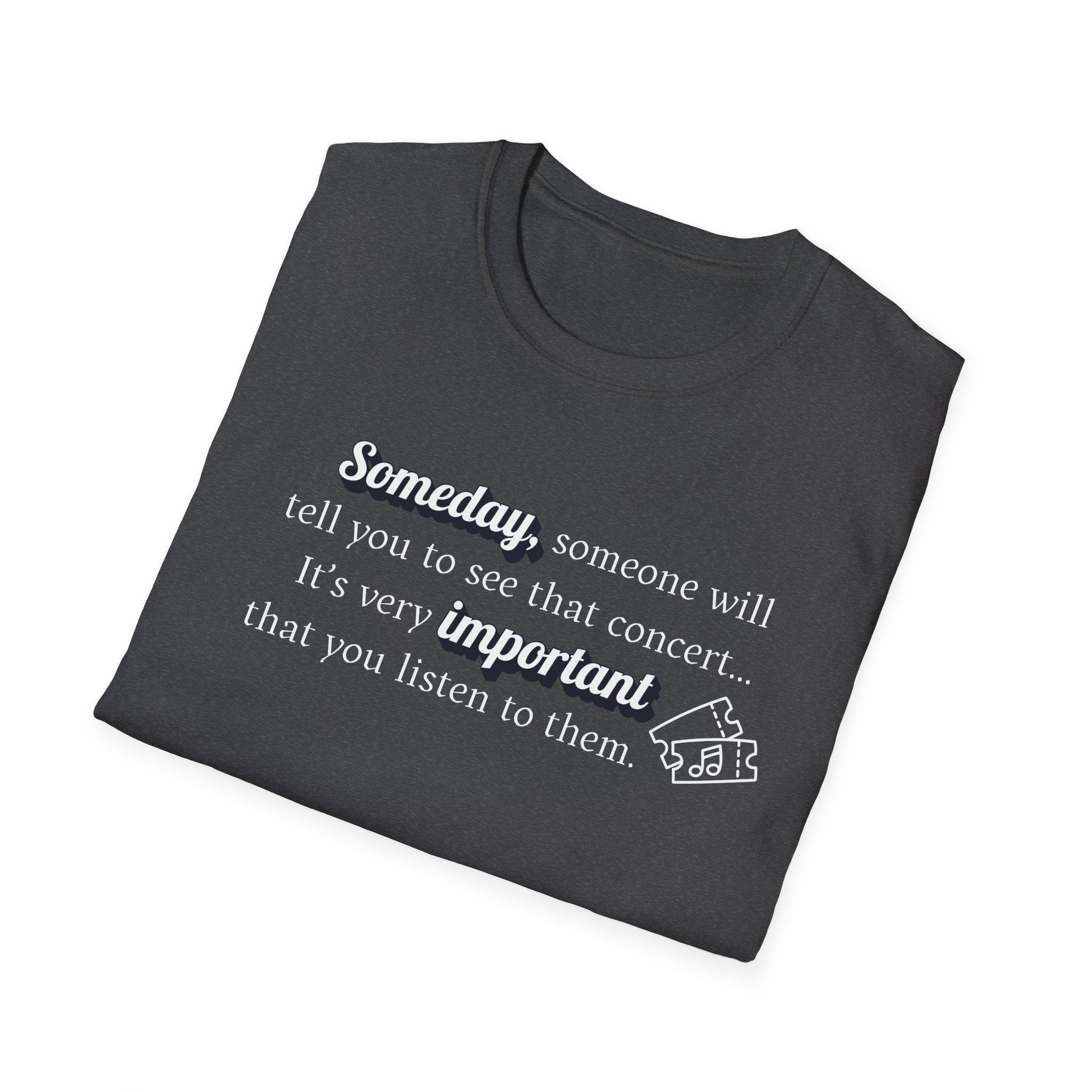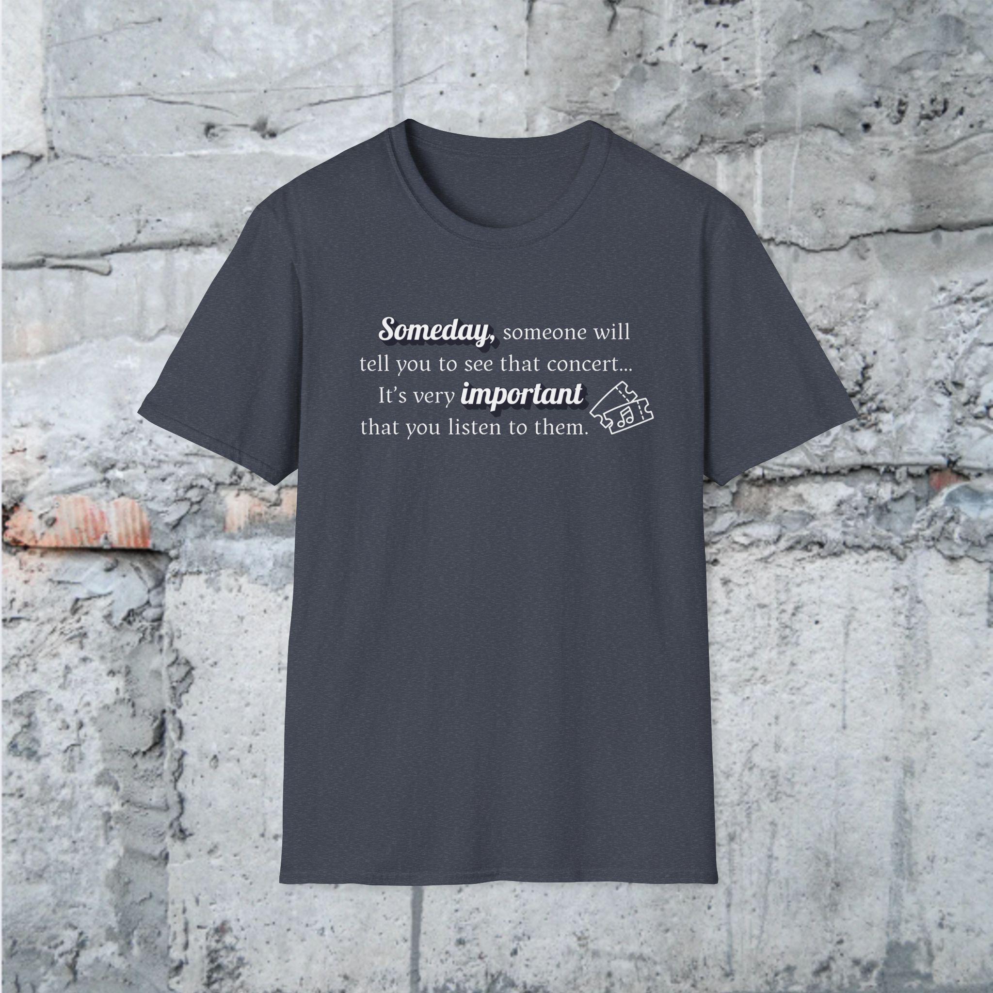 This "Someday, someone will tell you to see that concert...its very important you listen to them." T-shirt is a gentle reminder to take a breath, practice self-care and listen to what your body and mind need. Designed in a pleasing soft aesthetic syle, it's perfect for cozy days, mindfulness lovers, and anyone who needs an uplifting message during busy times. Slow down, create the memories that will last a lifetime.