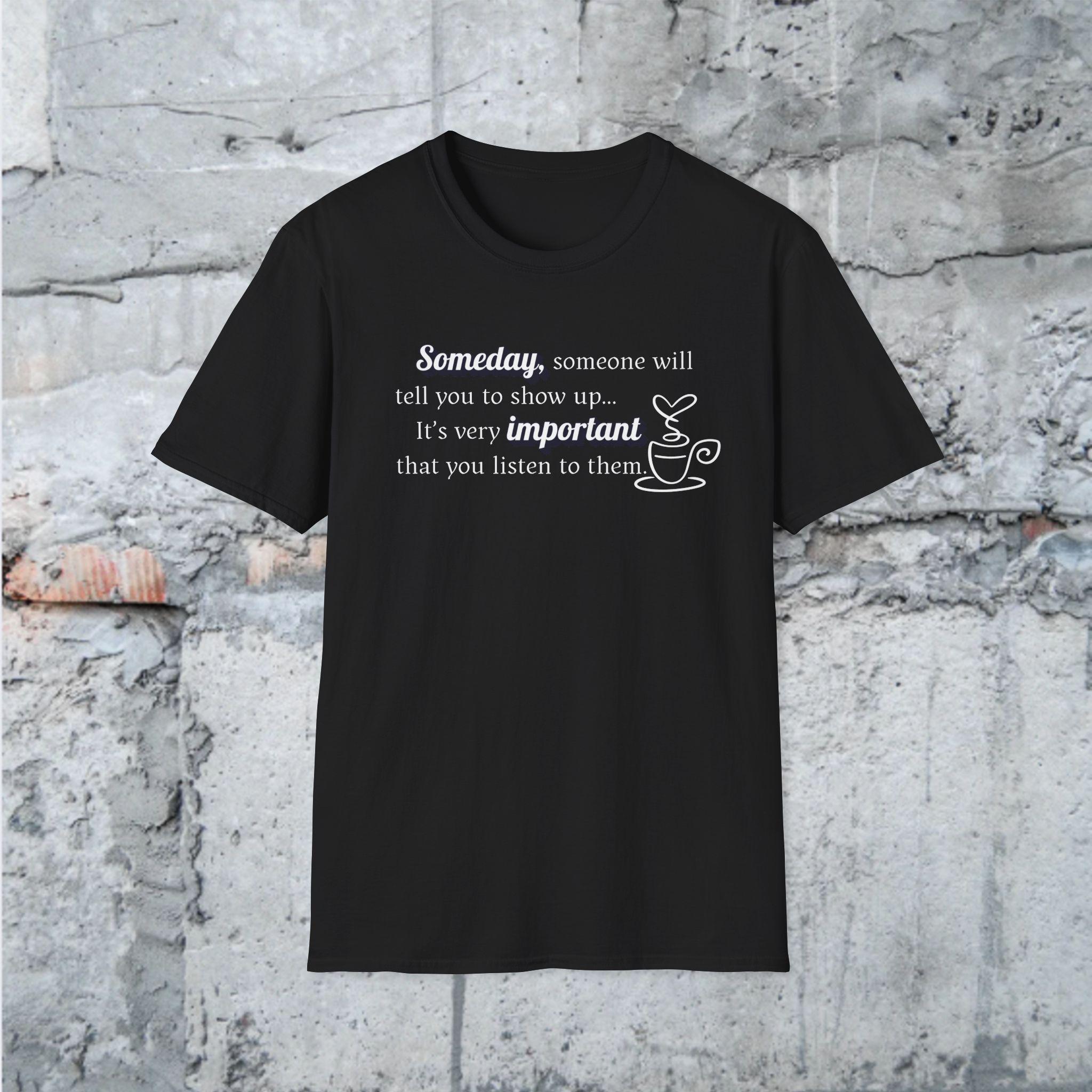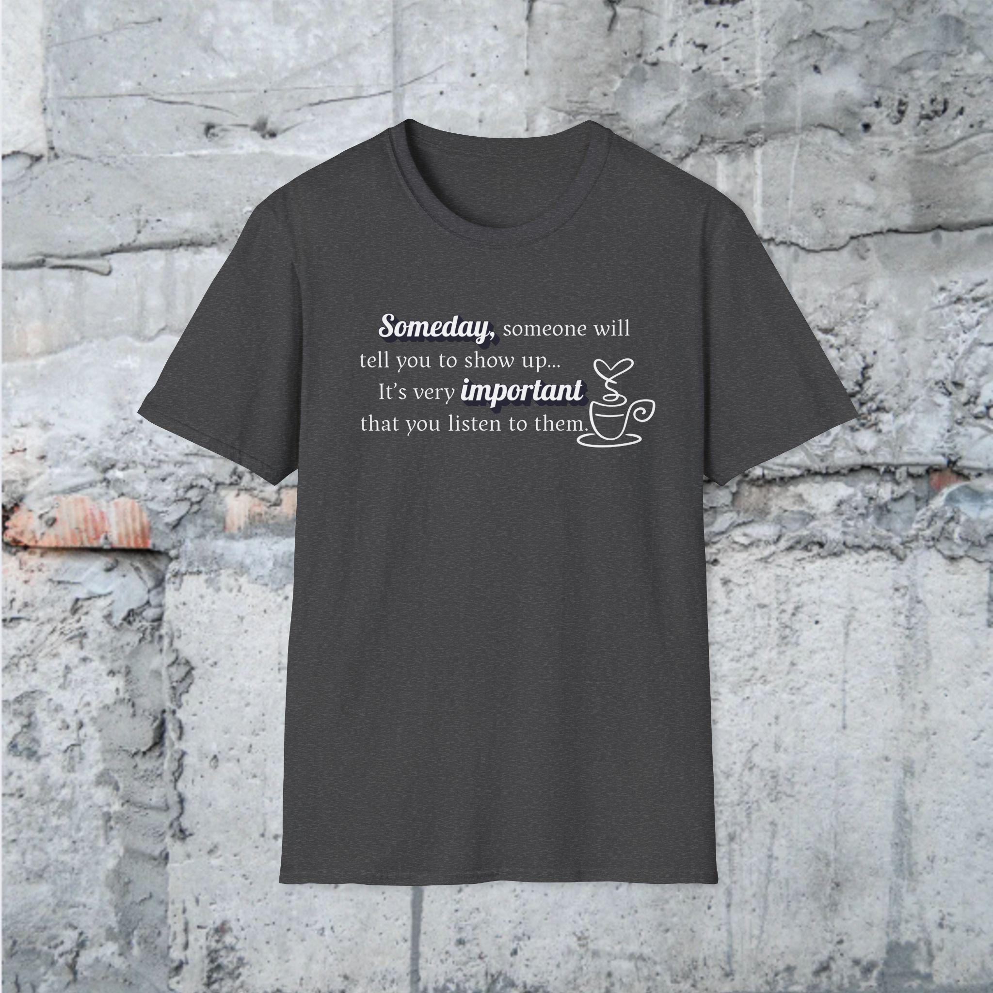 This "Someday, someone will tell you to show up...its very important you listen to them." T-shirt is a gentle reminder to take a breath, practice self-care and listen to what your body and mind need. Designed in a pleasing soft aesthetic syle, it's perfect for cozy days, mindfulness lovers, and anyone who needs an uplifting message during busy times. Slow down, create the memories that will last a lifetime.