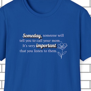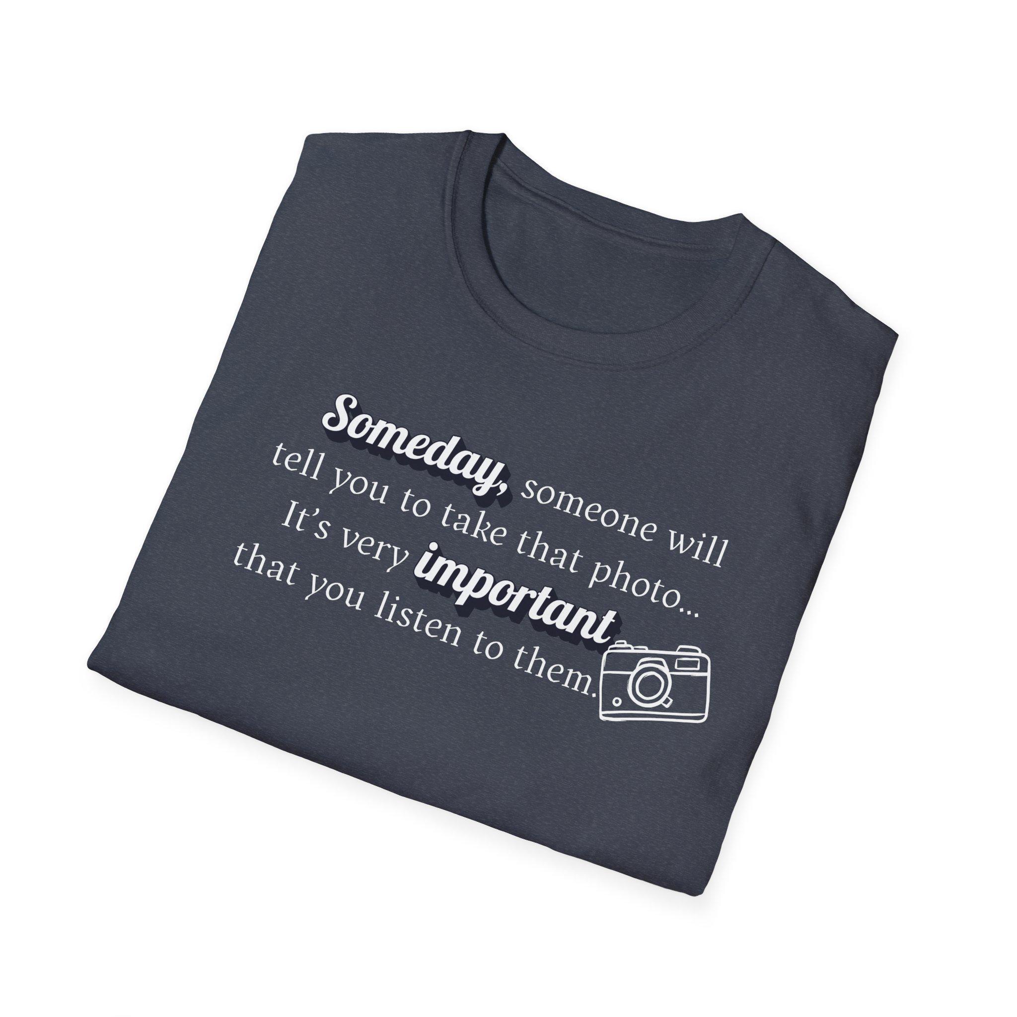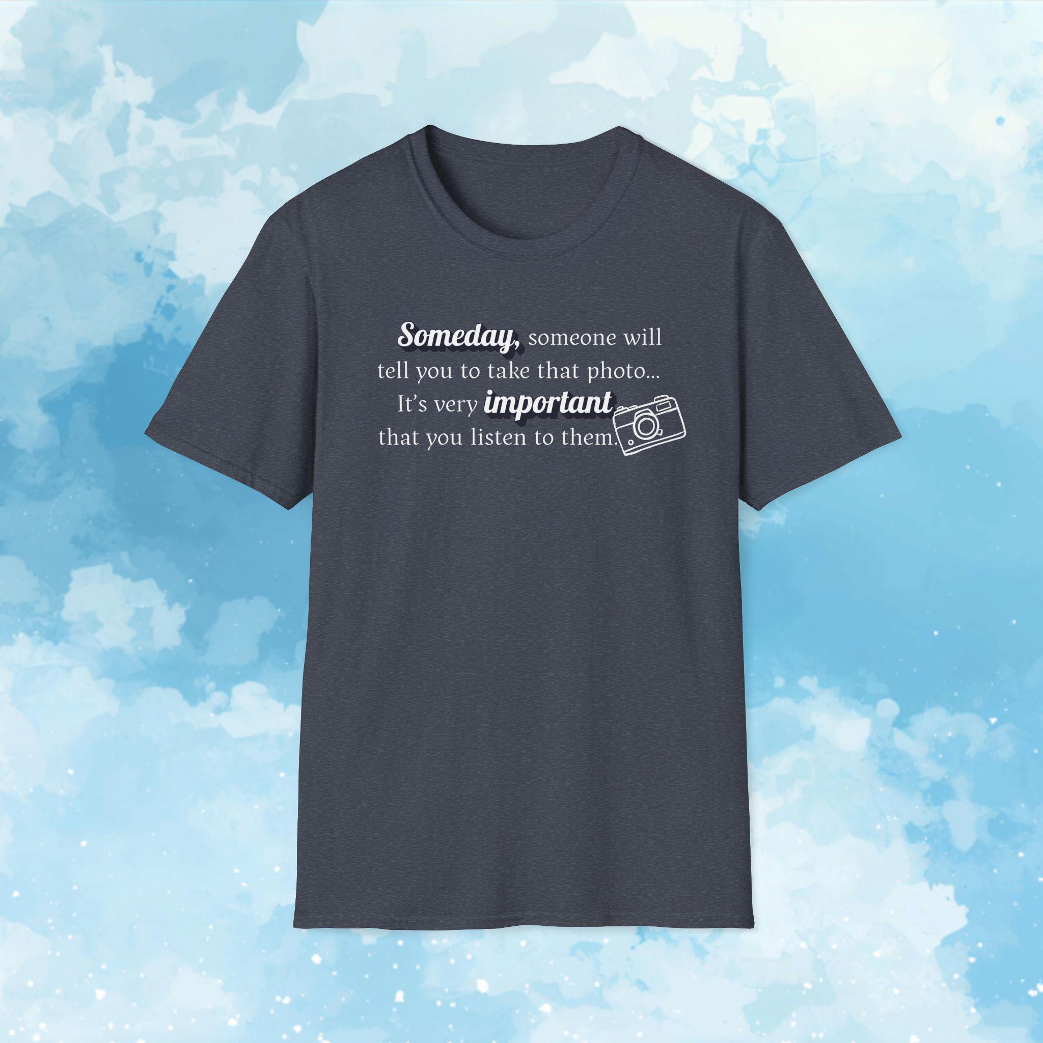 This "Someday, someone will tell you to take that photo...its very important you listen to them." T-shirt is a gentle reminder to take a breath, practice self-care and listen to what your body and mind need. Designed in a pleasing soft aesthetic syle, it's perfect for cozy days, mindfulness lovers, and anyone who needs an uplifting message during busy times. Slow down, create the memories that will last a lifetime.