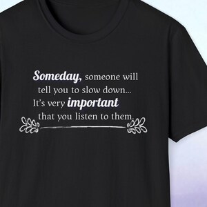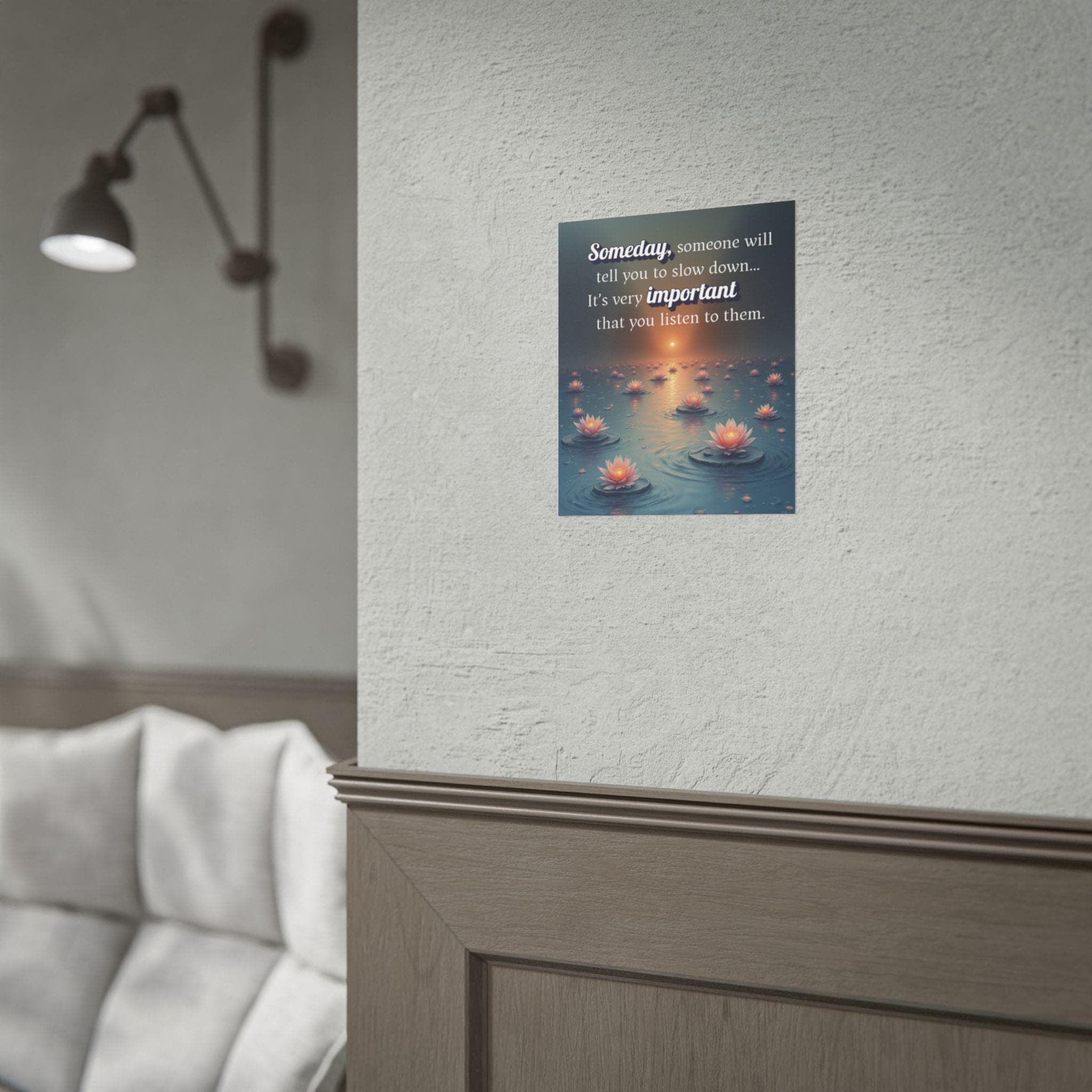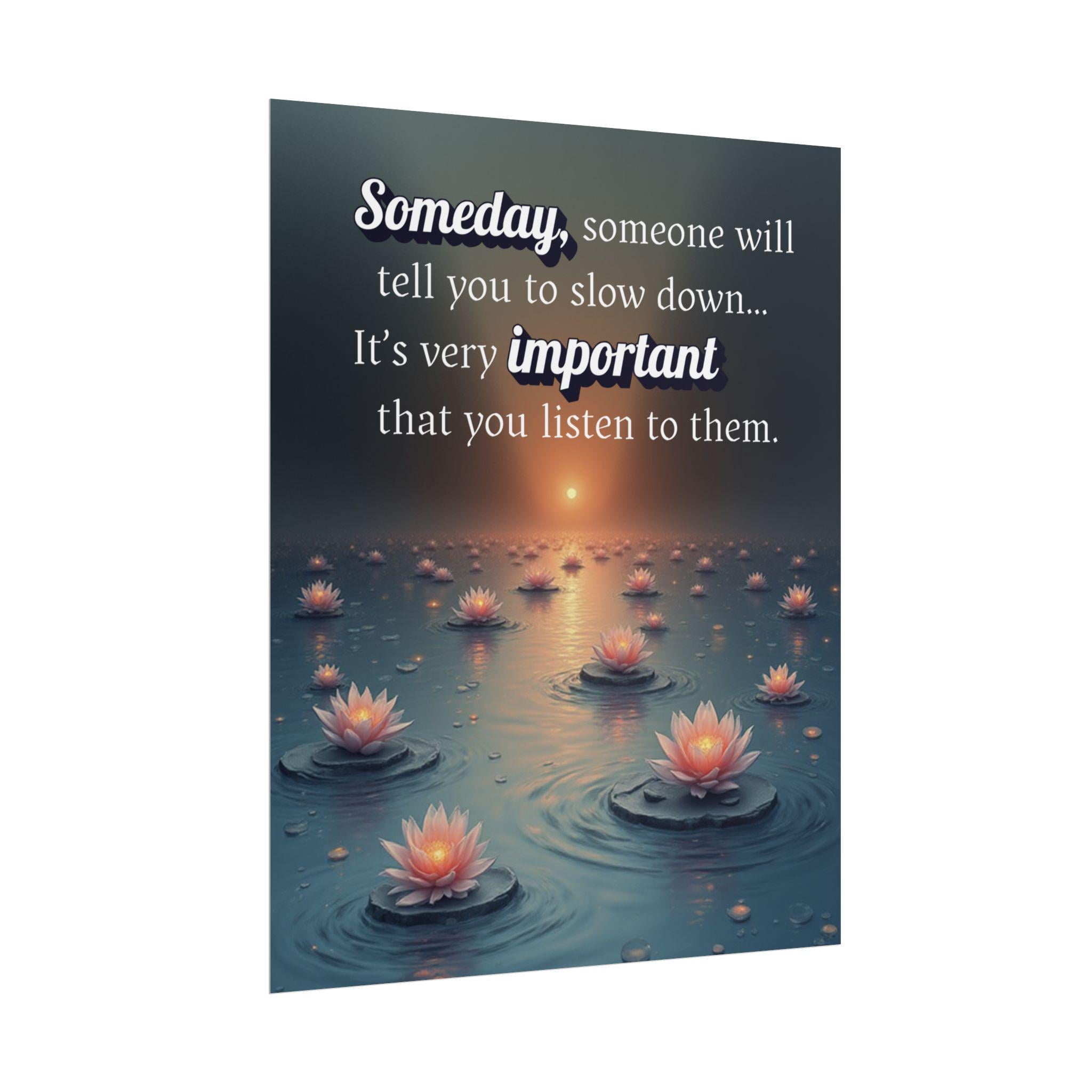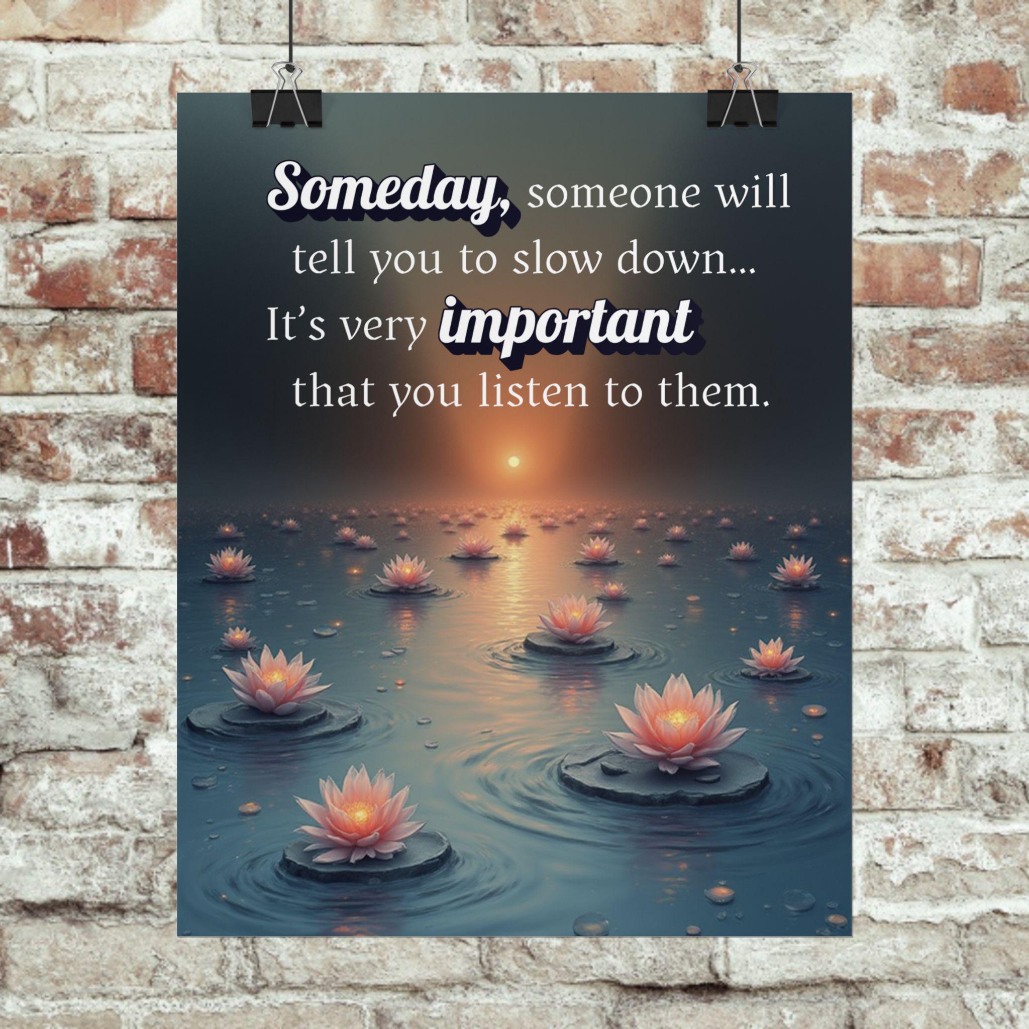 This "Someday, someone will tell you to slow down...its very important you listen to them." poster is a gentle reminder to take a breath, practice self-care and listen to what your body and mind need. Designed in a pleasing aesthetic syle and anyone who needs an uplifting message during busy times. Slow down, create the memories that will last a lifetime.