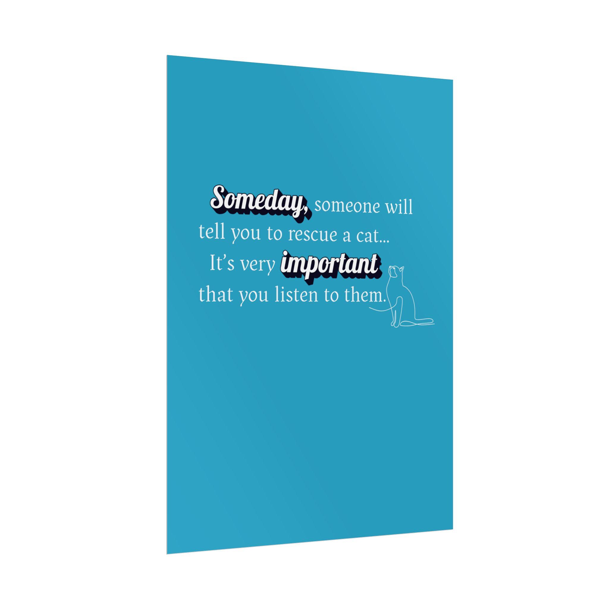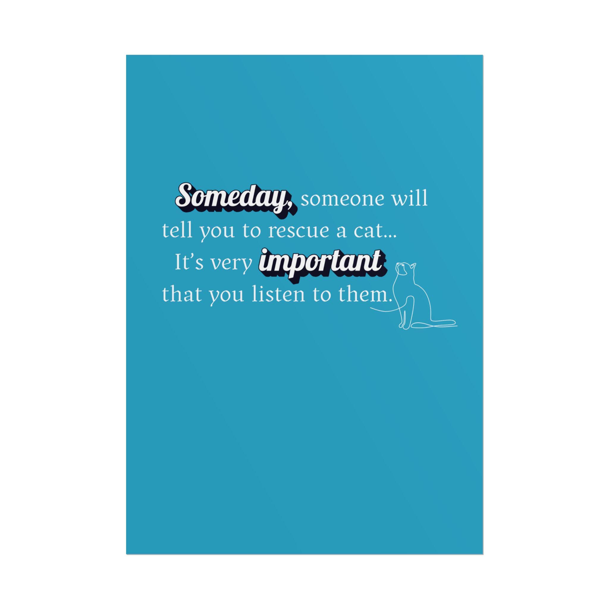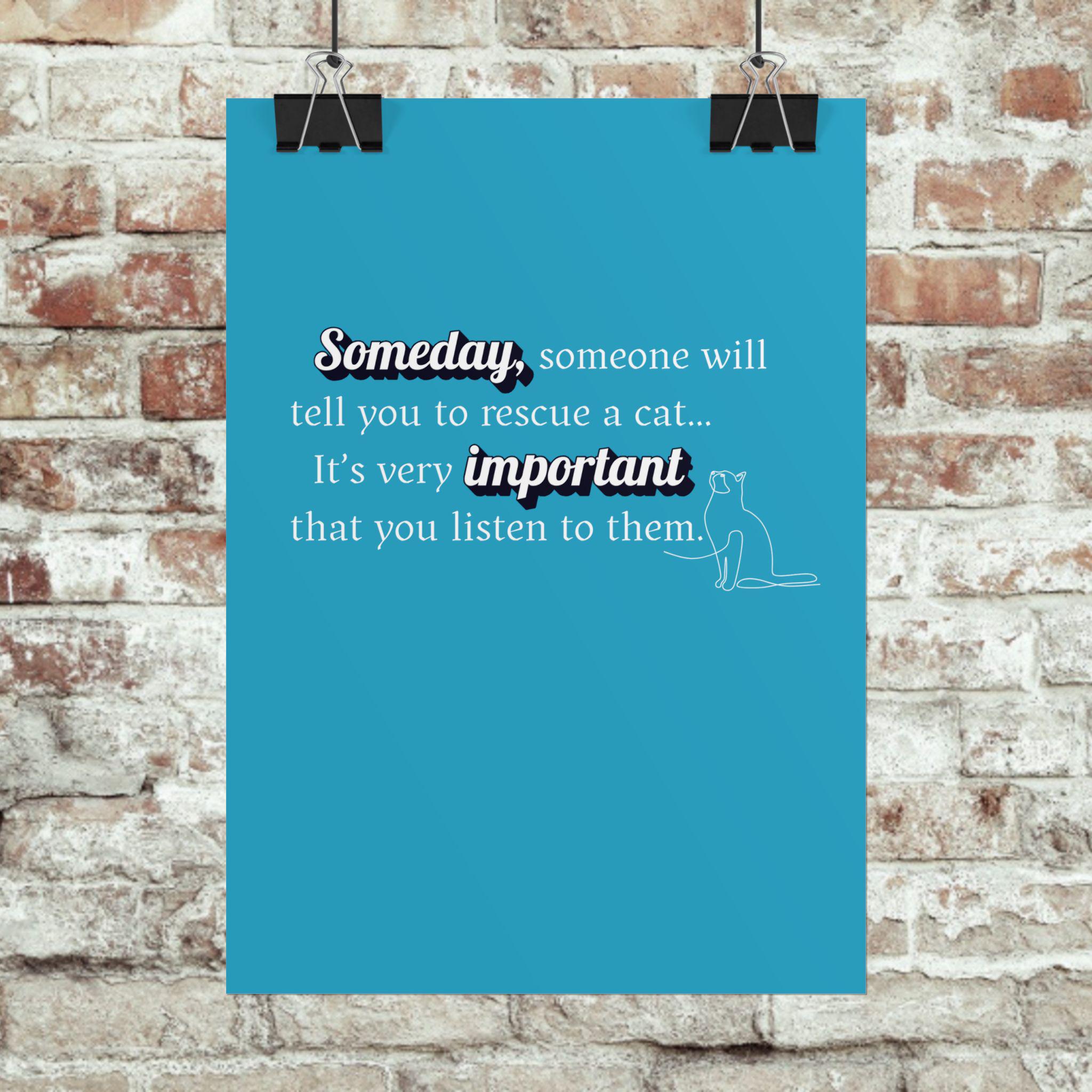 This "Someday, someone will tell you to RESCUE A CAT...its very important you listen to them." Designed in a pleasing aesthetic syle and anyone who needs an uplifting message during busy times. Slow down, create the memories that will last a lifetime. A great sign for you shelter or groomers.