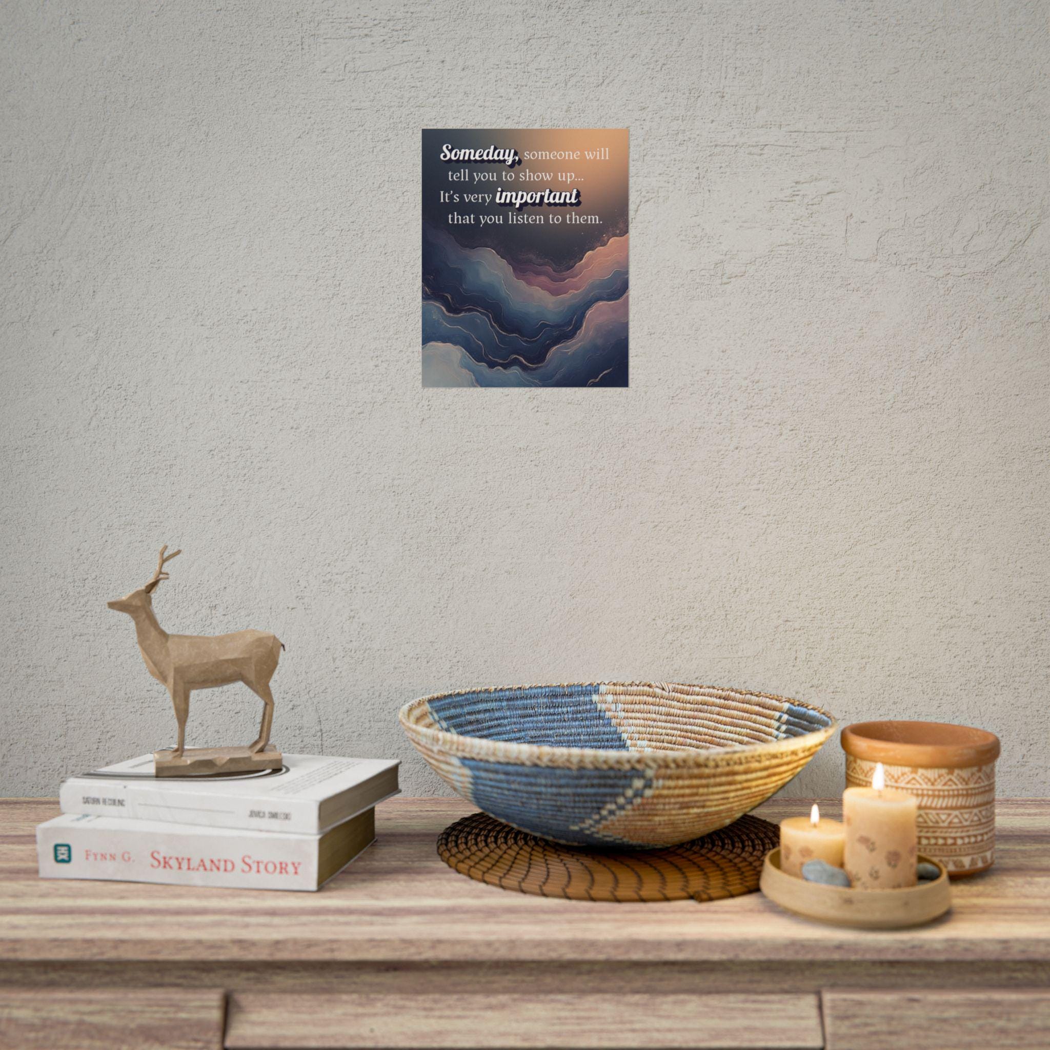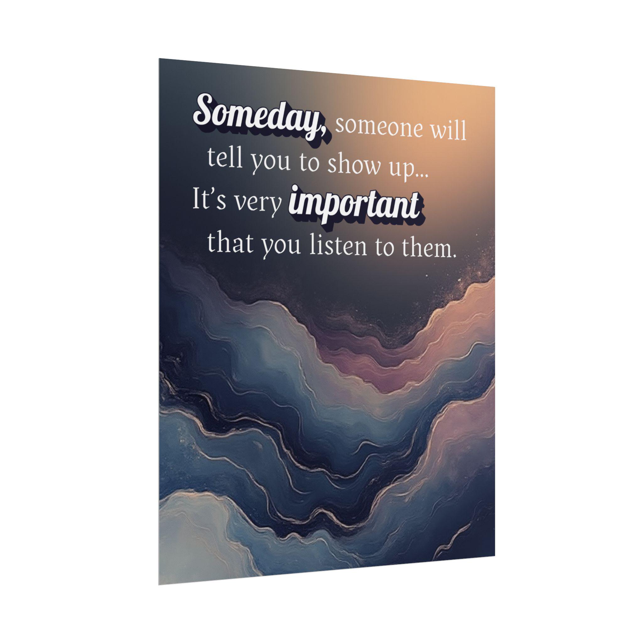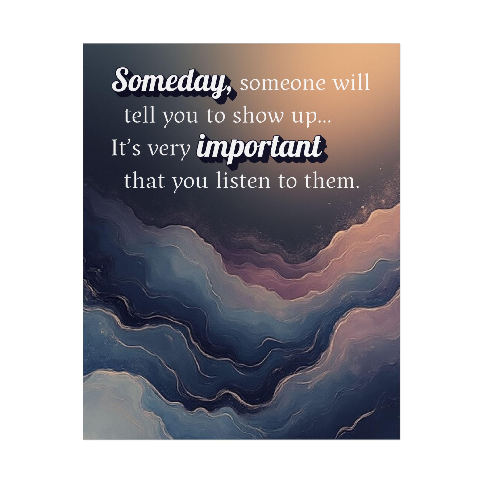 This "Someday, someone will tell you to SHOW UP...its very important you listen to them." Designed in a pleasing aesthetic syle and anyone who needs an uplifting message during busy times. Slow down, create the memories that will last a lifetime.