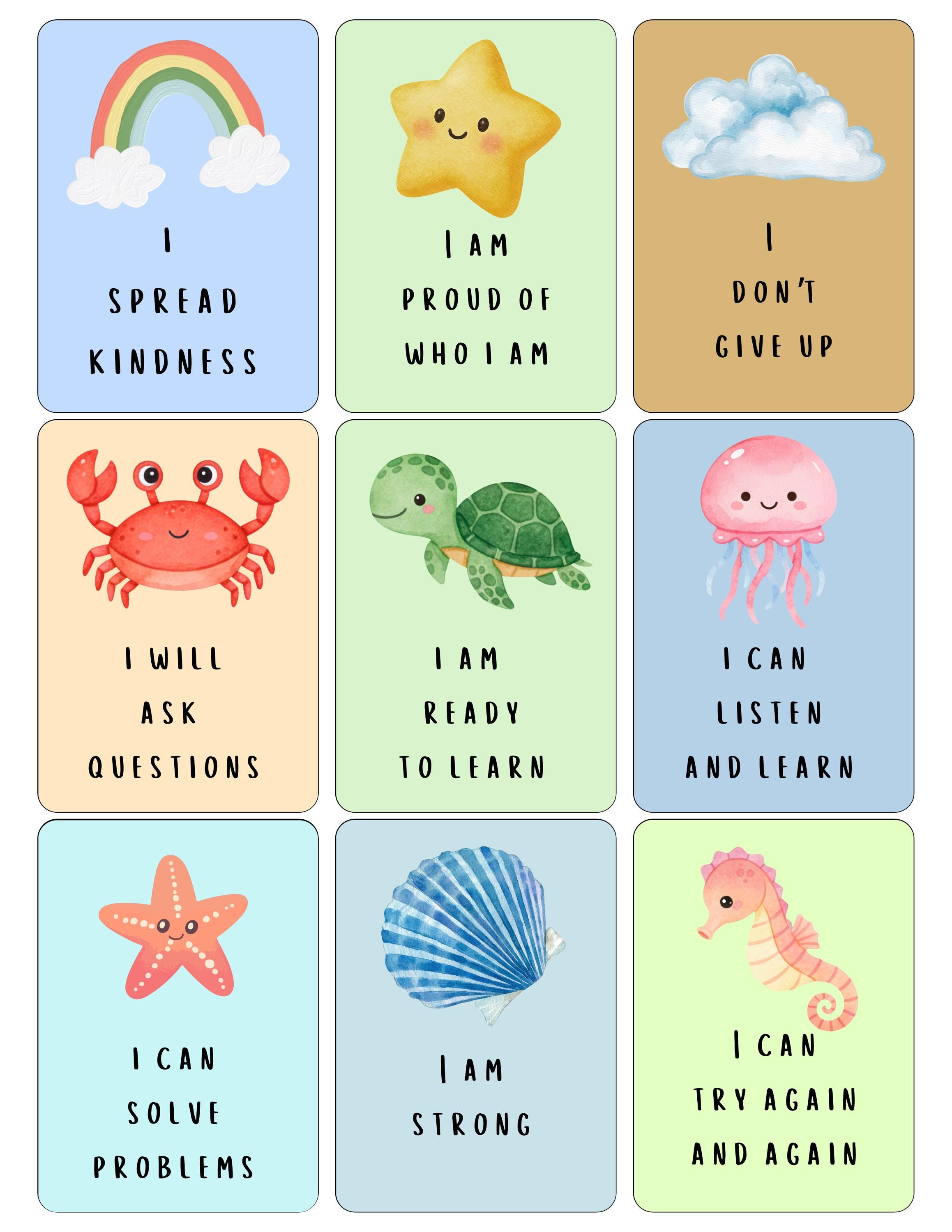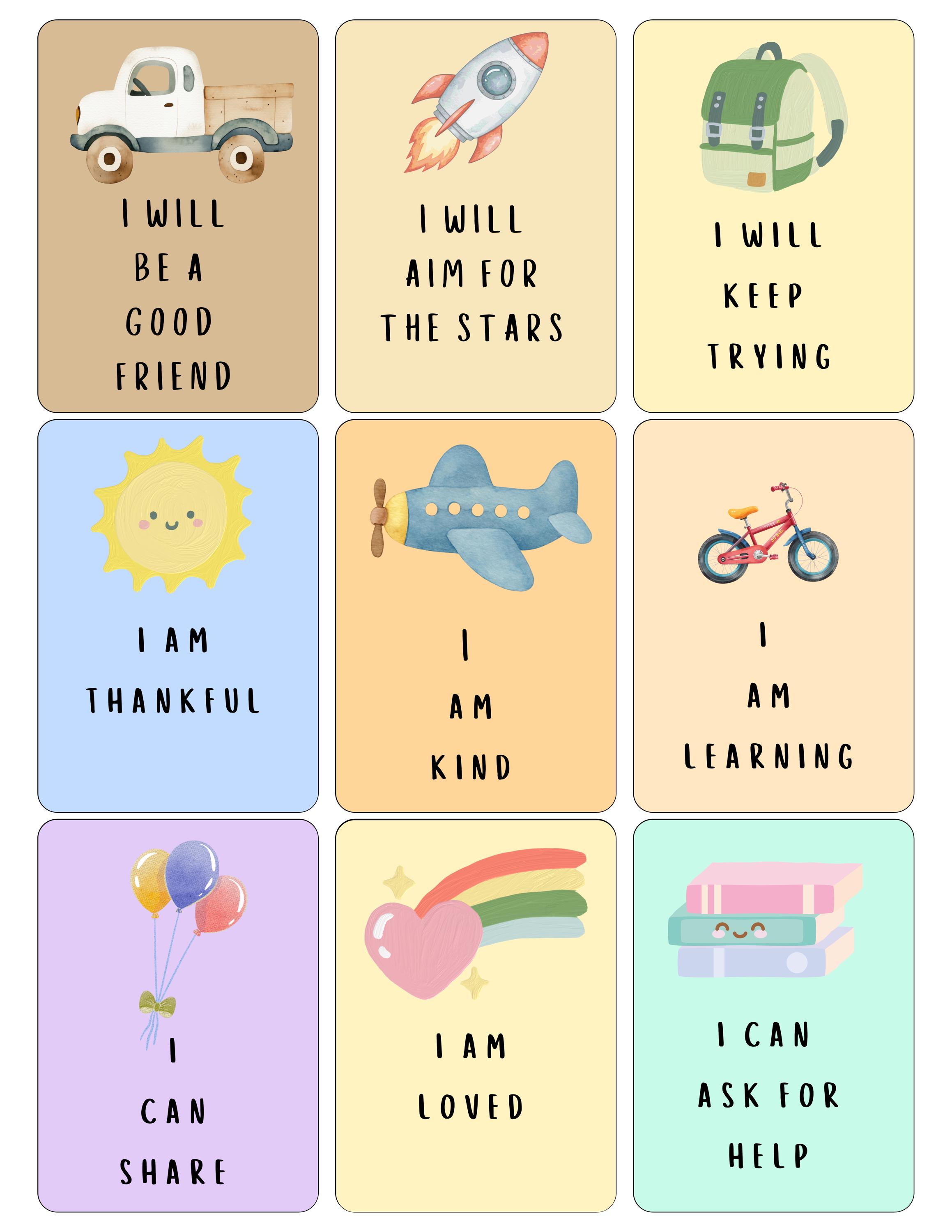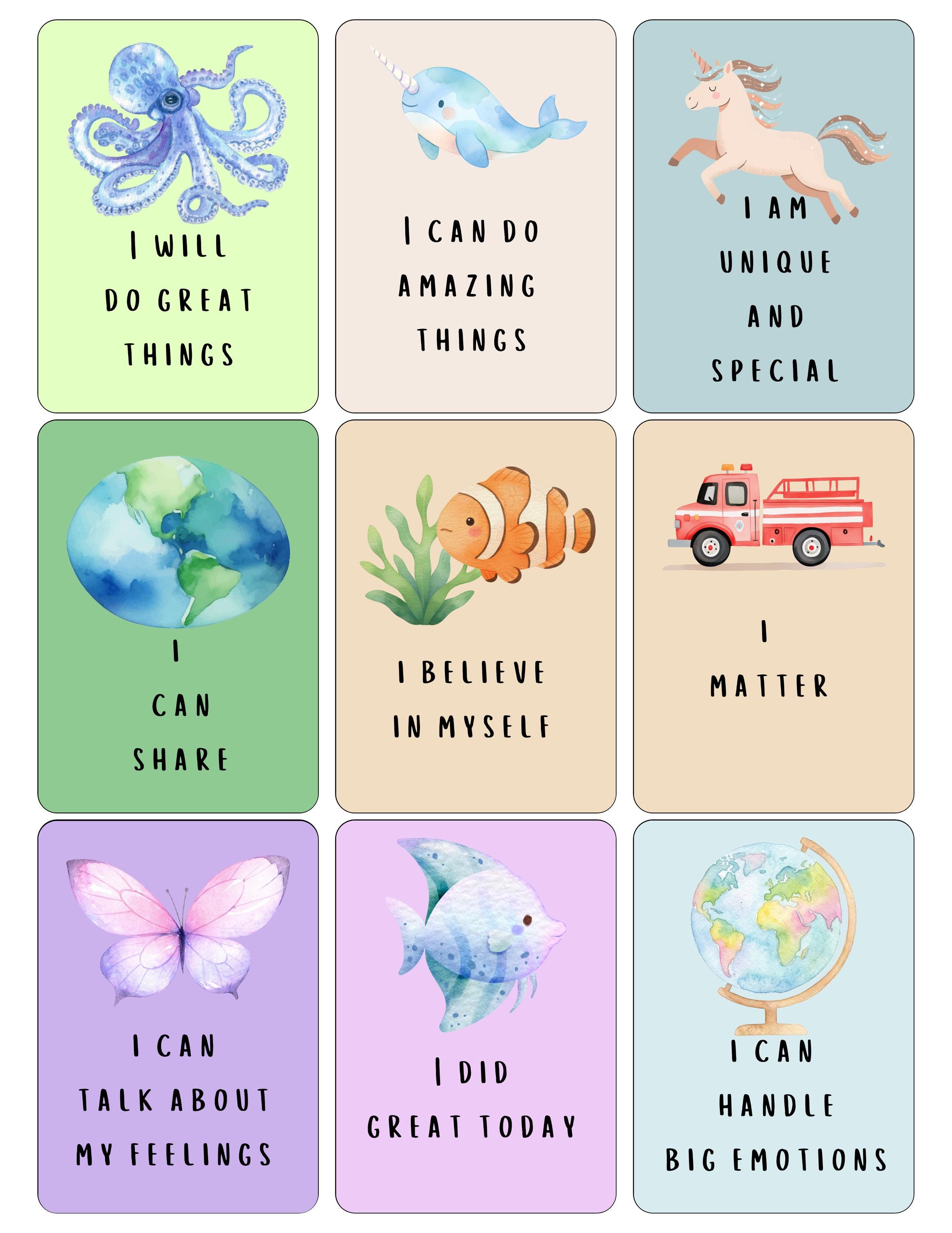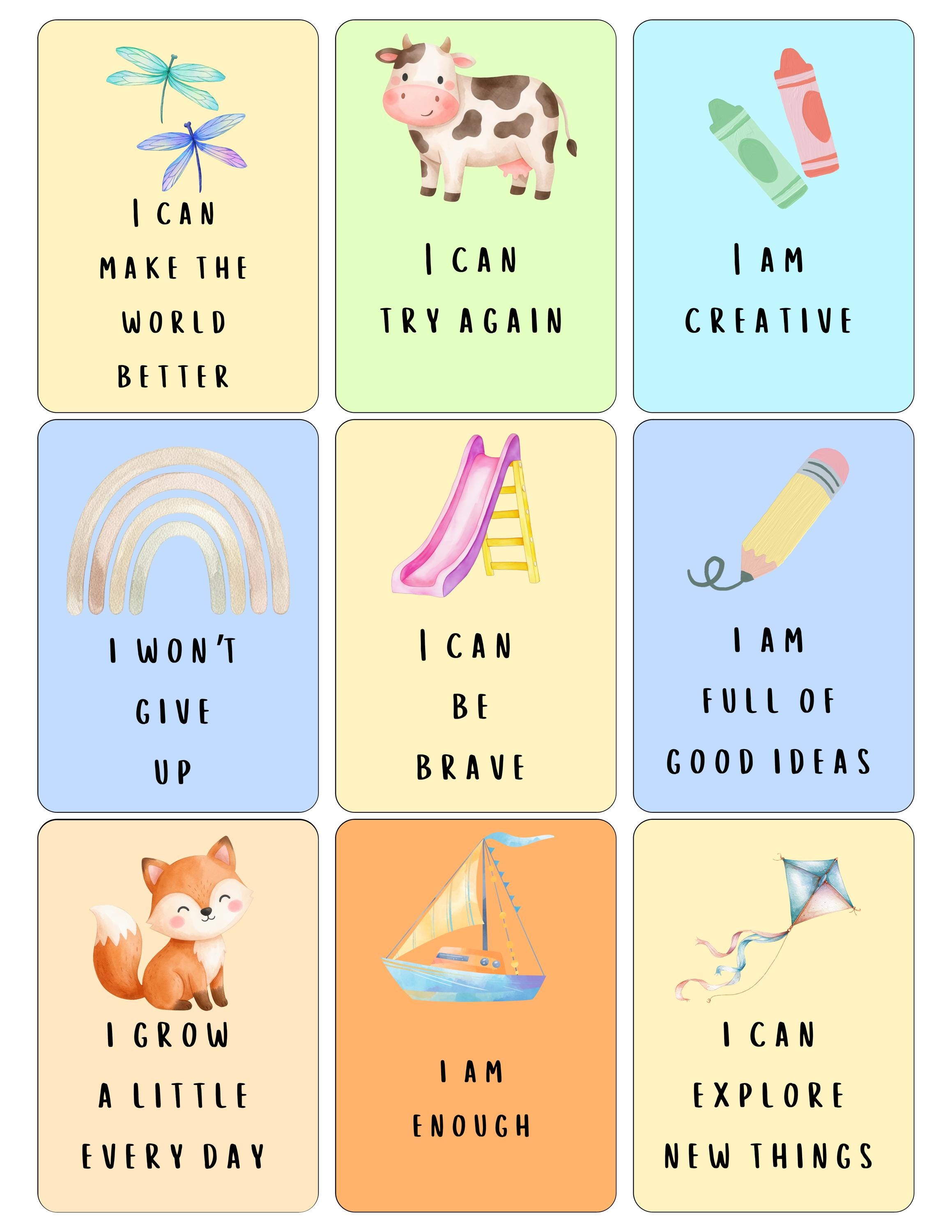 *Print on bright white paper or cardstock *Laminate for re-use *24 Kid-friendly affirmation cards *High-resoluation png's *Easy-to-print US Letter & A4 sizes (8-1/2 x 11) *Designed with bright, simple and colorful illustrations. *Ideal for home, classroom, therapy or morning routines.