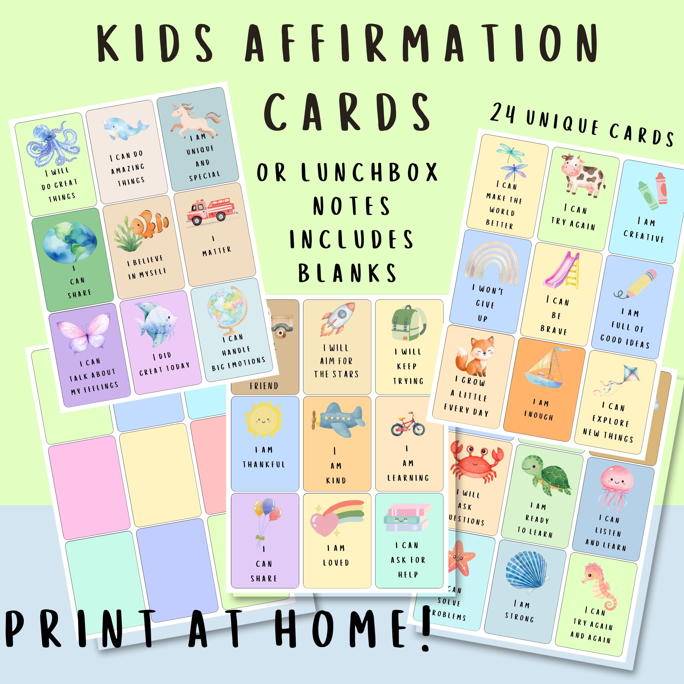 Your puchase includes 24 unique Printable Kids Affirmation Cards, also includes a blank page of cards to create a few of your own. Help little ones build confidence, stay motivated and start each day with positivity! Put one out every morning, throw in a lunch bag or use as rewards. PERFECT for parents, teachers, homeschoolers and counselors, this set includes uplifting, child-friendly affirmations that promote self-esteem and a growth midset.