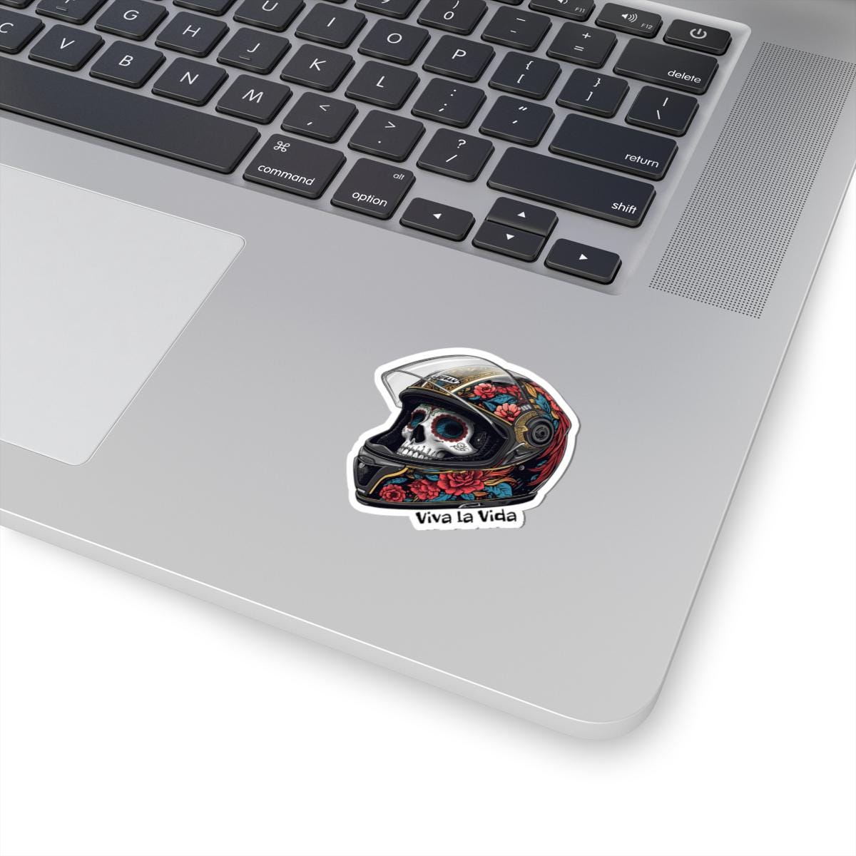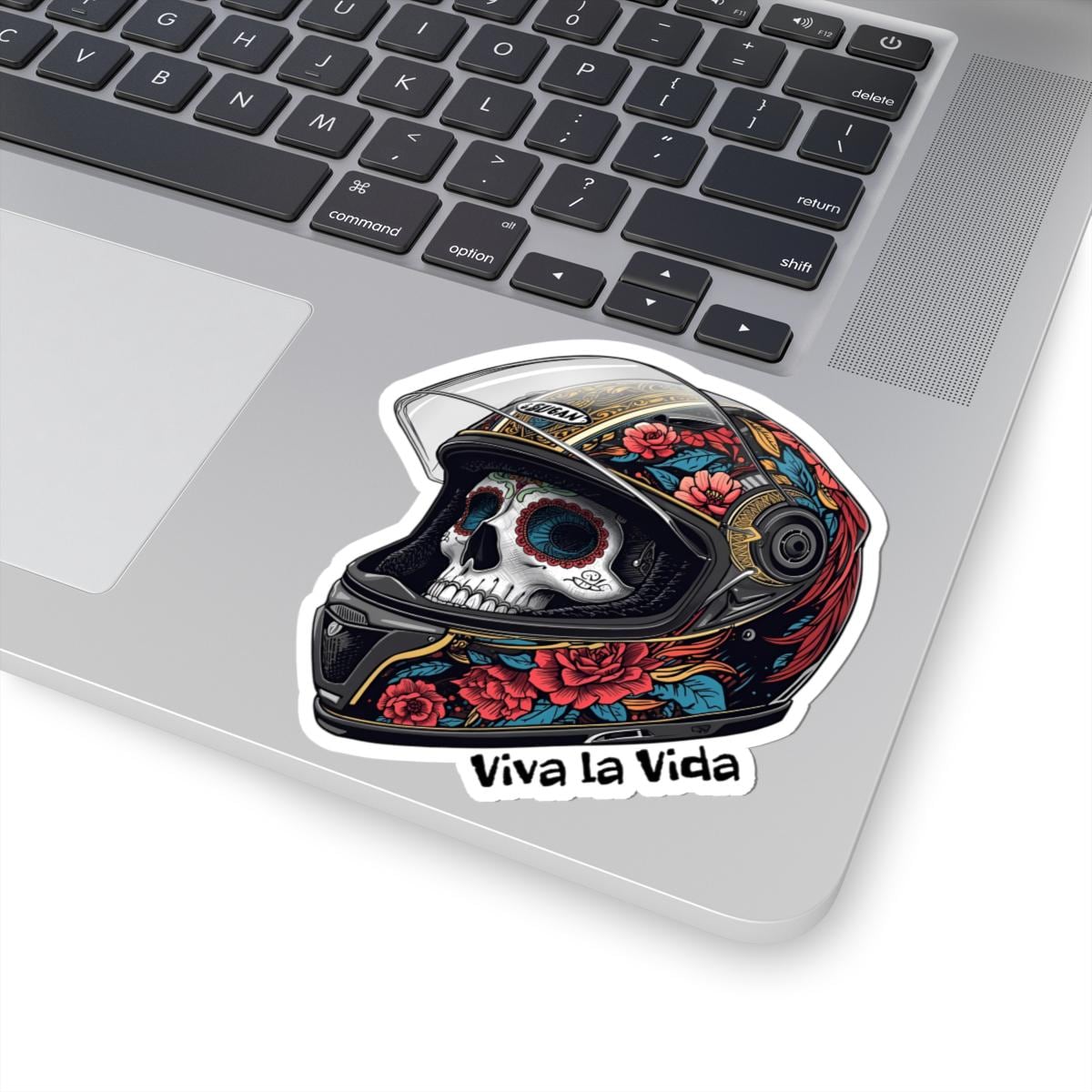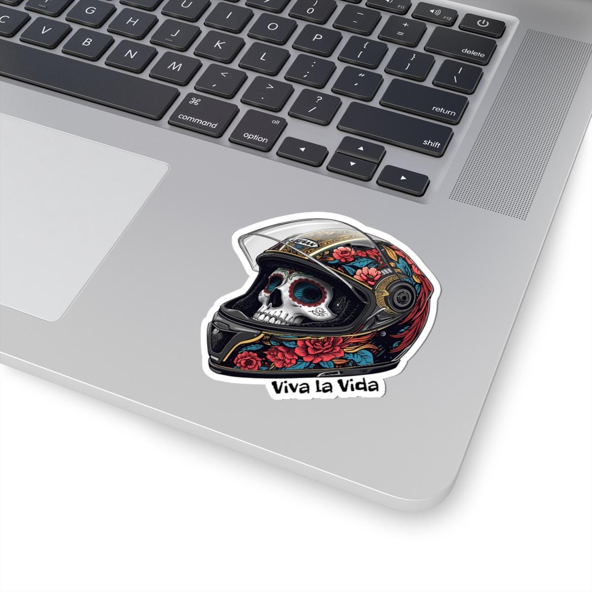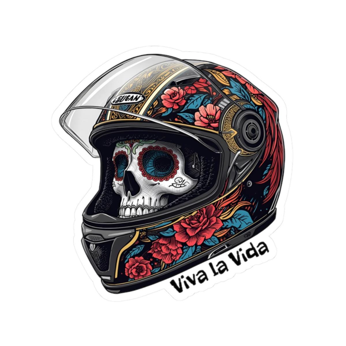 A vibrant kiss-cut vinyl sticker that brings bold, rebellious energy to your gear. This glossy, scratch-resistant decal features a sugar-skull face inside a detailed floral motorcycle helmet, accented with rich reds, teal highlights, and the phrase “Viva la Vida.” It clings smoothly to laptops, journals, helmets, and other flat surfaces with a strong permanent acrylic adhesive and applies bubble-free for a clean finish. Choose white or transparent backing and from four size options to match where you want to stick it. This sticker feels alive—perfect for riders, artists, and anyone who loves Día de los Muertos style with a modern, road-ready twist.