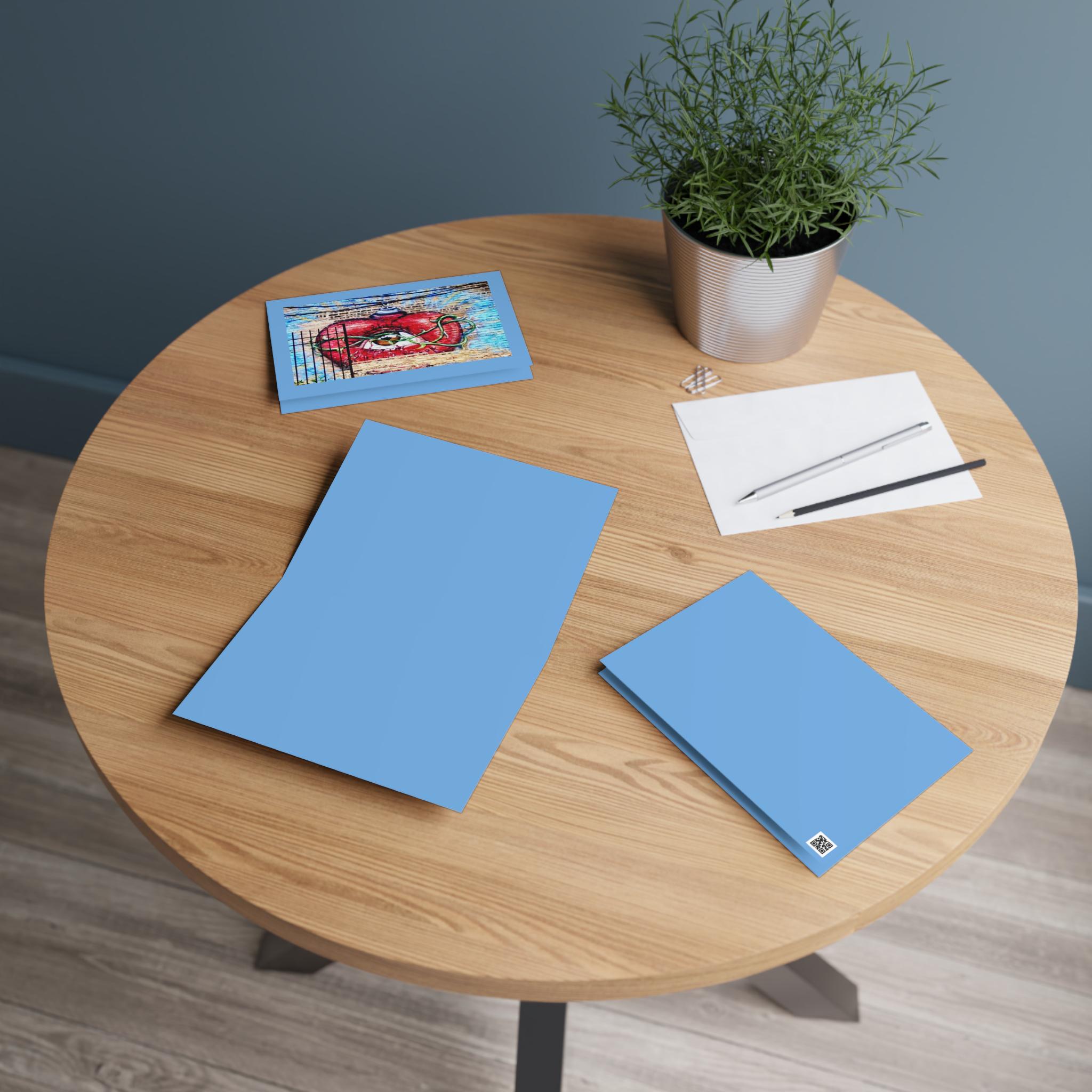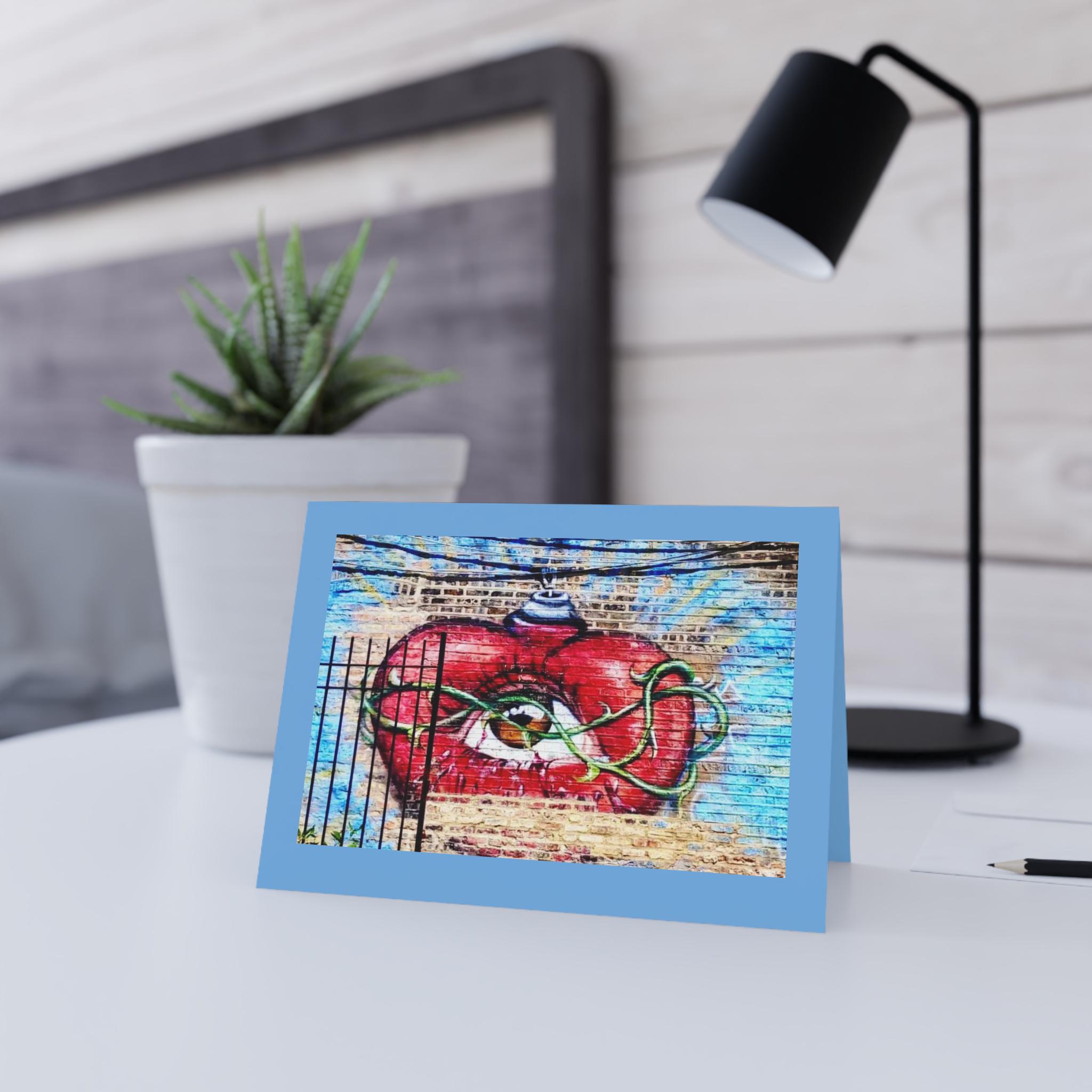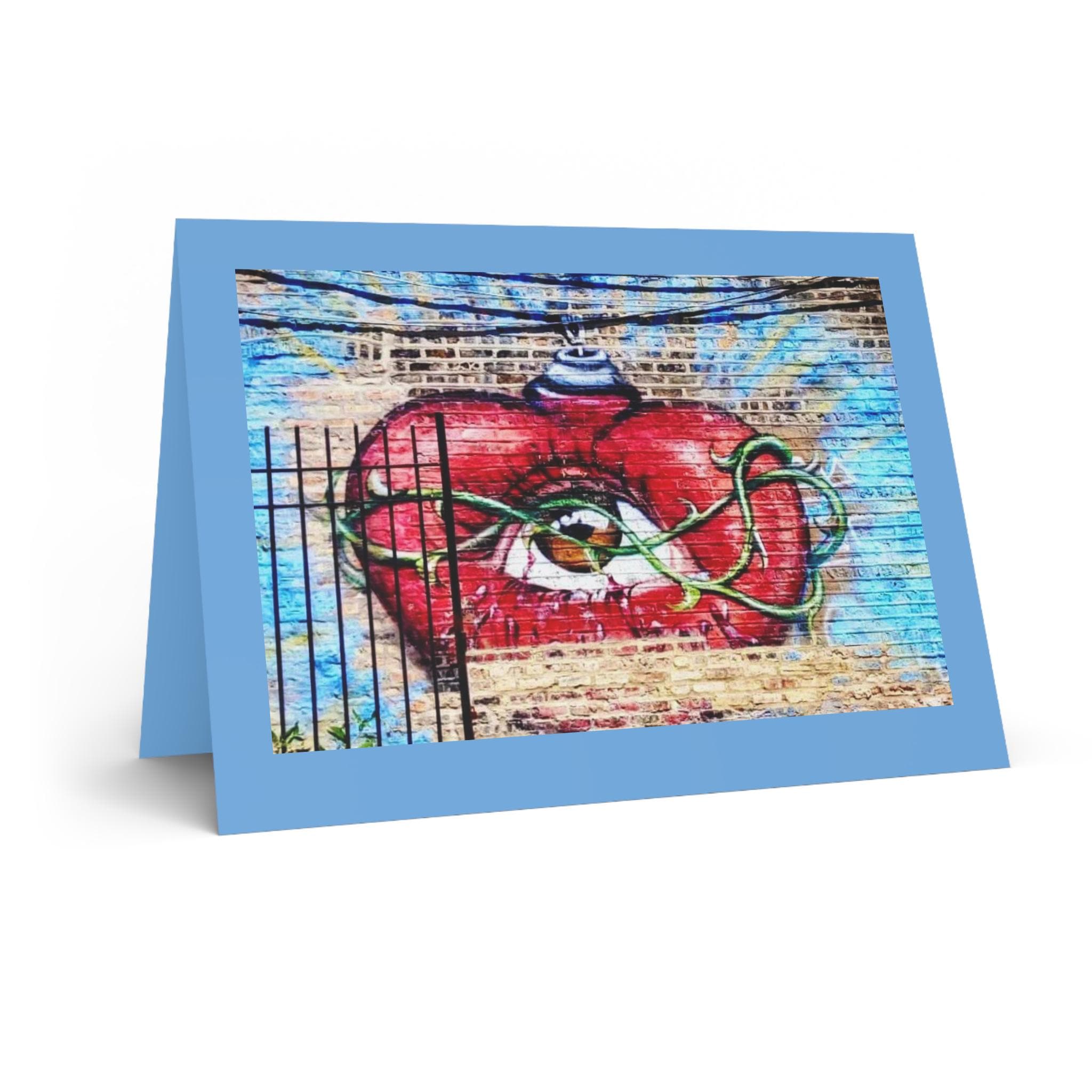 Greeting Card, Spray Can Heart, wall mural, graffiti. A striking, imaginative greeting card featuring a bold red heart with an all‑seeing eye at its center, wrapped in flowing green vines and topped with a whimsical blue‑striped ornament. The artwork blends surrealism and symbolism, creating a piece that feels both emotional and otherworldly. Set against a textured background of warm beige and cool blue tones, the design has a hand‑painted, gallery‑worthy feel.
