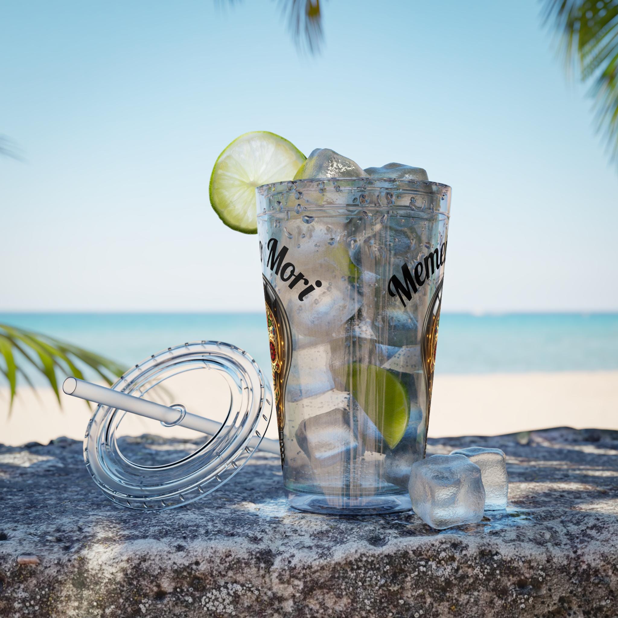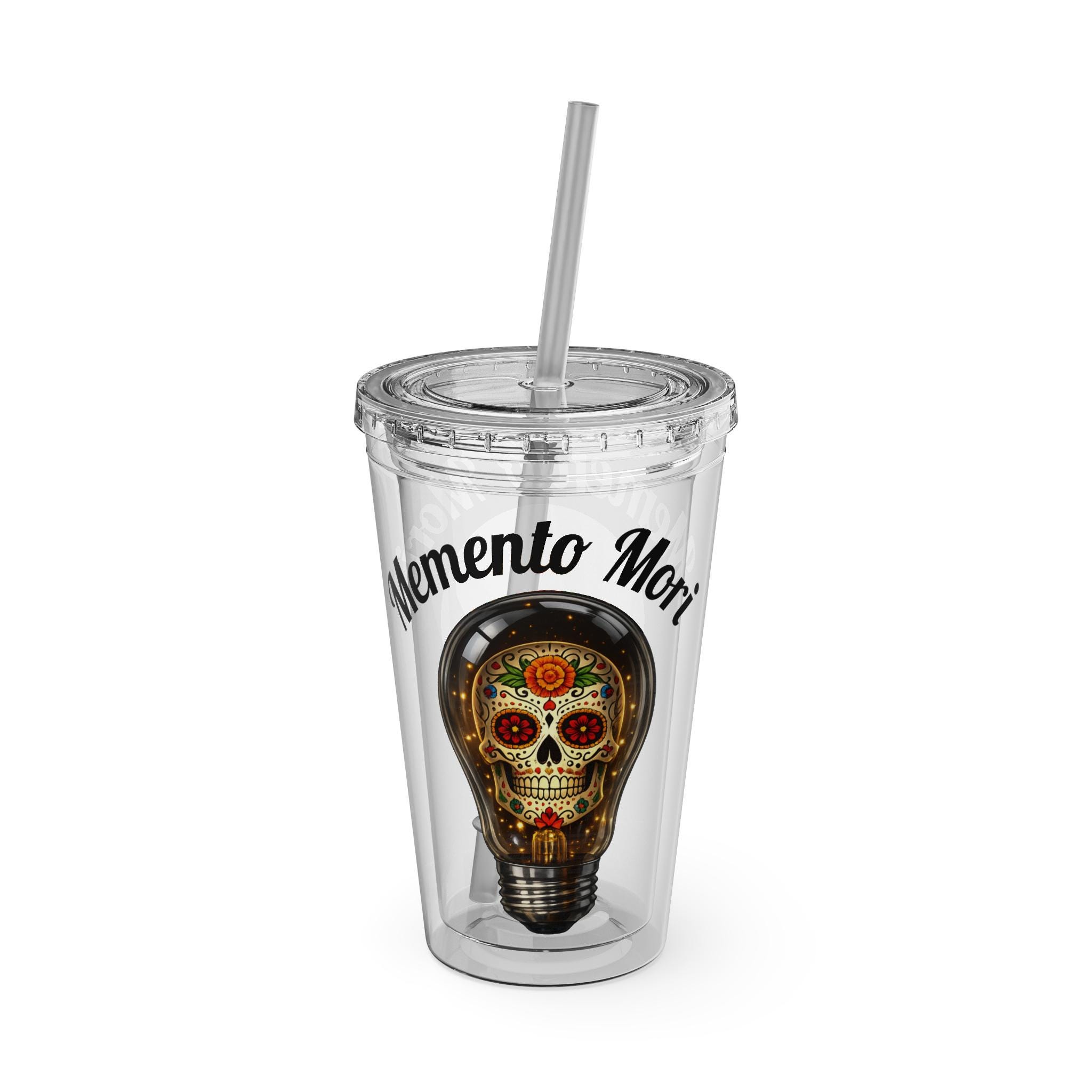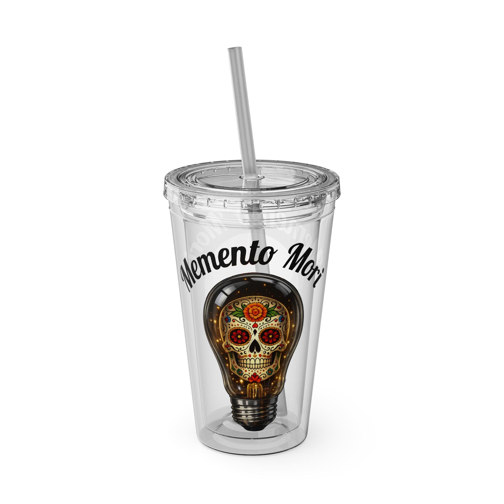 The light bulb represents the brilliance of the mind/soul, while the sugar skull represents honoring that life once the light has faded. slowly and carry a little reminder of life’s bright fragility. This clear 16oz acrylic tumbler layers a colorful sugar-skull lightbulb motif with the phrase “Memento Mori,” turning every cold sip into a playful, thoughtful moment. The double-wall design keeps condensation away and preserves beverage temperature, while the color-matched lid and crack-resistant straw add a splash of personality from eleven accent choices. Lightweight and shatter-resistant, it’s easy to grab on mornings, toate to late-night creative sessions, or to tuck into a bag for an urban wander. Hand-wash care keeps the vibrant print vivid wash after wash.