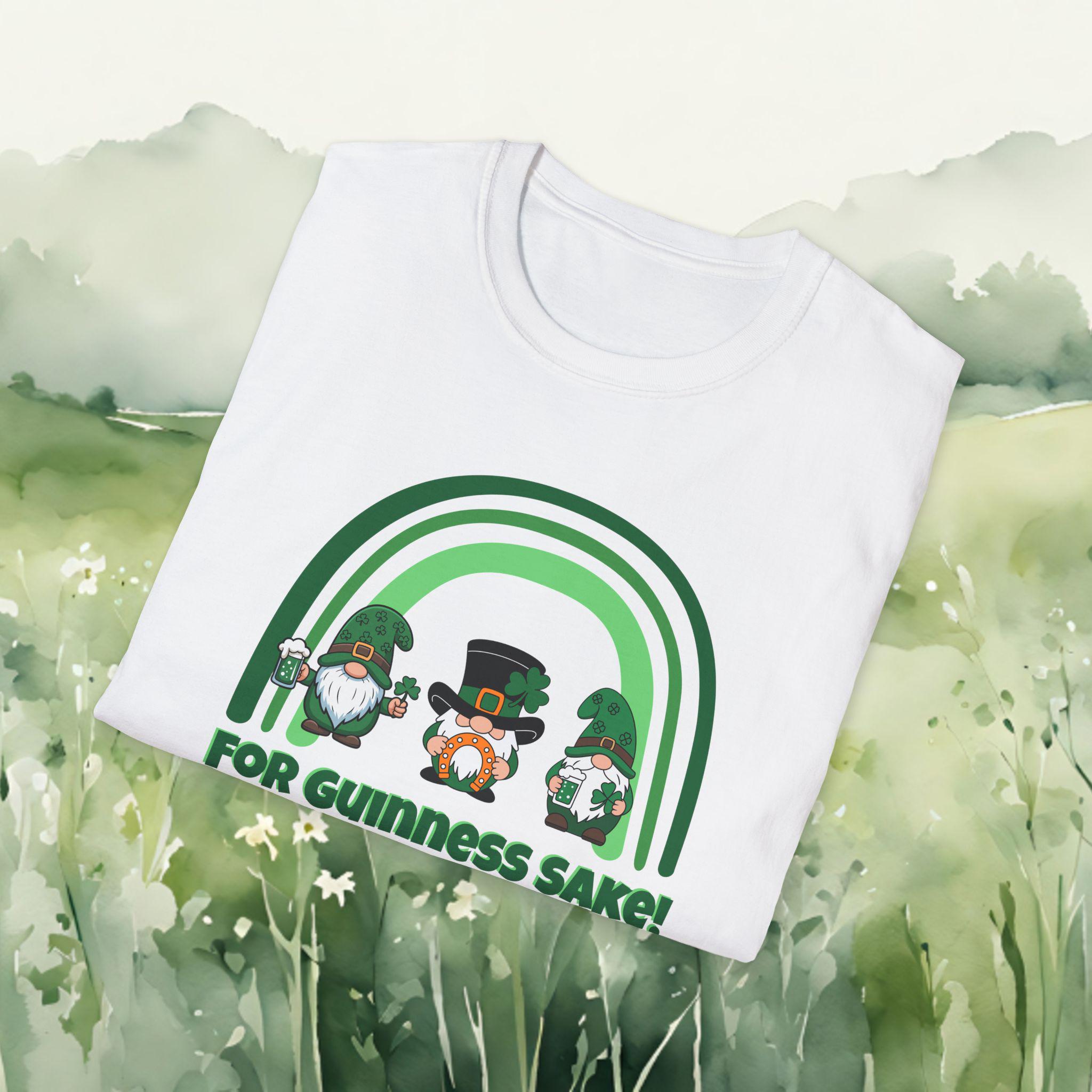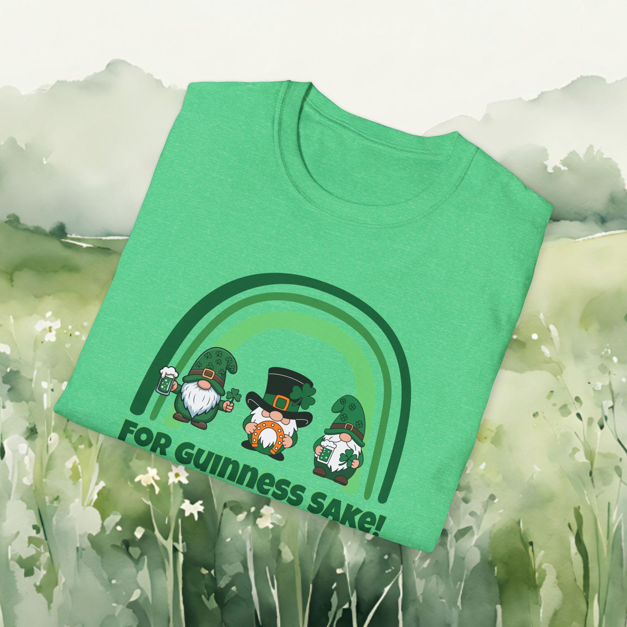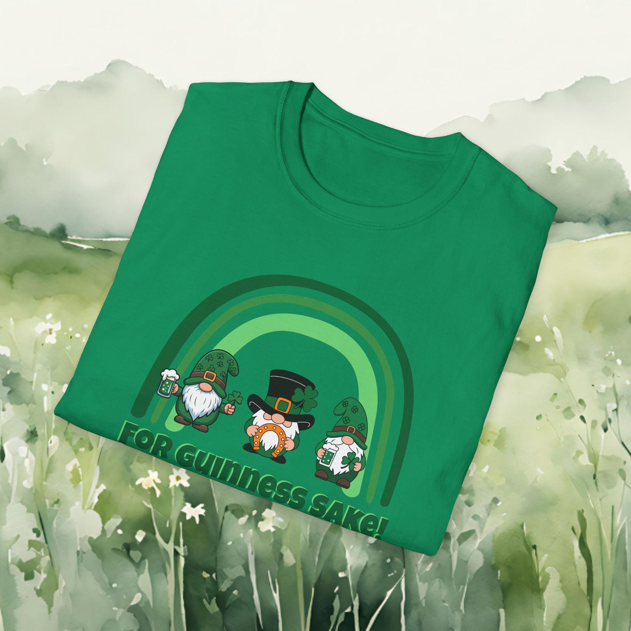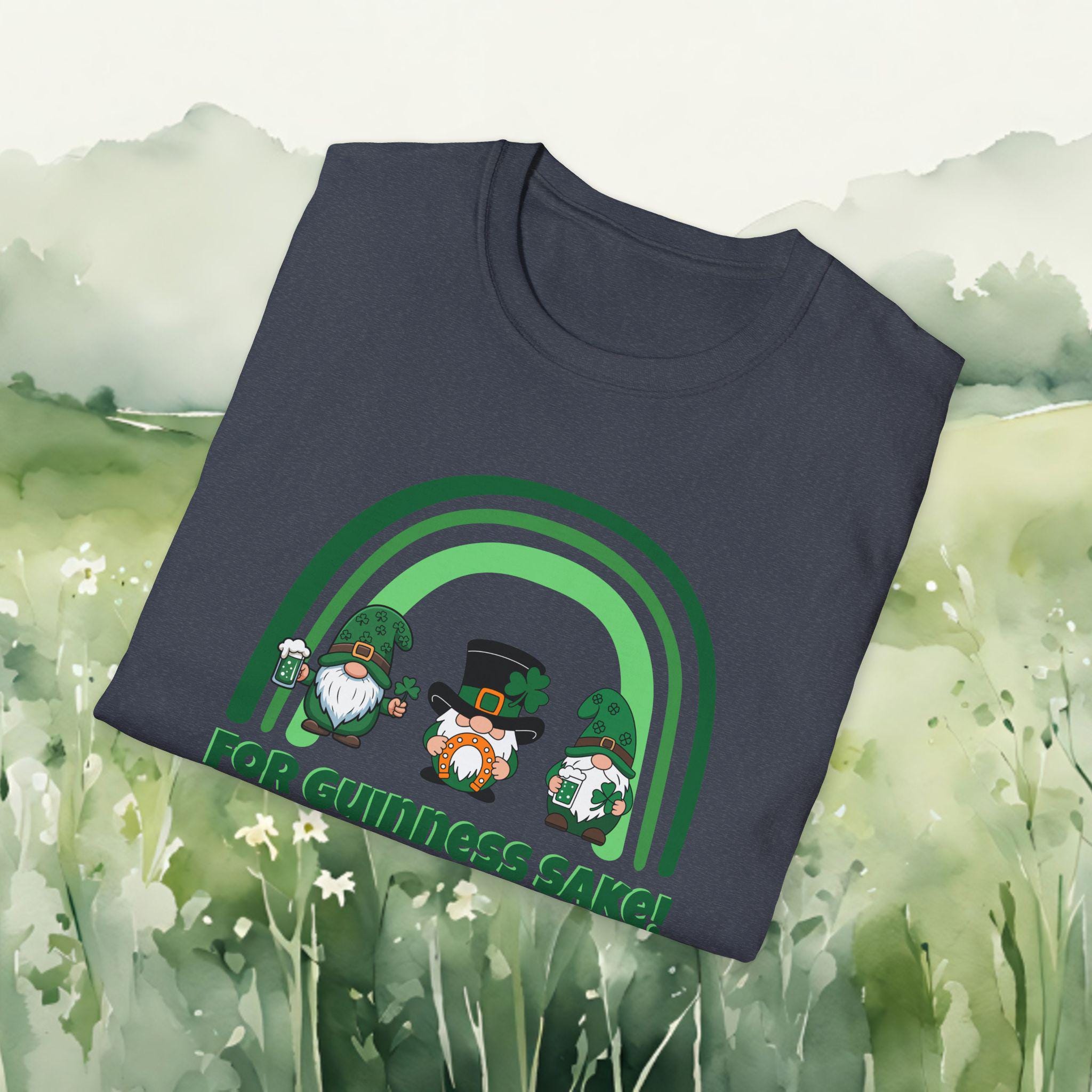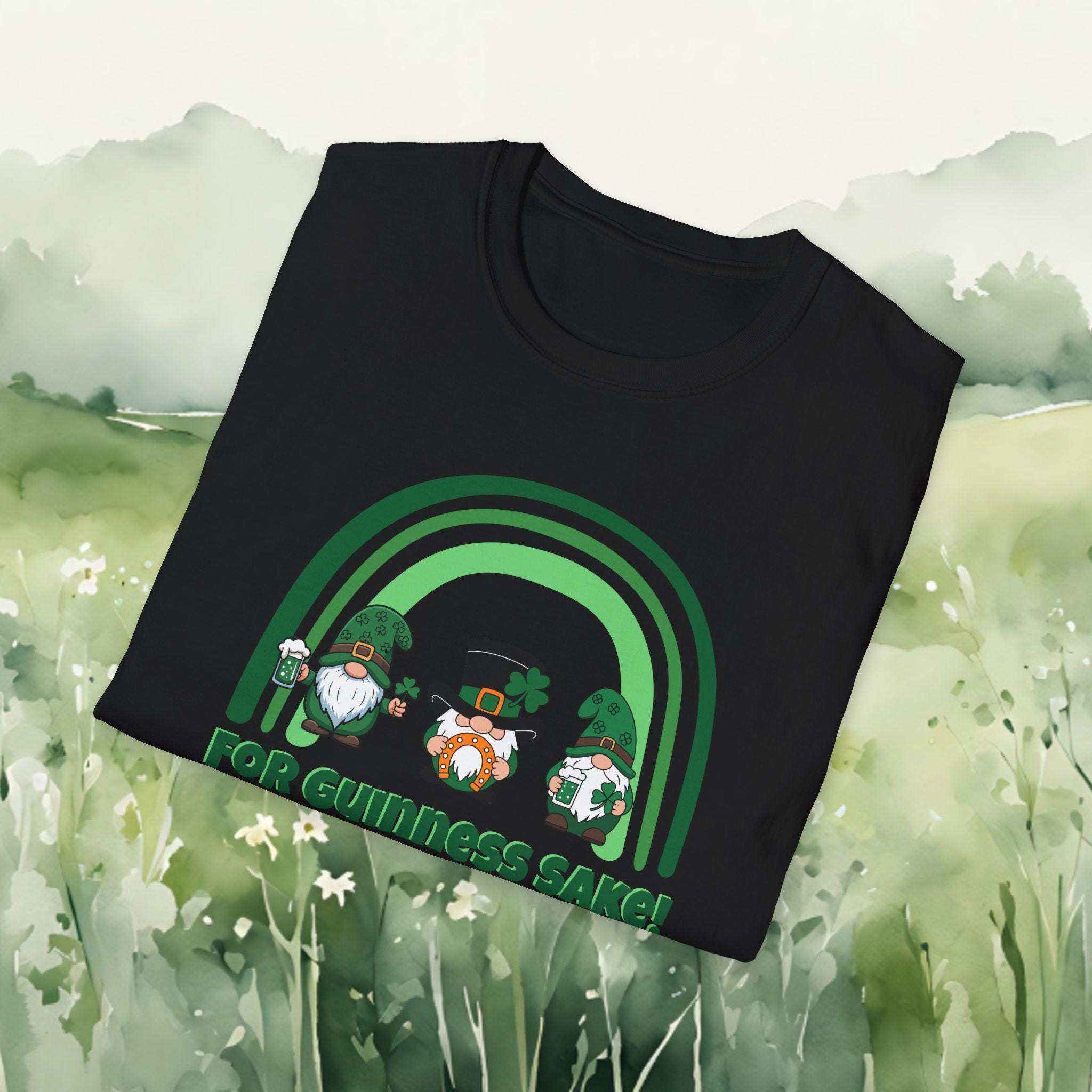 A soft, everyday tee that brings a cheeky slice of Irish pub humor into your wardrobe. Lightweight ring-spun cotton feels comfortable all day while the bright, playful graphic — a row of shamrock-clad characters beneath a retro green rainbow with the phrase “FOR GUINNESS SAKE!” — adds instant personality. Wear it to casual gatherings, St. Patrick’s Day outings, or low-key weekends at the local bar. The classic crewneck and relaxed cut layer easily under a jacket or stand alone as the shirt you reach for when you want to be comfortable and a little mischievous. Ethically sourced cotton and a smooth print surface keep the design crisp wash after wash, so the joke keeps looking fresh.