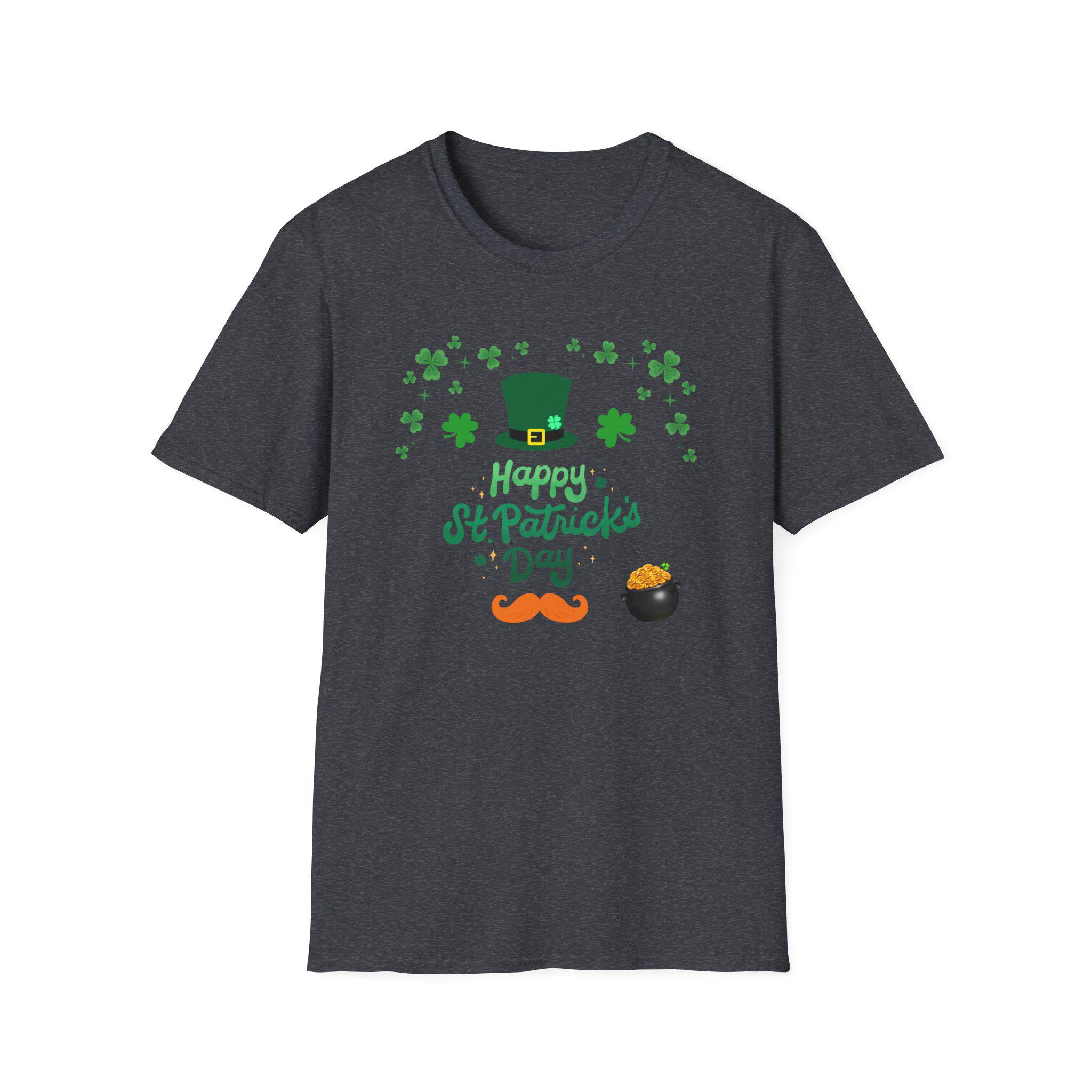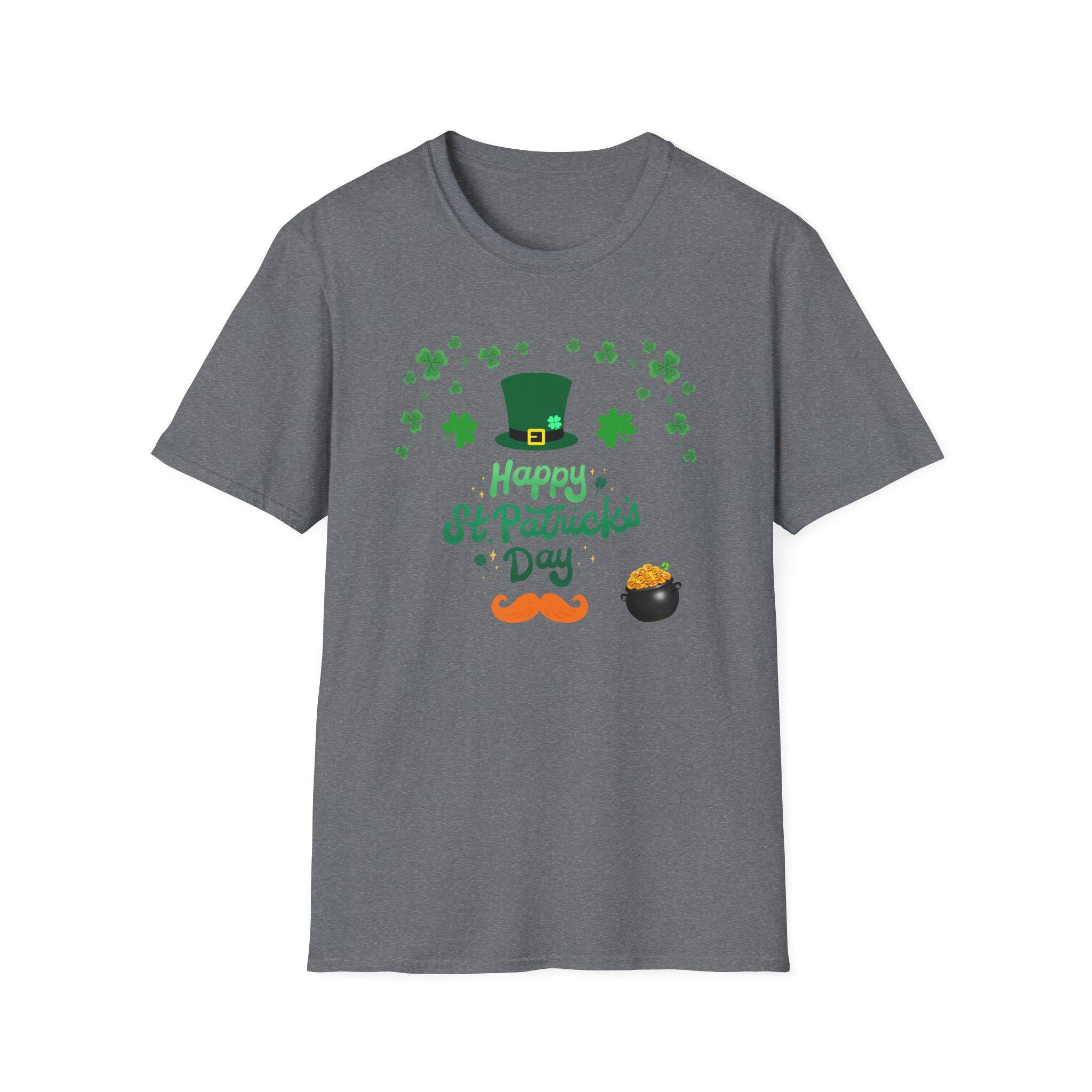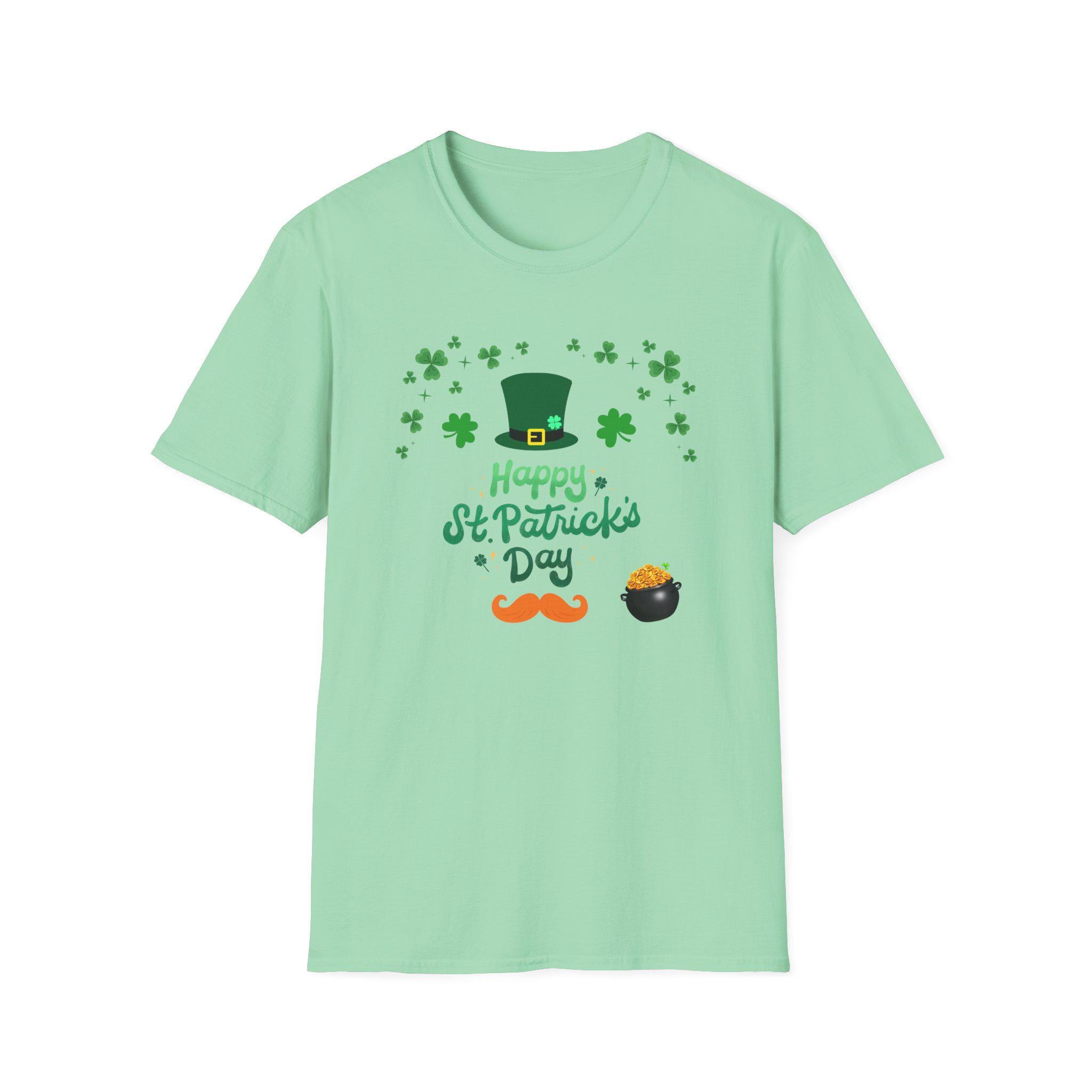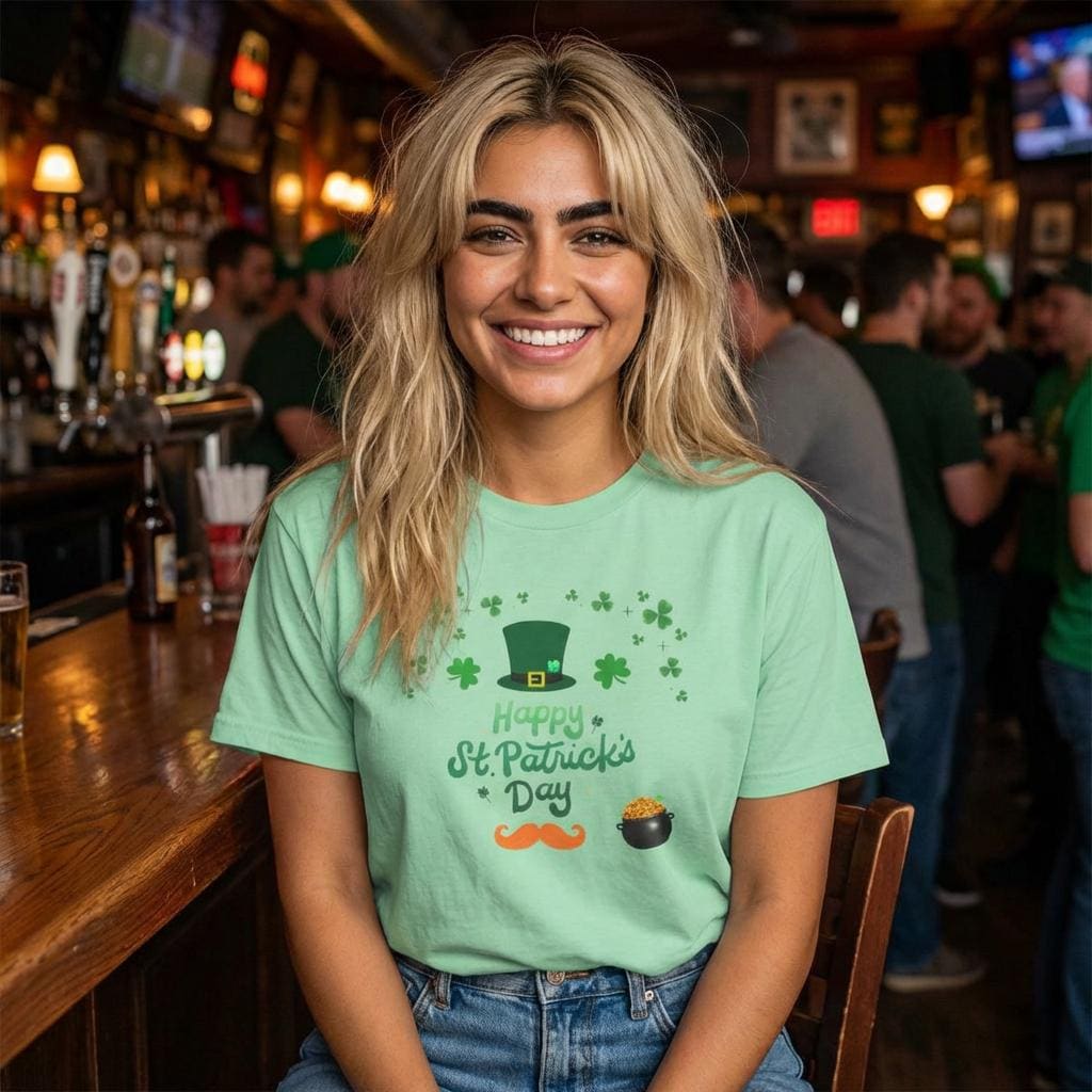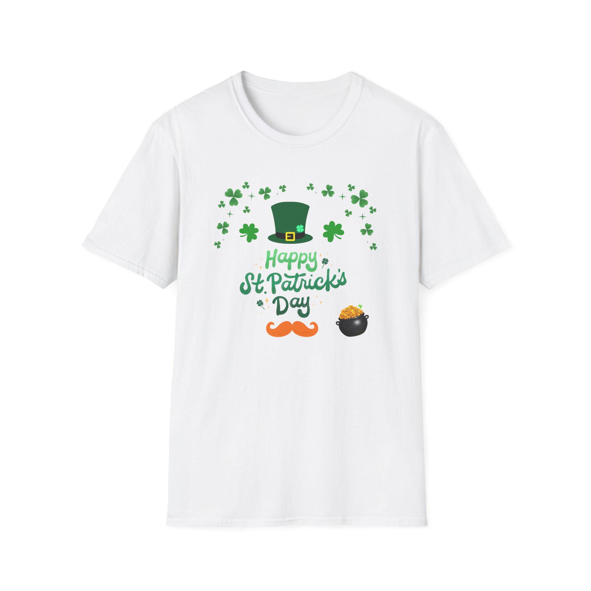 Celebrate St. Patrick’s Day with a lightweight, breathable tee that feels like a comfortable layer of good cheer. This softstyle cotton shirt carries a cheerful St. Patrick’s design — a jaunty leprechaun hat, scattered shamrocks, a playful mustache and a tiny pot of gold — printed cleanly on the front. It sits easy on the shoulders and moves with you, whether you’re joining friends for a parade, grabbing a pint, or keeping things festive at home. The crew neckline and classic fit keep the look simple and approachable, while the smooth fabric keeps the colors crisp and the print comfortable against skin. Thoughtful construction details — shoulder tape, ribbed collar, tear-away label — mean the shirt keeps its shape and feels great all day. This tee pairs naturally with denim or layered under a flannel for cooler evenings during St. Patrick’s gatherings.