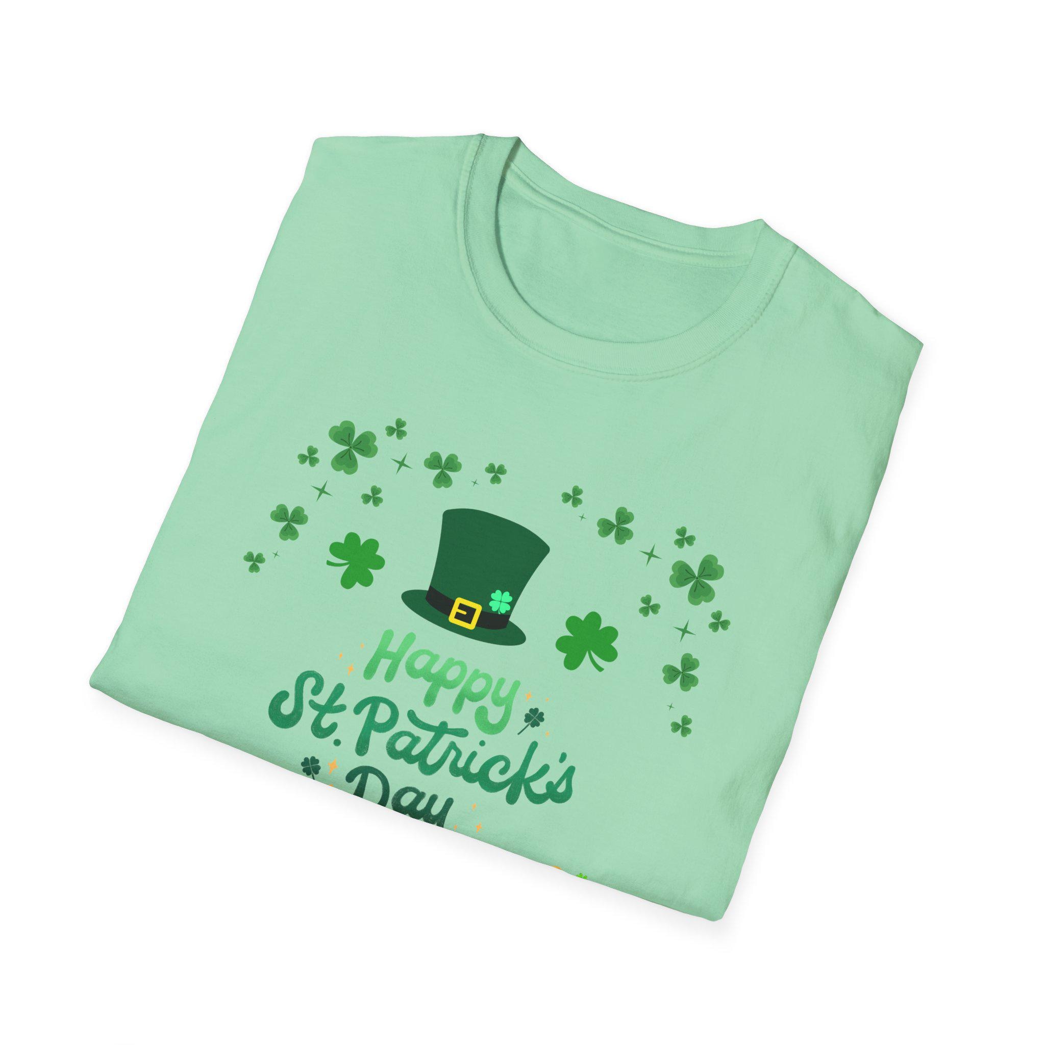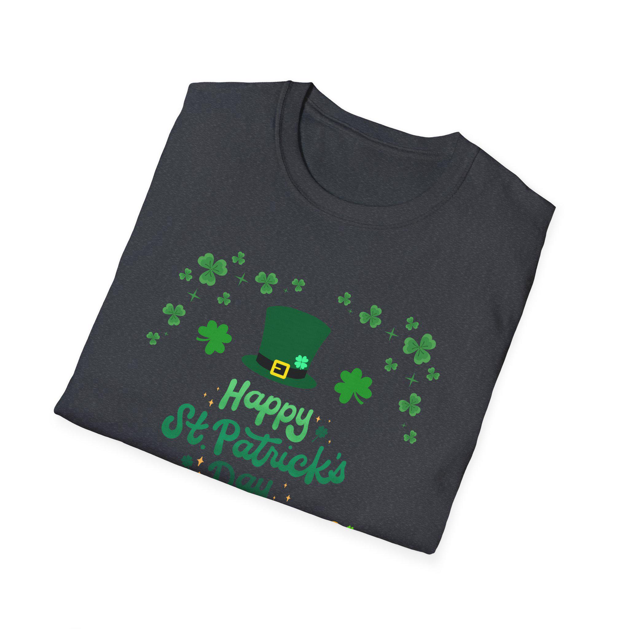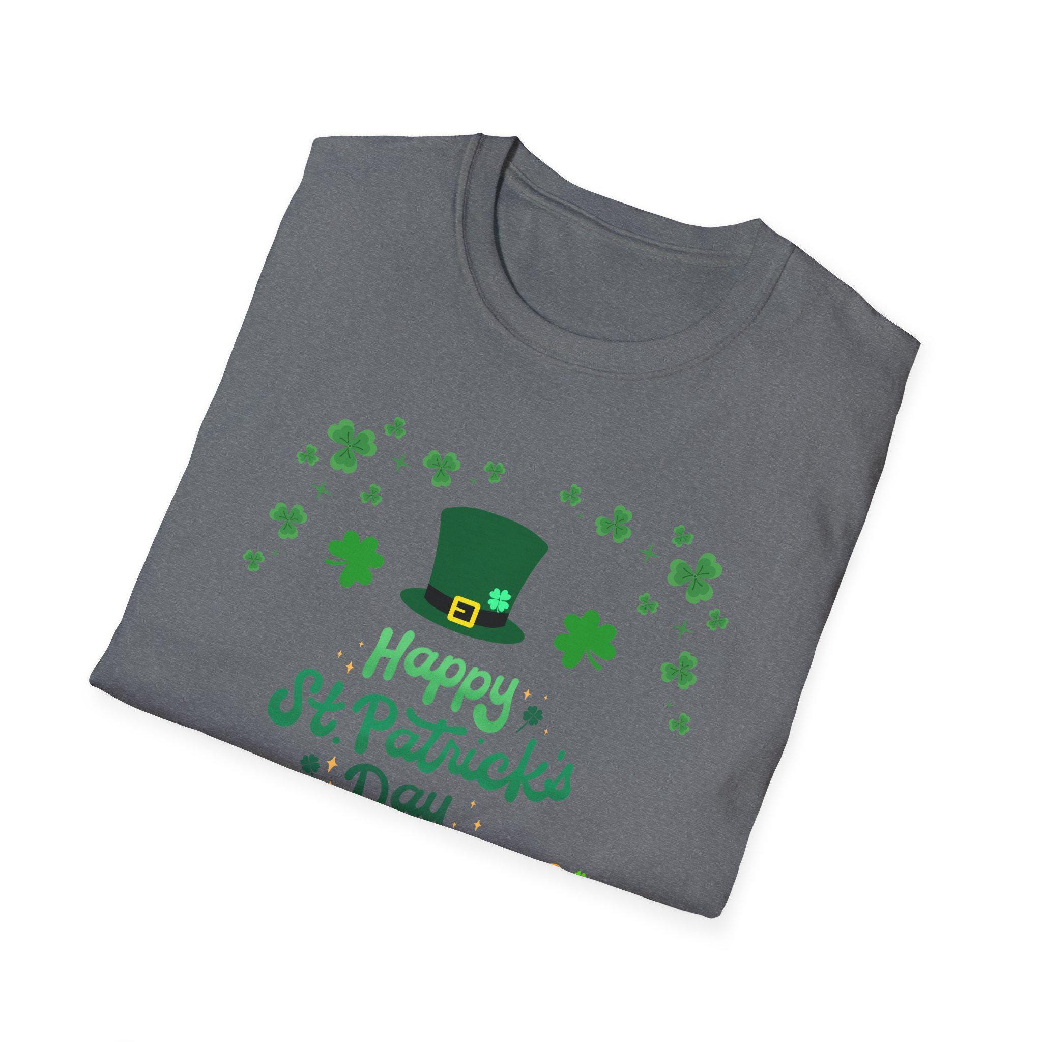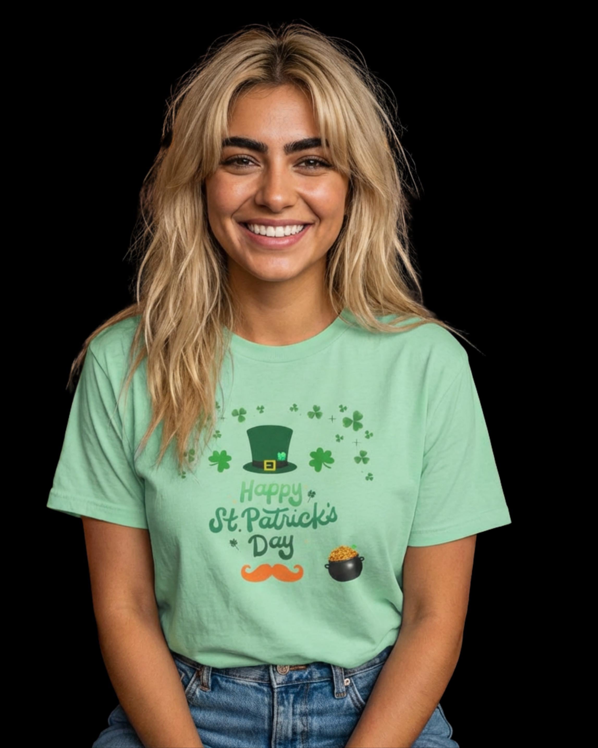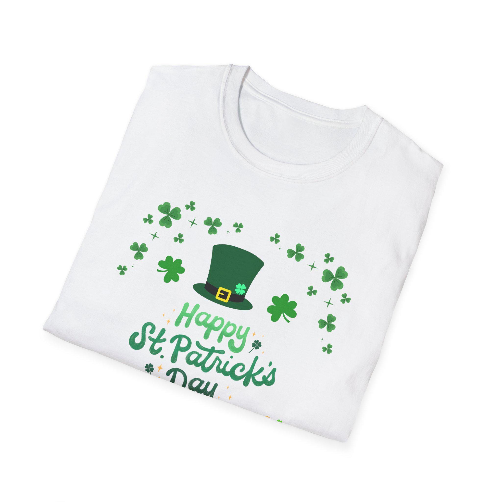 Celebrate St. Patrick’s Day with a lightweight, breathable tee that feels like a comfortable layer of good cheer. This softstyle cotton shirt carries a cheerful St. Patrick’s design — a jaunty leprechaun hat, scattered shamrocks, a playful mustache and a tiny pot of gold — printed cleanly on the front. It sits easy on the shoulders and moves with you, whether you’re joining friends for a parade, grabbing a pint, or keeping things festive at home. The crew neckline and classic fit keep the look simple and approachable, while the smooth fabric keeps the colors crisp and the print comfortable against skin. Thoughtful construction details — shoulder tape, ribbed collar, tear-away label — mean the shirt keeps its shape and feels great all day. This tee pairs naturally with denim or layered under a flannel for cooler evenings during St. Patrick’s gatherings.