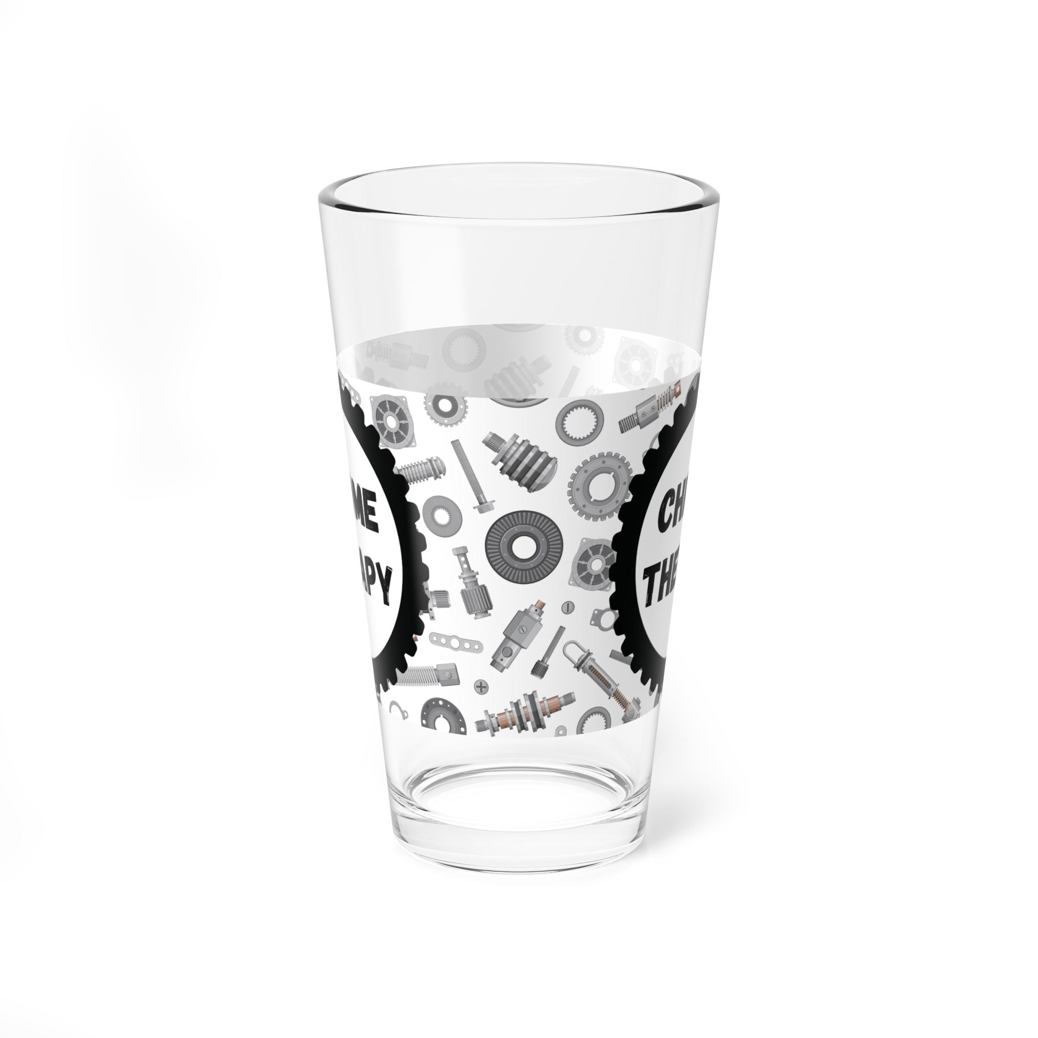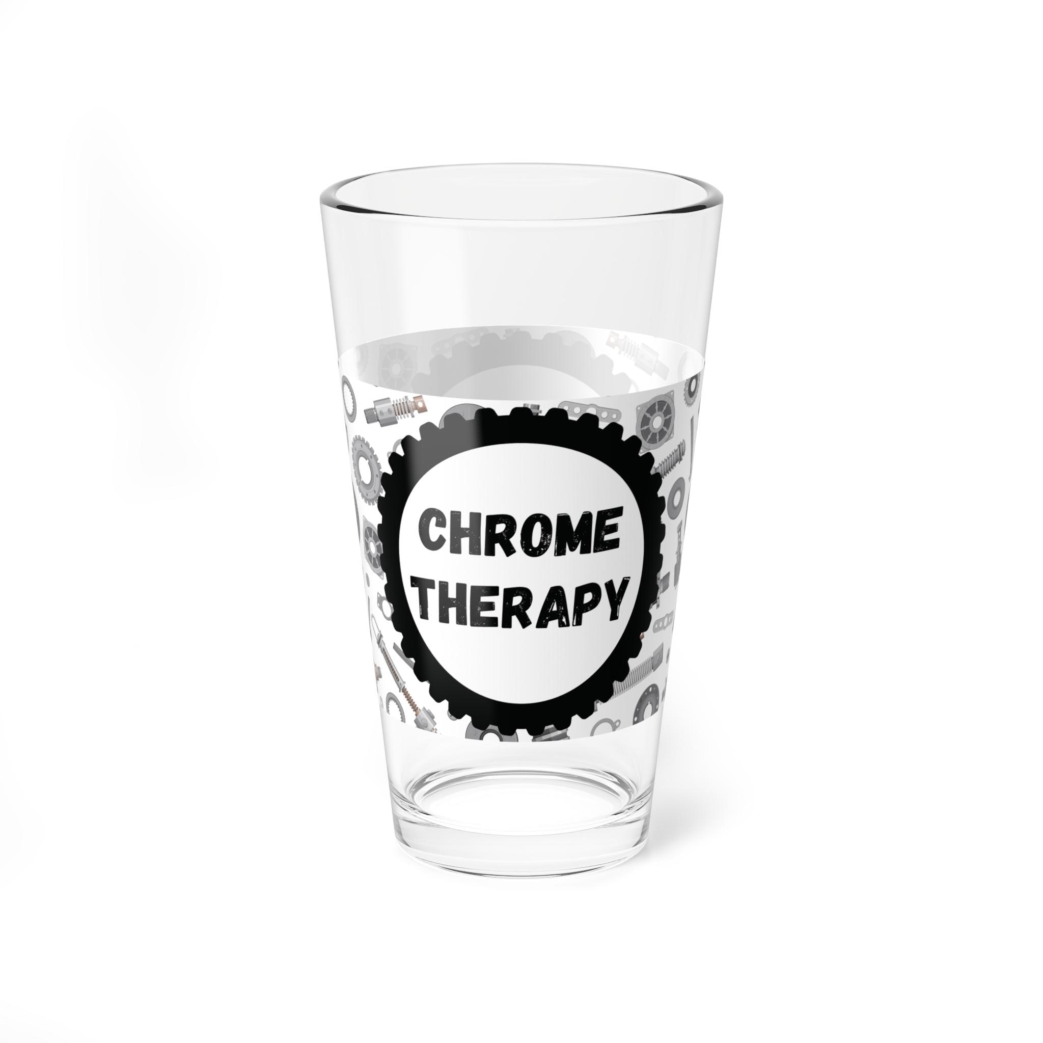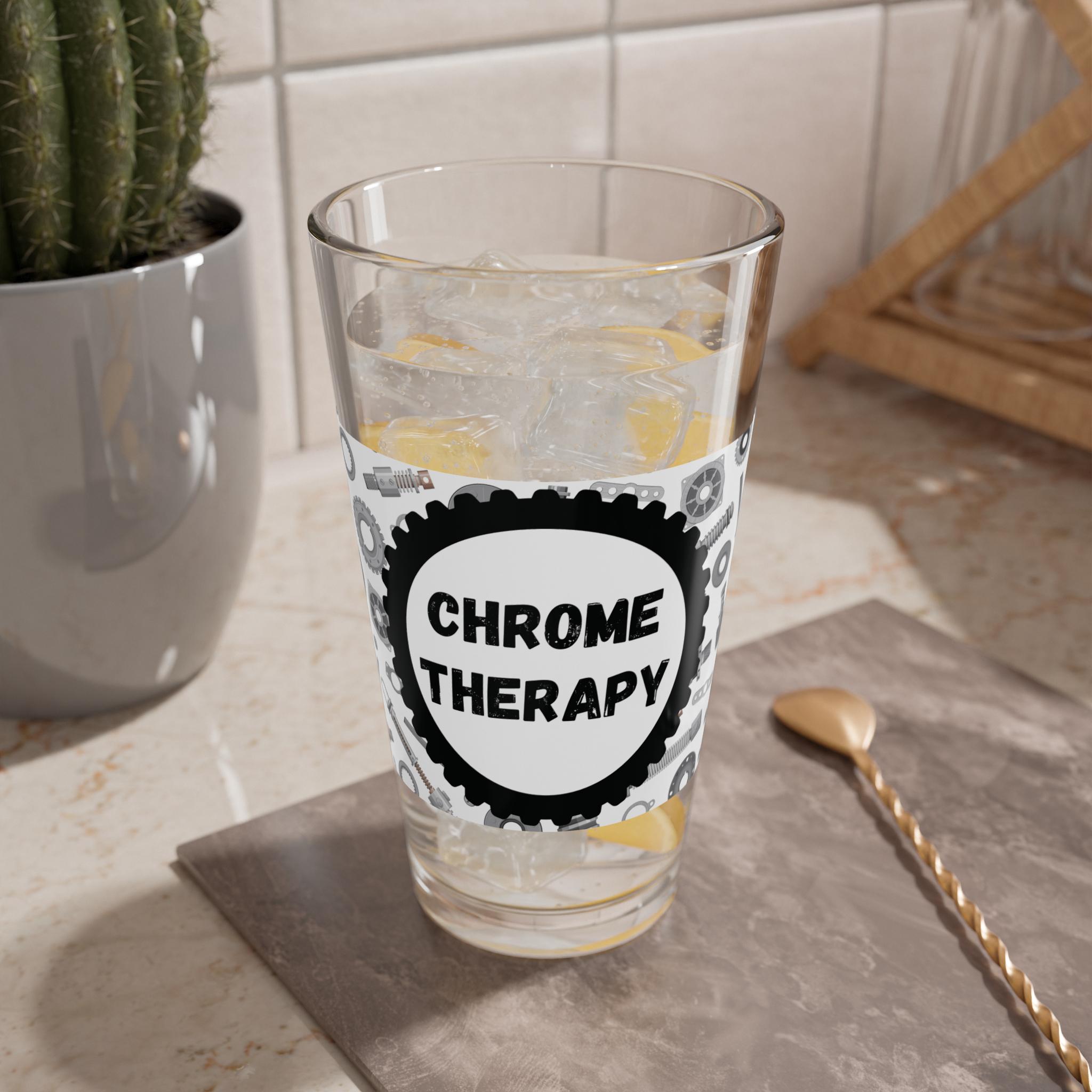 This 16oz mixing glass brings workshop charm to your home bar. Clear, heavy-base glass holds cocktails or a simple pour while the bold “CHROME THERAPY” emblem and tiny motor-themed icons wrap the surface like a mechanic’s patch. It feels tactile and grounded — the solid base keeps the glass steady while you stir, and the vivid print stays bright through regular use and the dishwasher. Use it when you’re winding down after a day in the garage, hosting a small get-together with fellow gearheads, or mixing a cold drink while flipping through a repair manual. The design speaks to those who find calm in wrenches, gears, and the hum of an engine — a little ritual of focus and enjoyment.