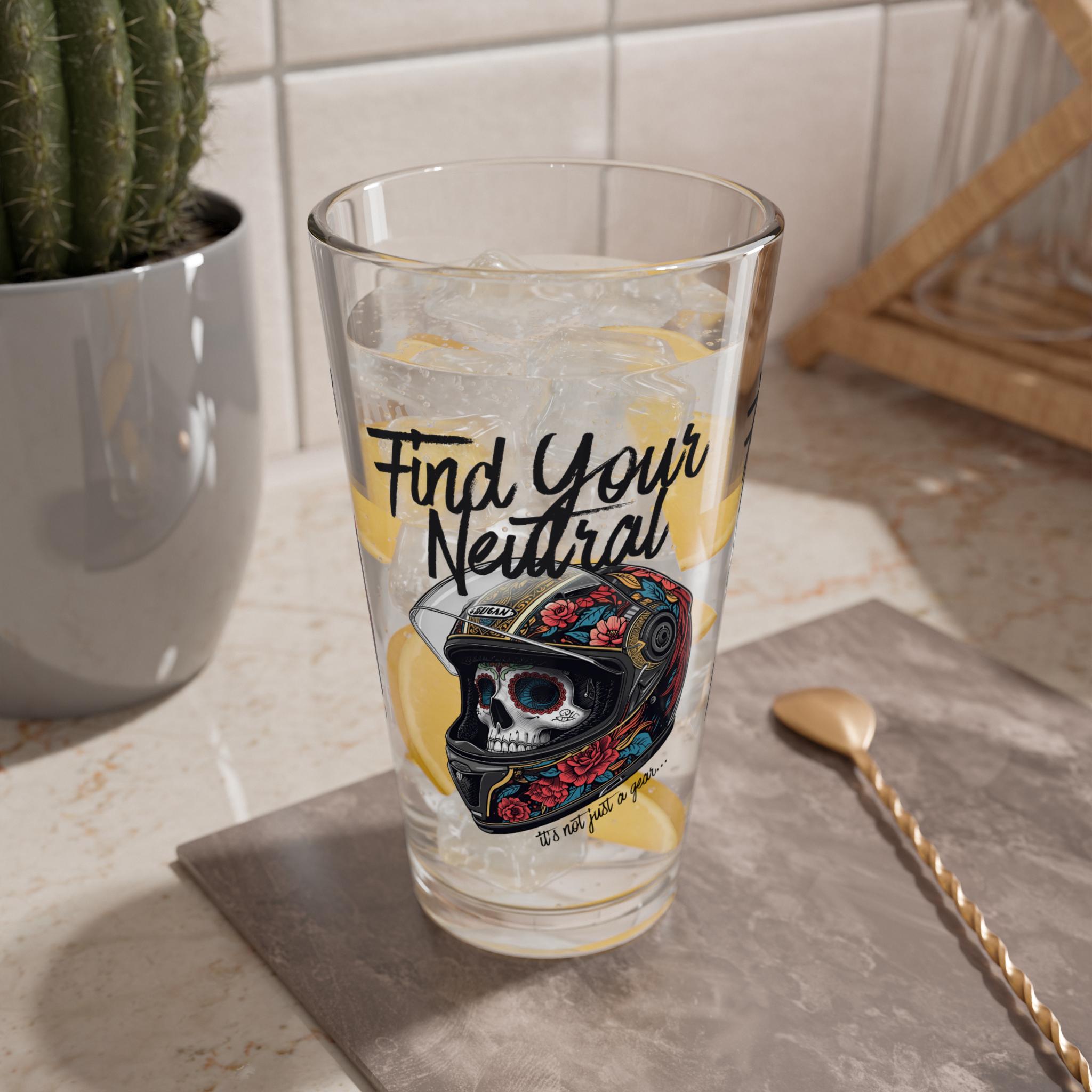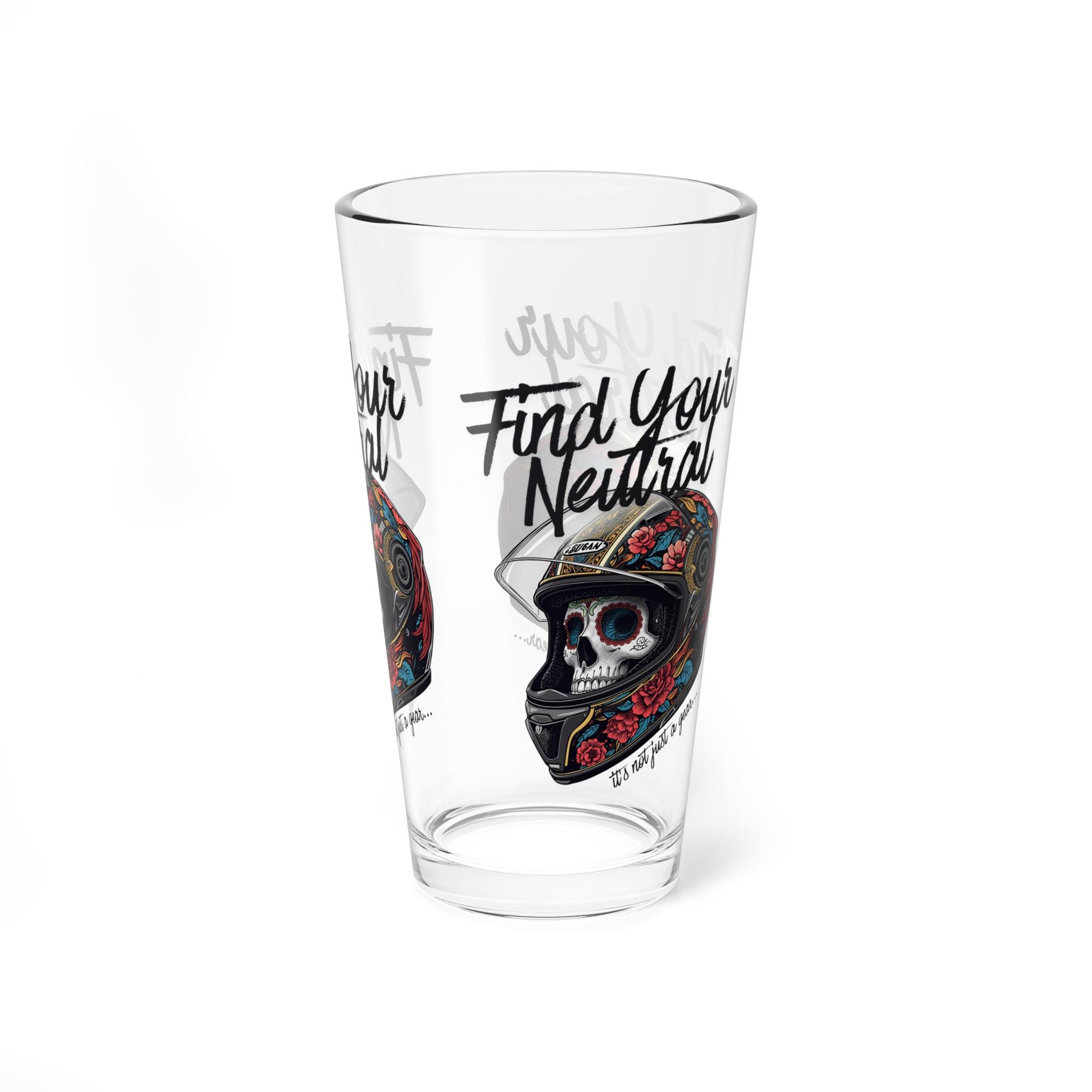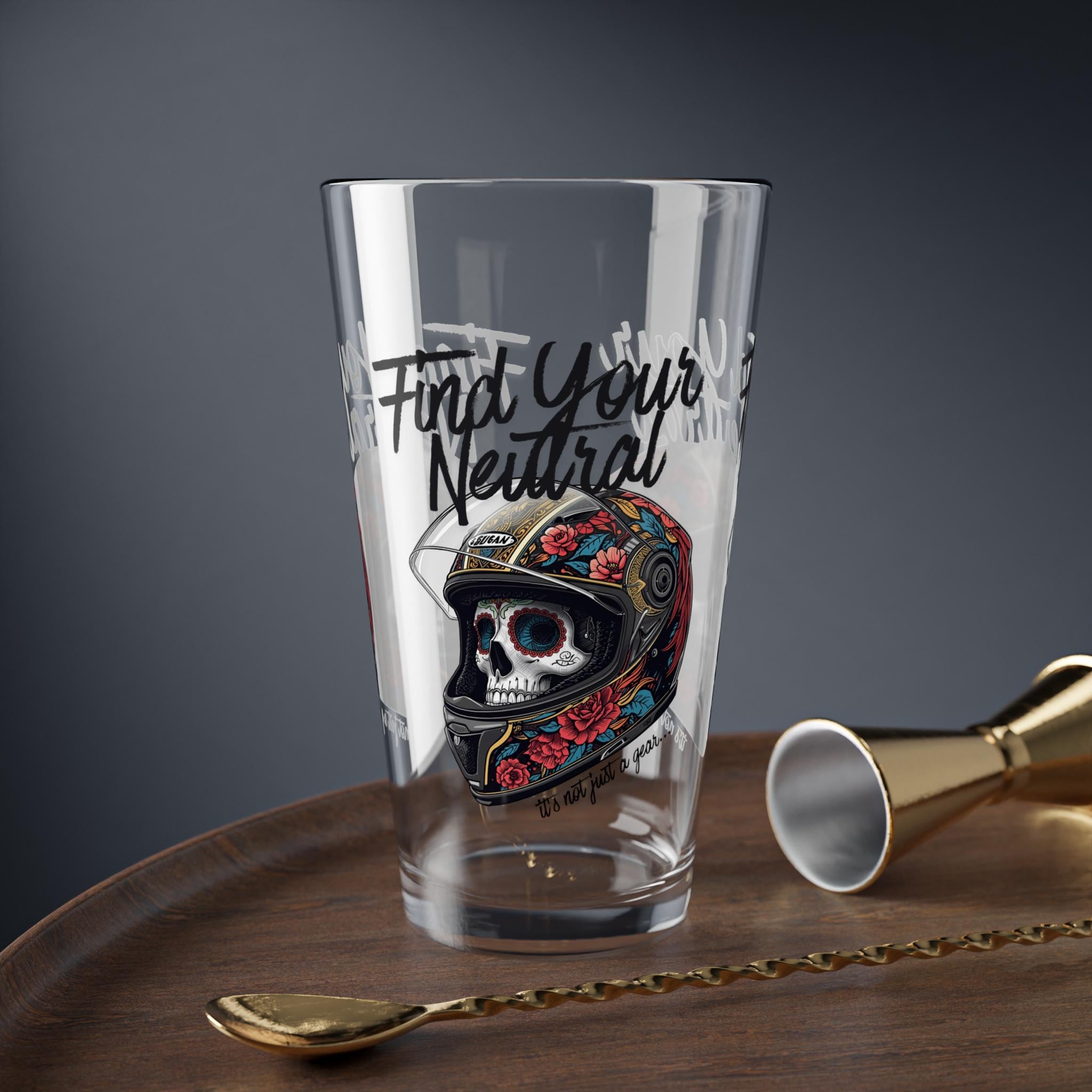 This 16oz mixing glass brings a bold, slightly dark edge to your home bar. Clear, sturdy glass with a heavy base feels grounded in your hand while the crisp black skull artwork and “Find Your Neutral” message sit slightly askew — a subtle reminder to steady your pour and your mood. Use it when you’re building stirred cocktails, measuring spirits, or simply sipping something chilled. The vibrant print stays sharp through everyday use and the dishwasher, so this glass keeps its attitude while staying low-maintenance. It’s for those who like their drinks balanced and their style a little wicked.