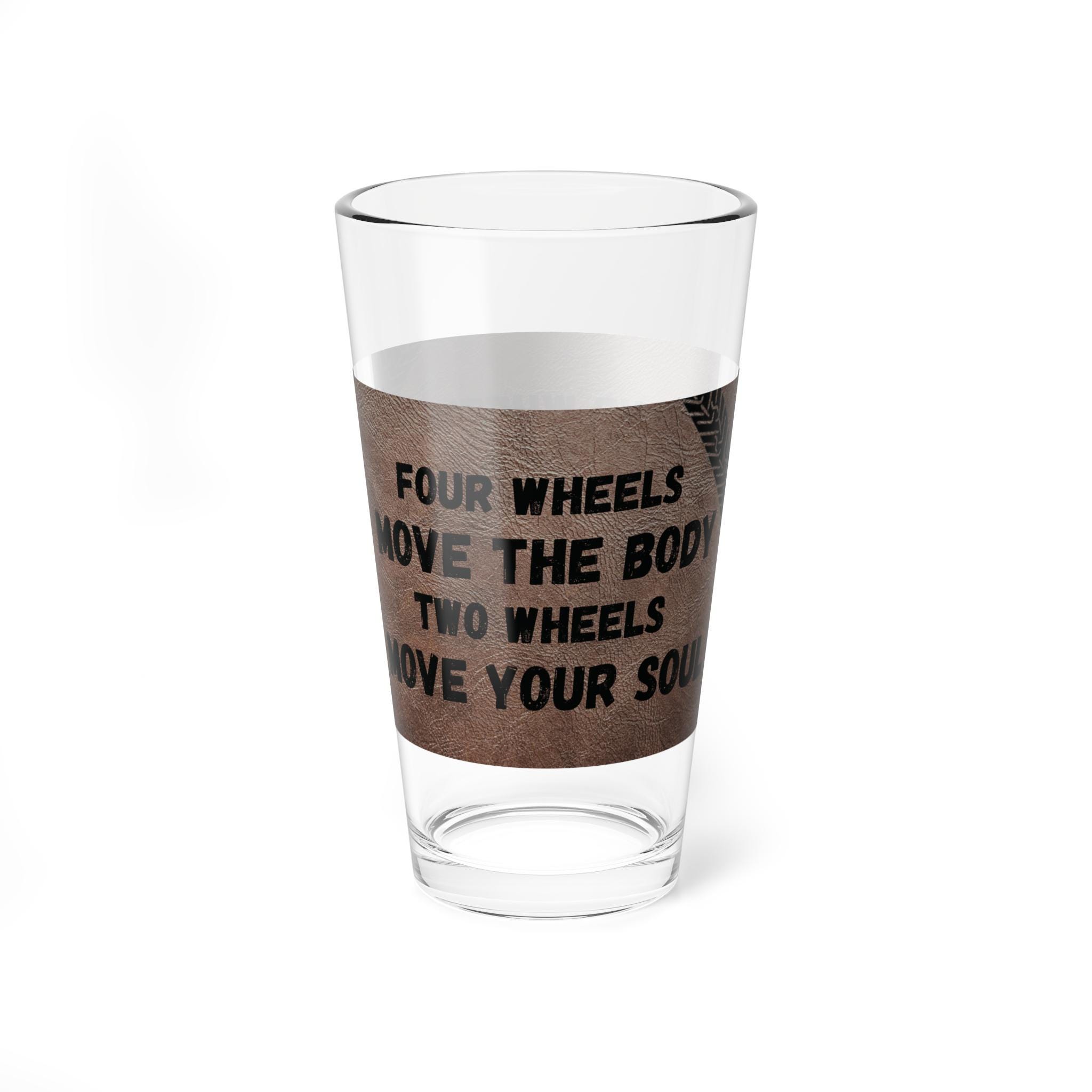 This 16oz mixing glass brings down-to-earth style to your home bar. The clear, sturdy glass showcases a rustic wrap design with bold, rubbed-lettering—an honest nod to motorcycle culture and the freedom of two wheels. It’s heavy at the base so it sits solid while you stir, and the wide mouth makes it practical both for shaking up a whiskey-based cocktail and for everyday sipping. The print stays bright through repeated dishwasher cycles, so the glass keeps its character night after night.