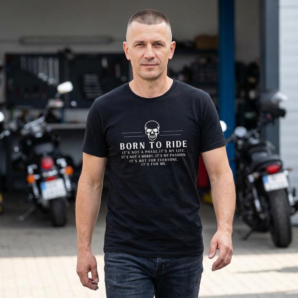 This Born to Ride tee carries the low, steady hum of a highway at dawn. The soft, lightweight cotton sits close without clinging, the graphic announcing a life spent leaning into curves and chasing open miles. Wear it under a leather jacket or alone at a pit stop — it settles in like an old riding partner. Riders will recognize the shorthand of road grit and quiet confidence: no fuss, just the call of the next stretch of asphalt. Built to withstand long weekends and frequent washes, the shirt keeps its shape and the print stays sharp. Slide into it, kick the stand up, and go find the horizon.
