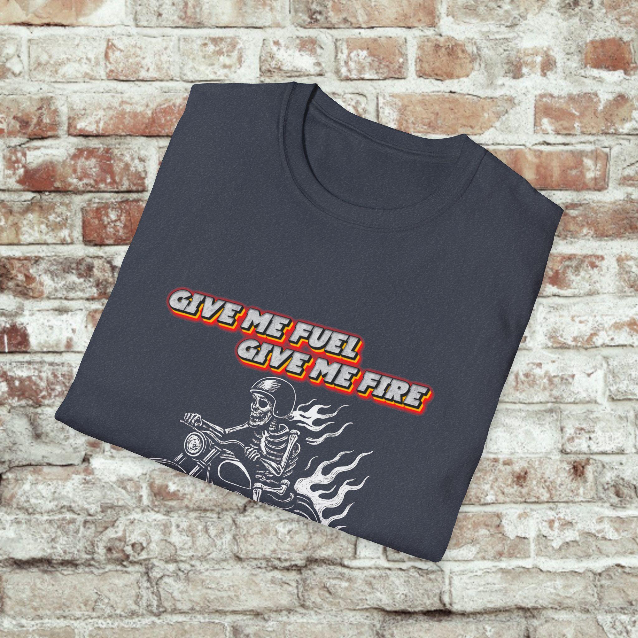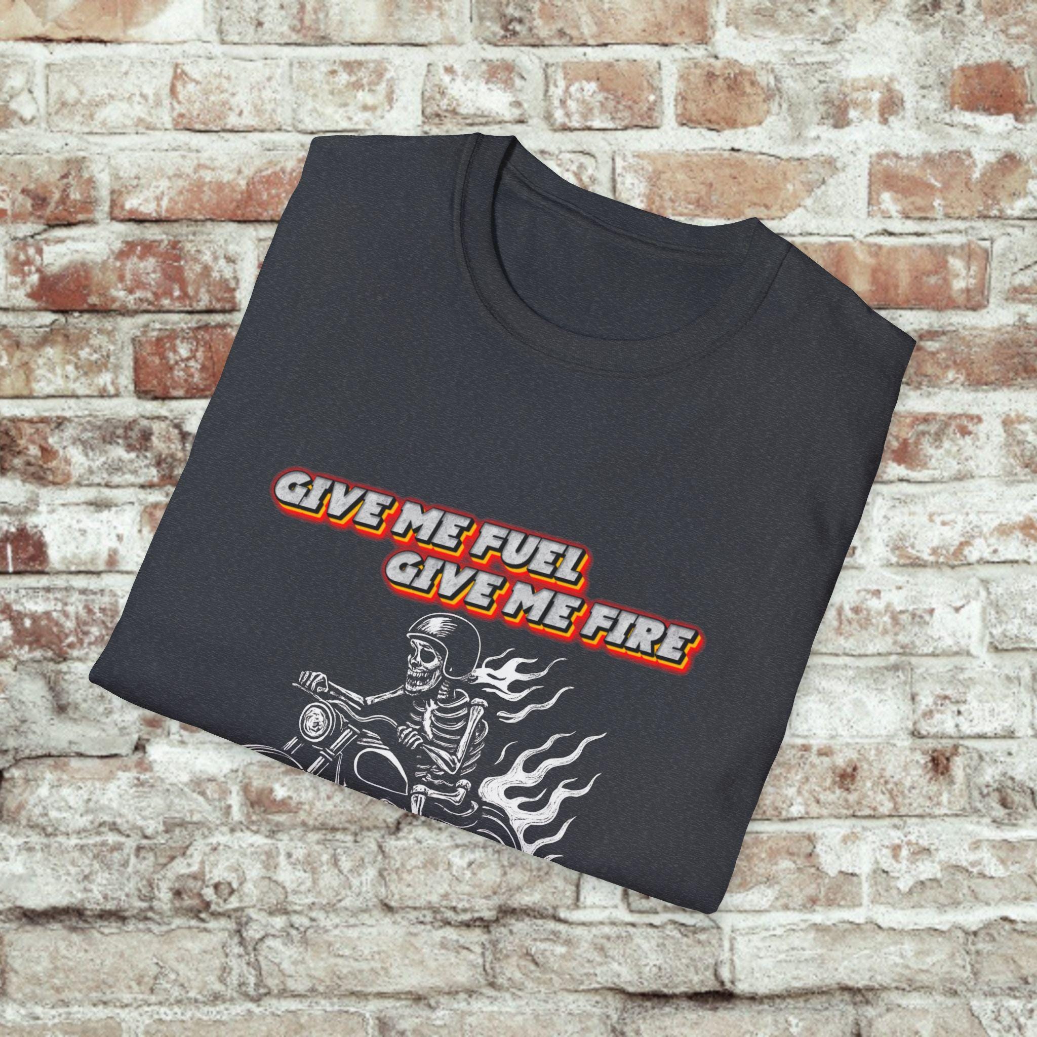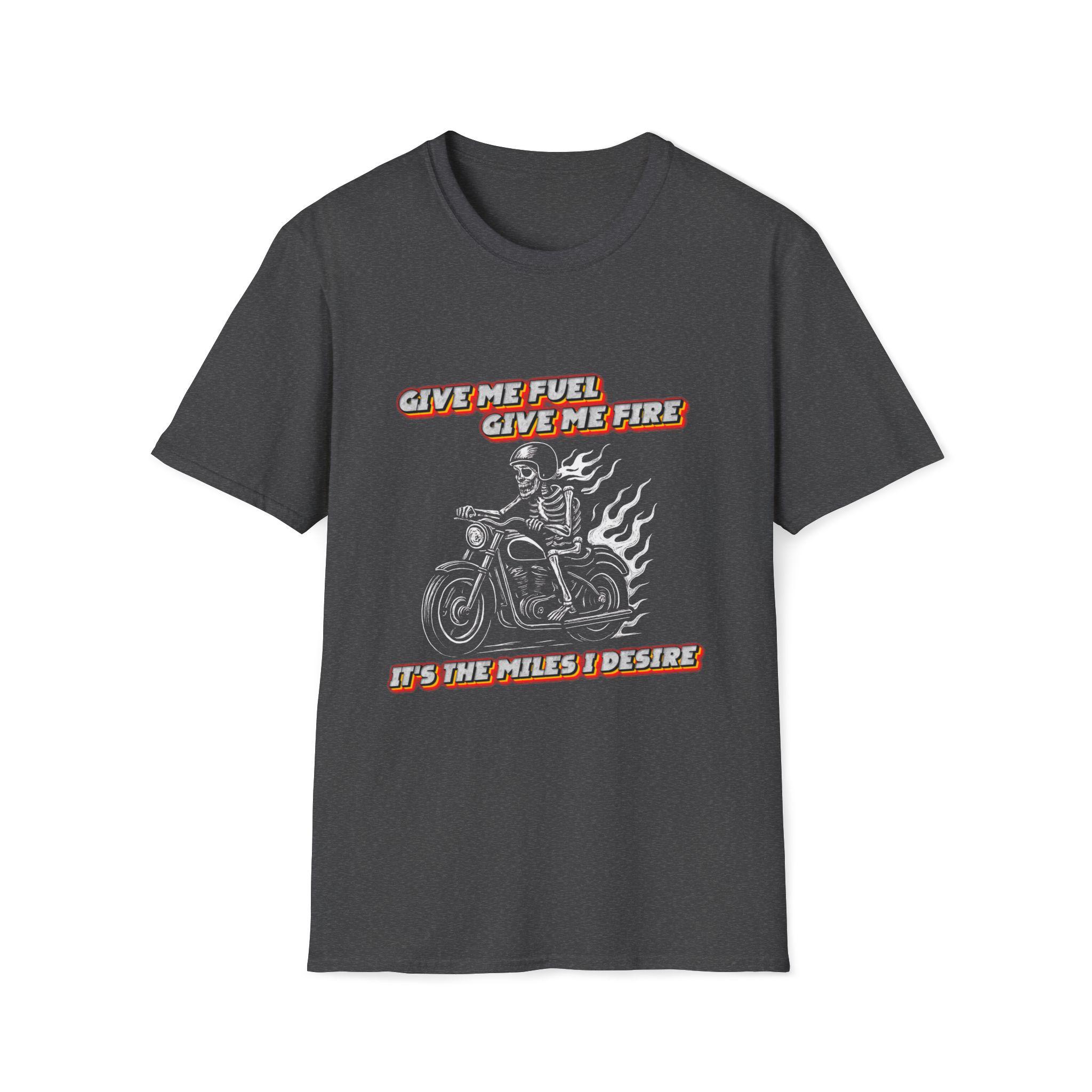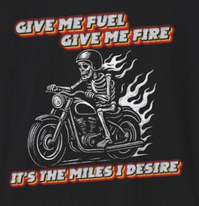 Give Me Fuel, Give Me Fire, TI’S THE MILES I DESIRE! Tee carries the low, steady hum of a highway at dawn. The soft, lightweight cotton sits close without clinging, the graphic announcing a life spent leaning into curves and chasing open miles. Wear it under a leather jacket or alone at a pit stop — it settles in like an old riding partner. Riders will recognize the shorthand of road grit and quiet confidence: no fuss, just the call of the next stretch of asphalt. Built to withstand long weekends and frequent washes, the shirt keeps its shape and the print stays sharp. Slide into it, kick the stand up, and go find the horizon.